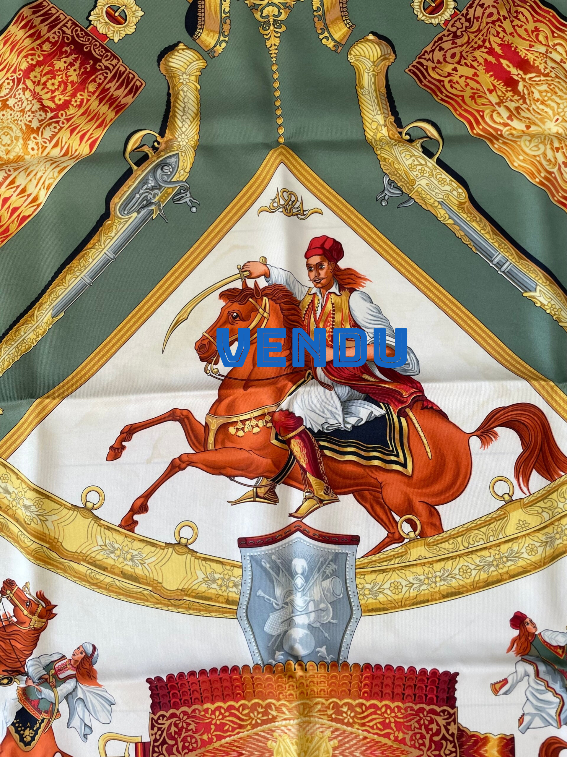 Créé par Julia Abadie en 1985 pour la maison Hermès, ce beau foulard en twill de soie aux bords roulottés main, représente des cavaliers Ottomans sur un fond ivoire et vert. Couleurs dominantes, orange, or, vert.Le titre figure au centre de cette composition et la signature en bas à droite. On retrouve le sigle de la maison en bas et au centre dans un cartouche "HERMES PARIS avec son copyright" . Ce foulard assez rare et recherché mériterait un bel encadrement si on ne veut pas le porter. On note deux légères traces dans la partie ivoire au centre (voir les photos) mais qui ne déprécient en rien la qualité de ce foulard. Bel état d'origine, de conservation et d'usage, a été porté, voir les détails sur les photos.