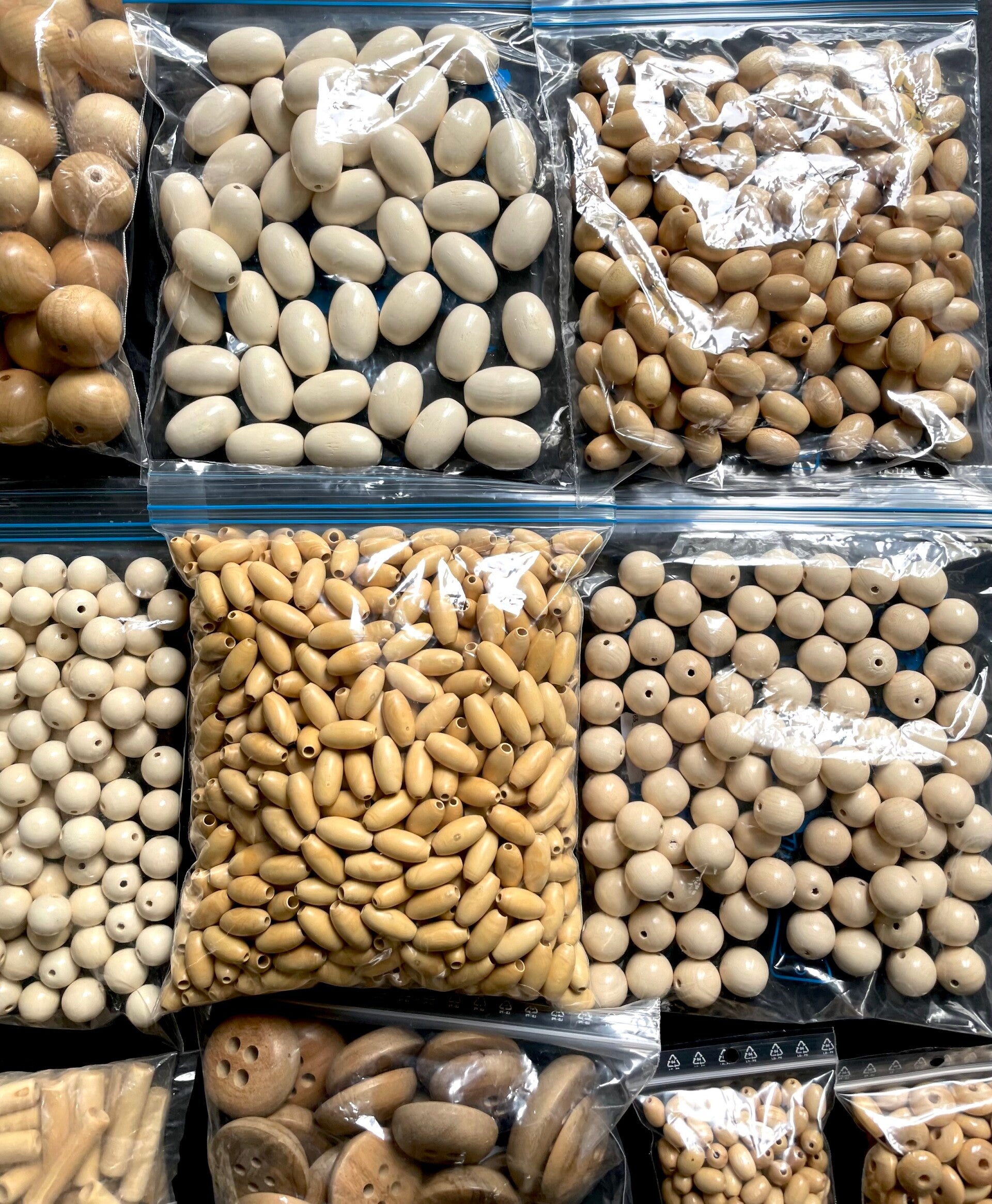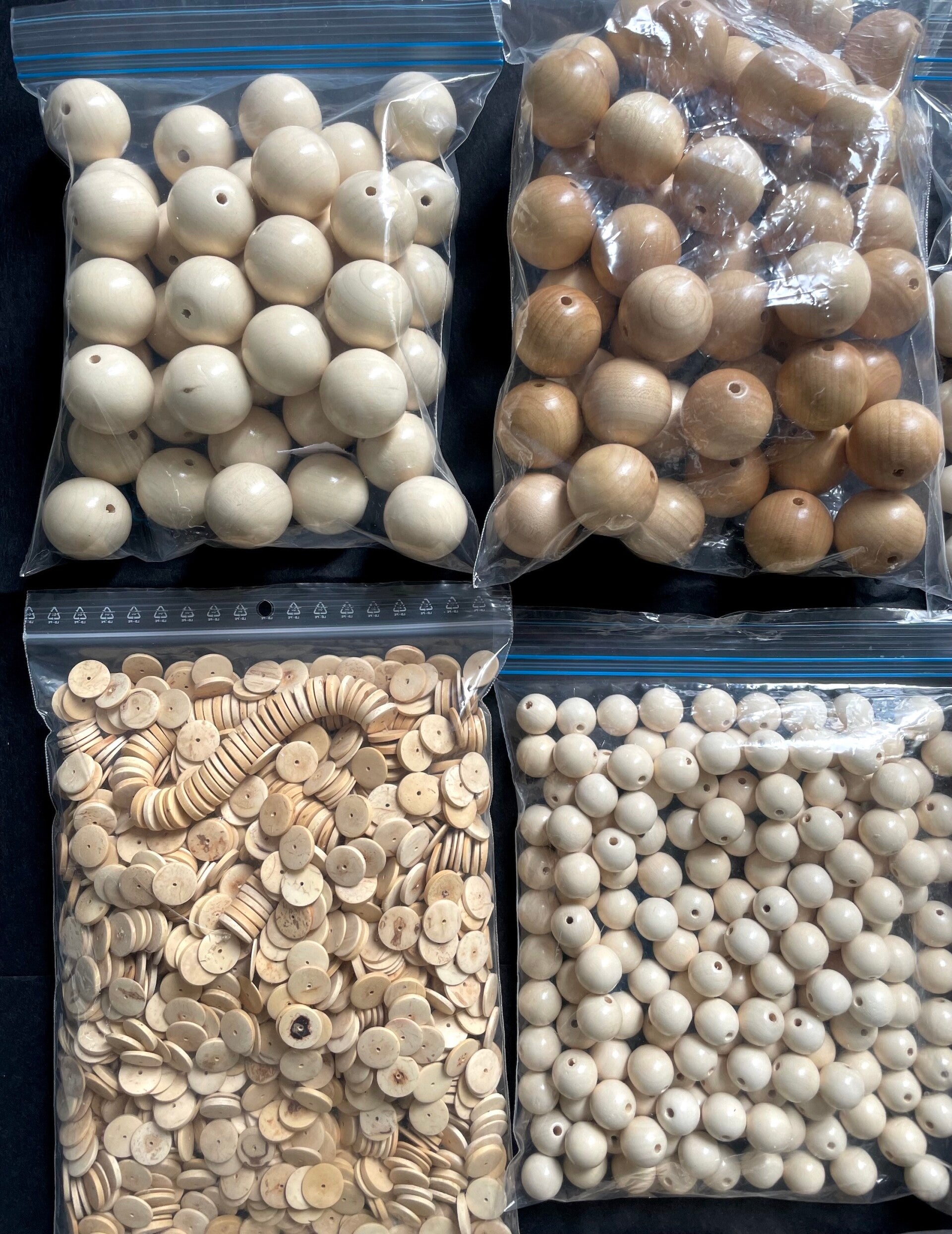 Important lot de perles en bois naturel de différentes tailles et tons en bois naturel. Ce lot provient des archives de la Maison Barlan et Prévost, créateurs et fabricants de passementerie et de perles pour la couture et la Haute Couture. Stock de matière première archives et collections de la Maison Barlan et Prevost depuis 1860. Idéal pour la restauration, ou la confection de nouvelles passementeries, ou de création de bijoux artisanaux.