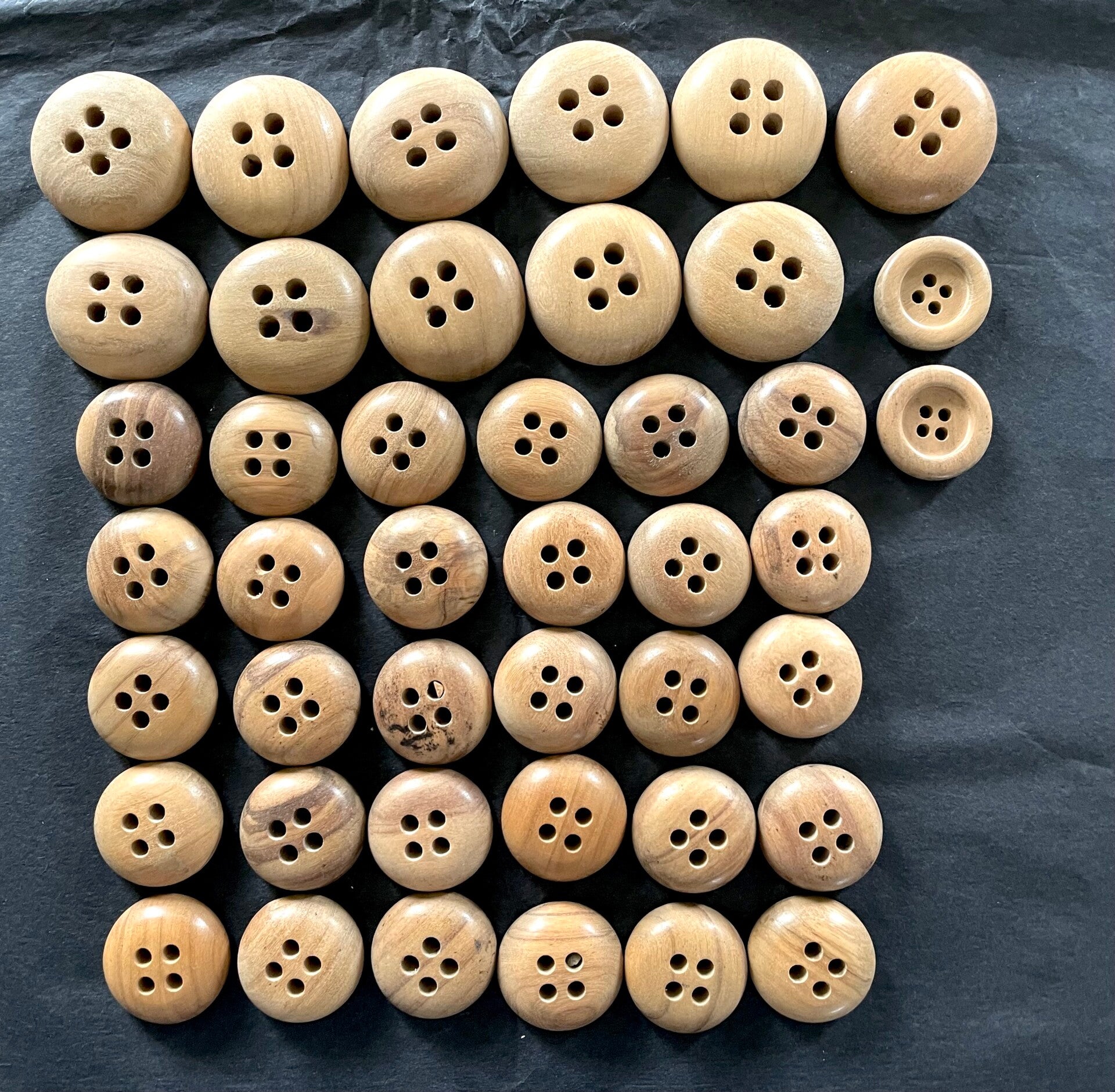 This set includes 30 natural wood buttons of 3.5 cm circumconference (see photos), and 11 natural wood buttons of 4 cm circumconference.