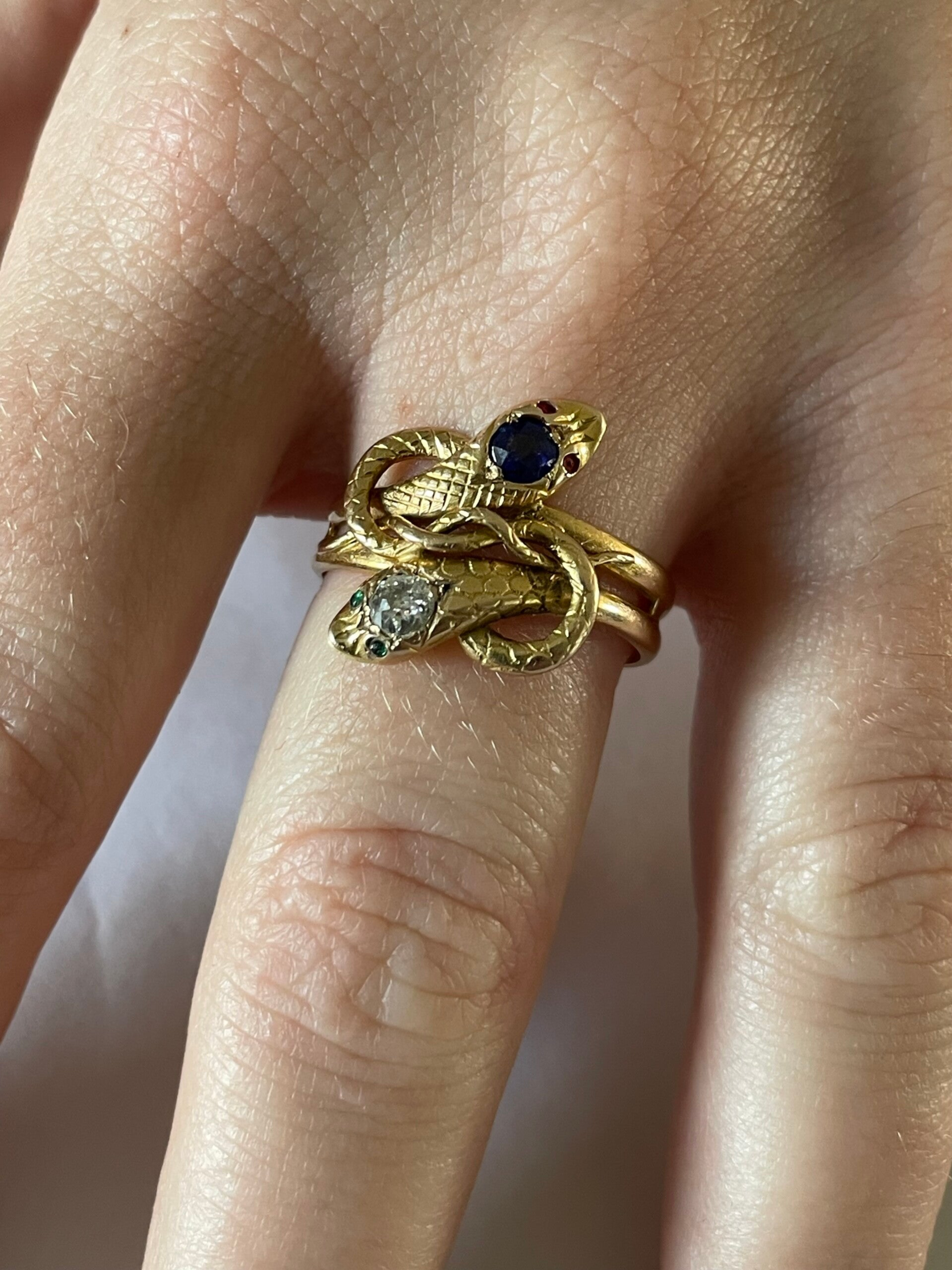 Très originale bague en or jaune 18 ct, formée de deux serpents enroulés, l'un orné d'un saphir bleu aux yeux de rubis, l'autre orné d'un diamant de 0,20ct aux yeux d'émeraude, montée sur un double anneau rigide. Poinçon tête d'aigle à l'extérieur de l'anneau. Poids 6,21 gr, tour de doigt 60,5.