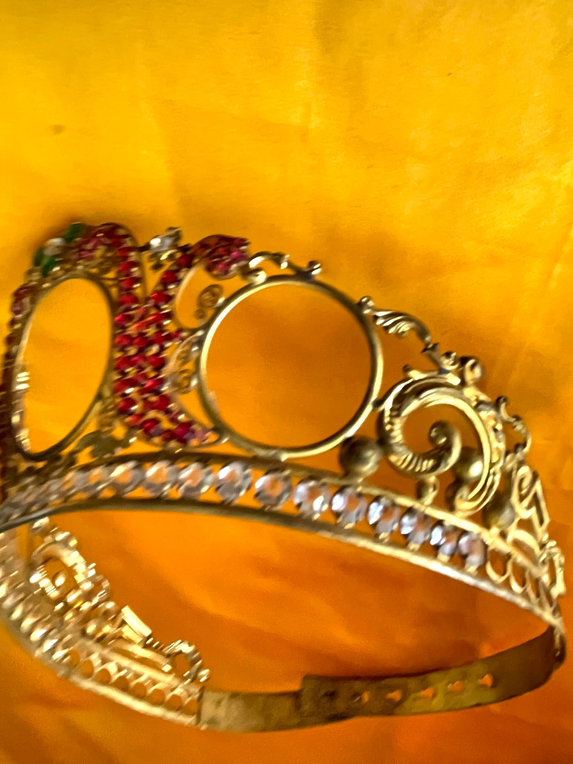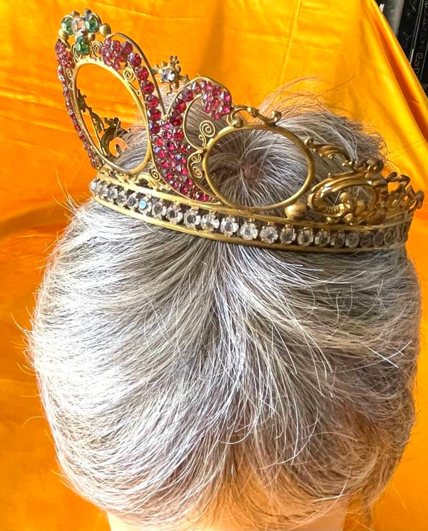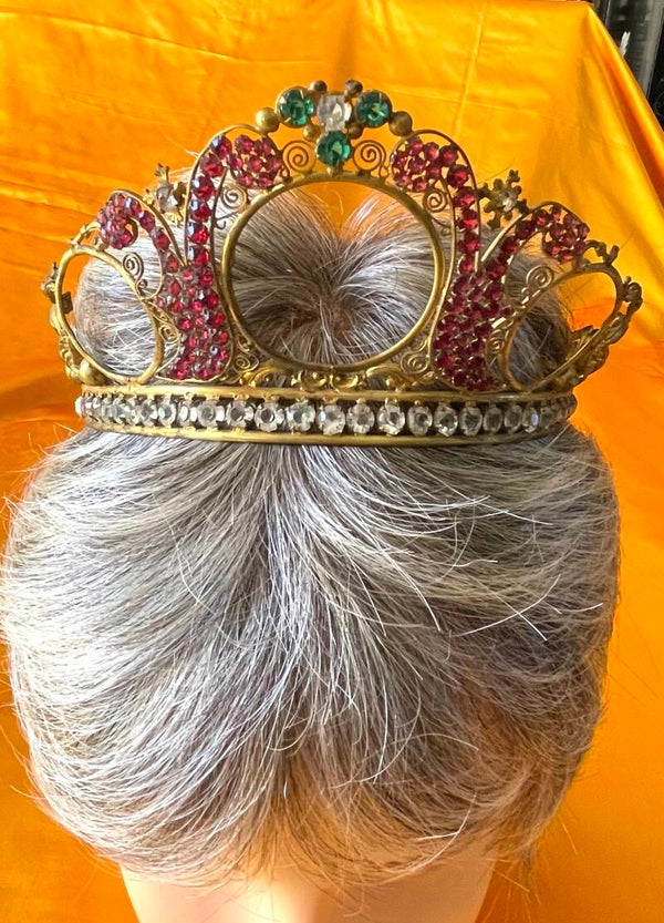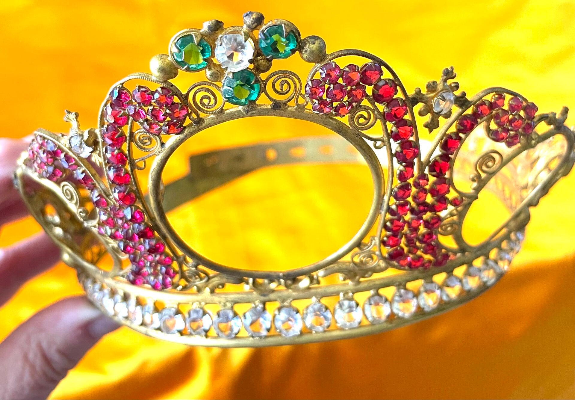 Probablement une couronne de théatre de représentation musicale, de ballet ou de scénographie ancienne. L'agencement des pierres de couleurs lui confère un éclat particulier sous les lumières, un poinçon de fabricant se distingue sous le numéro 326 gravé sur le cerclage de fermetur. Ce cerclage décliné en 8 points permet une adaptation à la mesure du tour de tête de l'artiste.