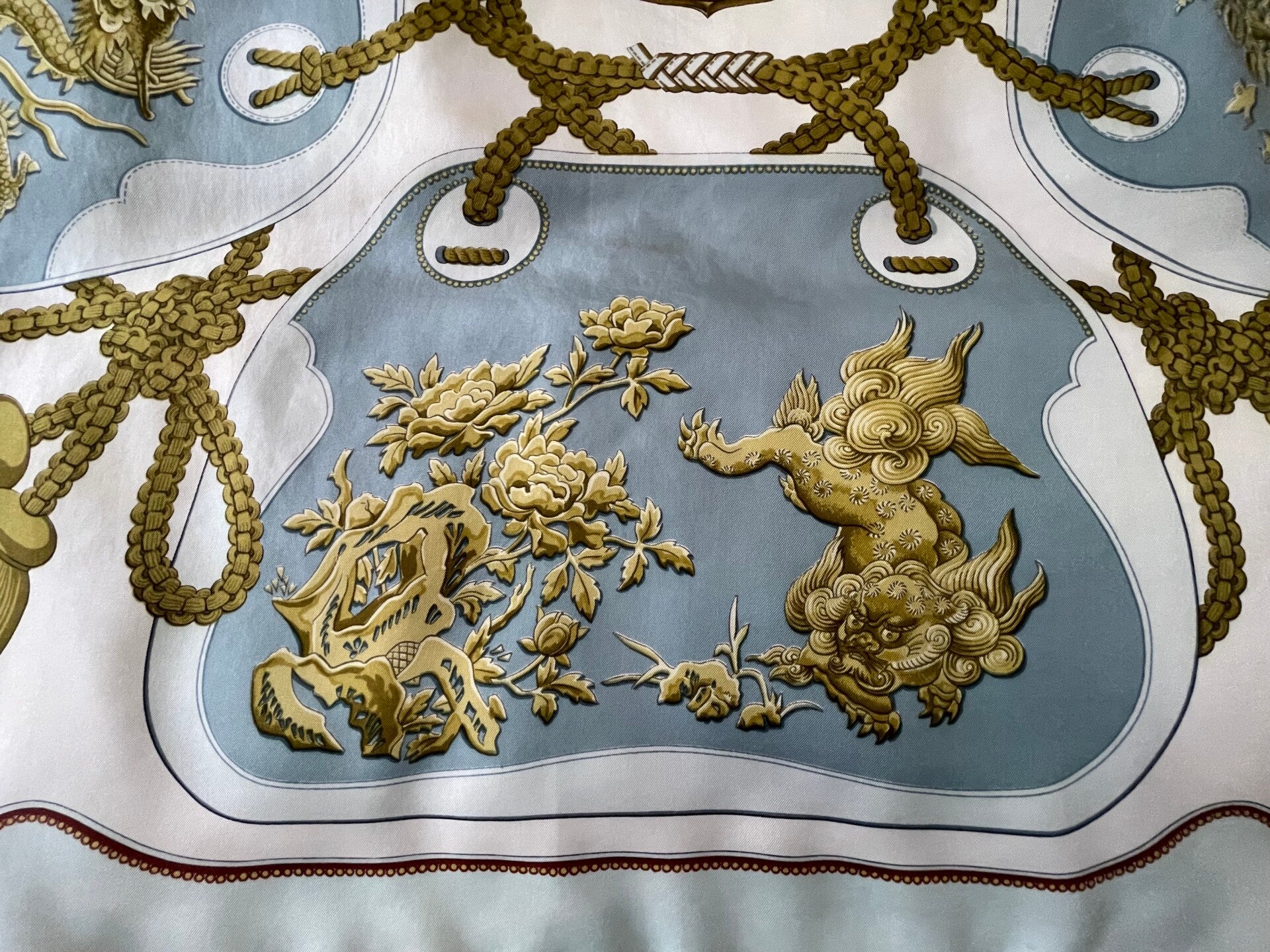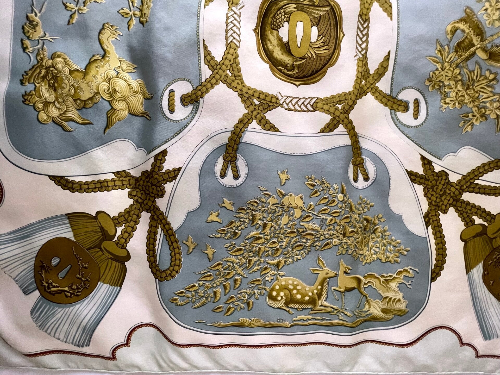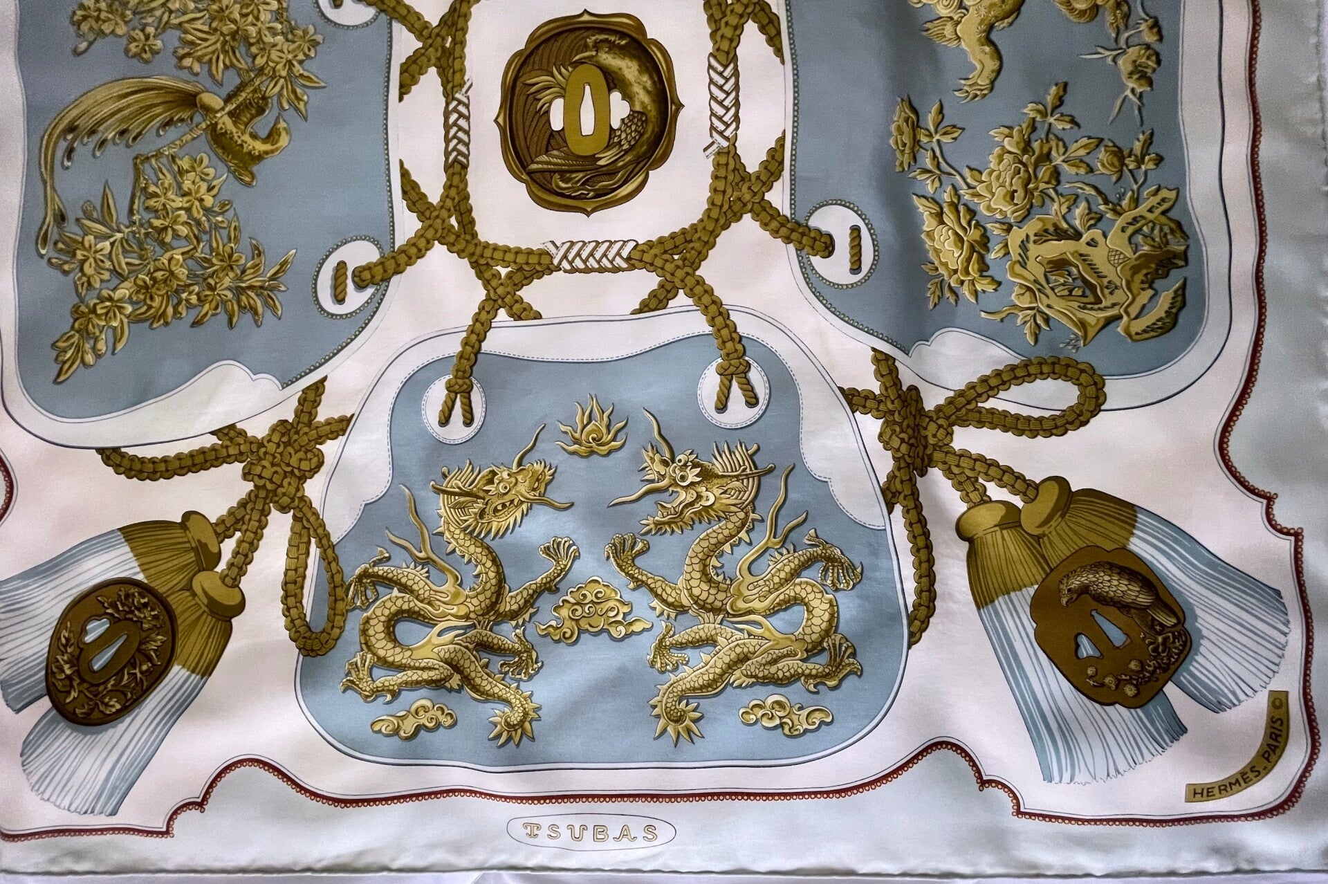 "Tsubas" carré Hermes. Ce beau foulard illustré par Christiane Vauzelles et édité en 1991 par la Maison Hermès en twill de soie aux bords roulottés main, illustre des "TSUBAS" signifiant "GARDE" en japonais. Ce petit objet complétait l'ornement des sabres de samourai. Sur fond ivoire se décline quatre selles de samourai sur lesquelles figurent des dragons royaux, oiseaux, biches, cerfs, feuillage, dans un camaieu de couleur ivoire, or, bleu/gris.... Les stubas sont représentés sur des pompons aux quatre coins et au centre. Porte son titre en bas au centre, à gauche son copyright et le nom de la Maison "HERMES PARIS". Bon état de conservation et d’usage, tant au niveau de la soie que des couleurs, voir les détails sur les photos. Frais d’expédition offerts pour la France. Frais d’expédition à l’international, tarif sur demande suivant la zone du pays. Dimensions : 88 x 86 cm. Visitez mes autres objets en consultant notre galerie Proantic le Lys et l'epée.