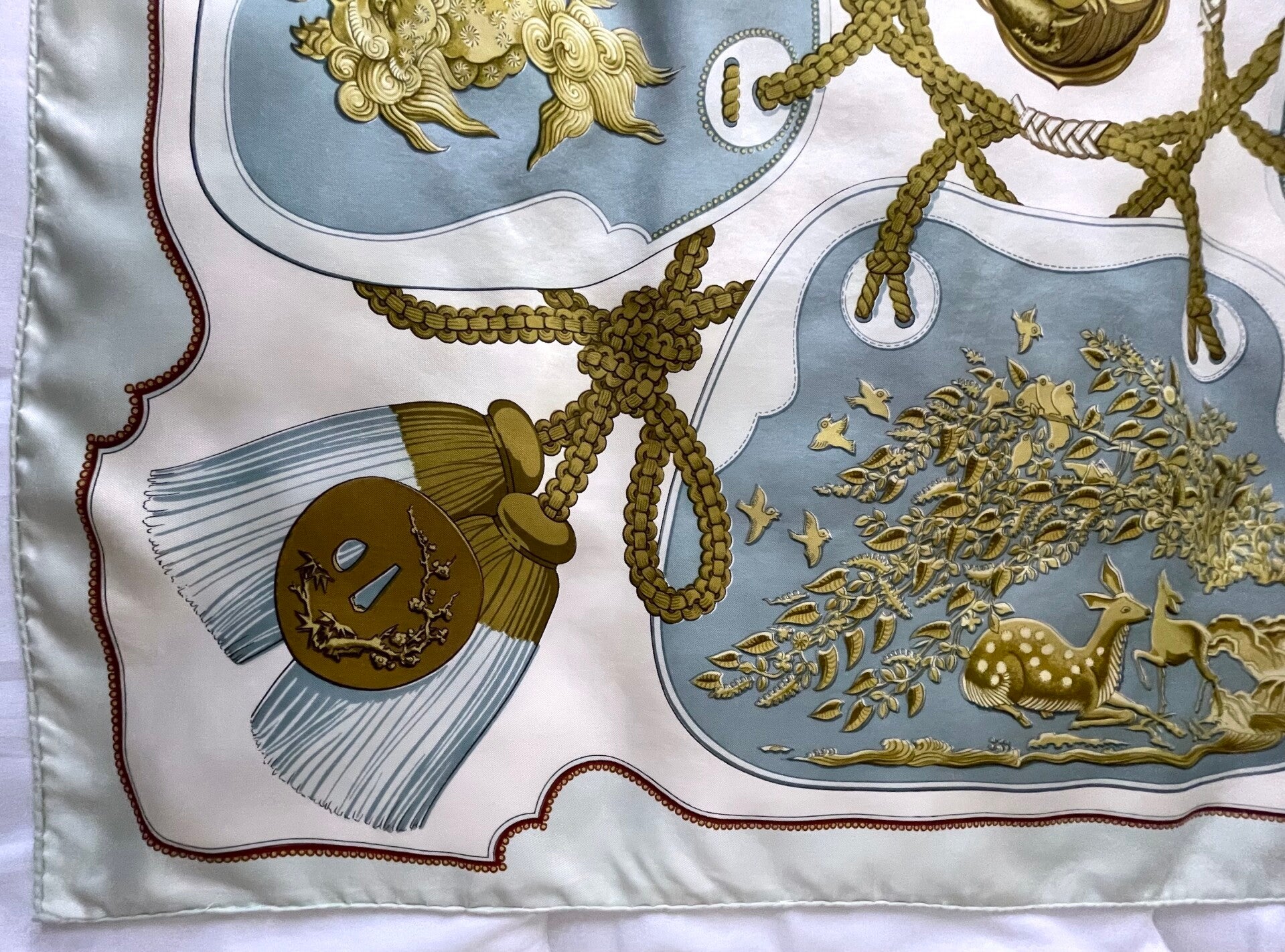 This beautiful scarf illustrated by Christiane Vauzelles and published in 1991 by the Maison .Hermès in silk twill with hand rolled edges, illustrates "TSUBAS" meaning "GUARD" in Japanese. This small object completed the ornament of samurai swords.