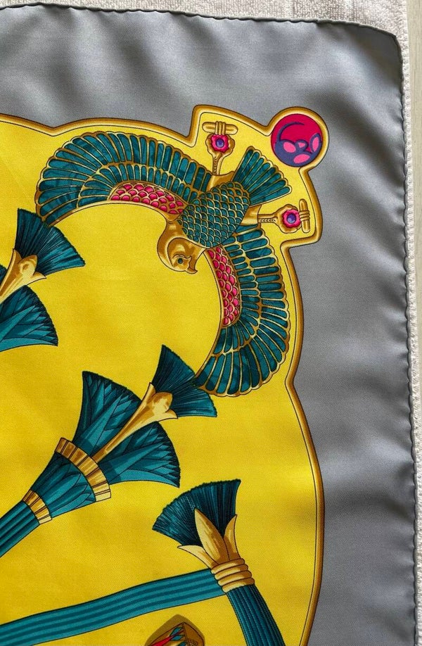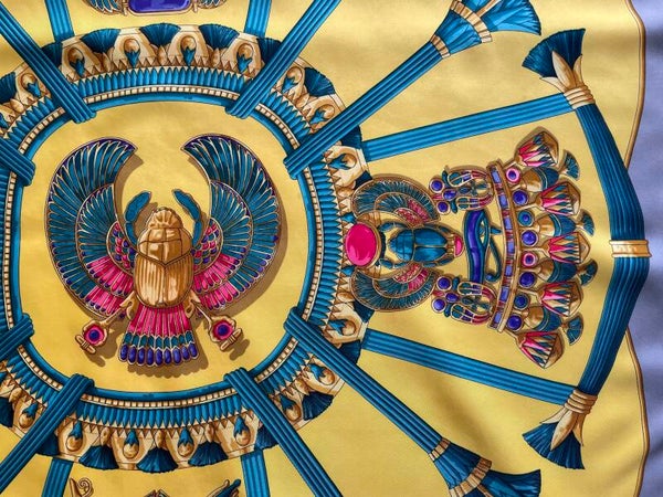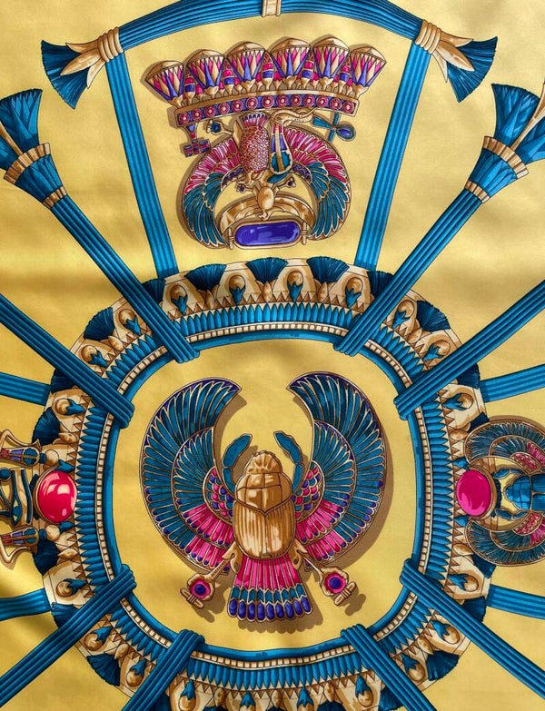 This beautiful square illustrated by Caty Latham and published by the Maison Hermès in 1999 has never been reissued. This silk twill scarf with hand rolled edges is declined on a bright yellow background with gray borders.A central beetle with outstretched wings seems to watch its congeners in the angles and eagles in flight. Many Egyptian signs complete the decor in a camaieu of yellow, turquoise blue, emerald green, pink fuchsia, purple... Dimensions: 87.5 x 89.5. Carries its composition label 100% silk made in France. Delivered in a Hermès box.