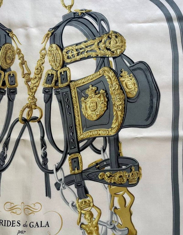 Illustrated in 1957 by Hugo Grygkar and reissued several times by the Maison Hermès this scarf remains an iconic brand. In ivory silk twill with hand rolled edges, and red borders, is a model Equestrian of course. The flamboyant brides are the image of the timeless spirit of Hermès. Its name, evokes the rattle of the buckles rhythmically by the steps of the horses. The name of the House, title and copyright are centered at the bottom of this square. Dominant colors, ivory, red, gray. No hole, no stain. Beautiful condition of origin, use and conservation. See details on the photos. - Dimensions: 90 X 90 cm