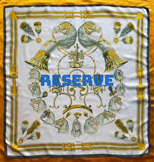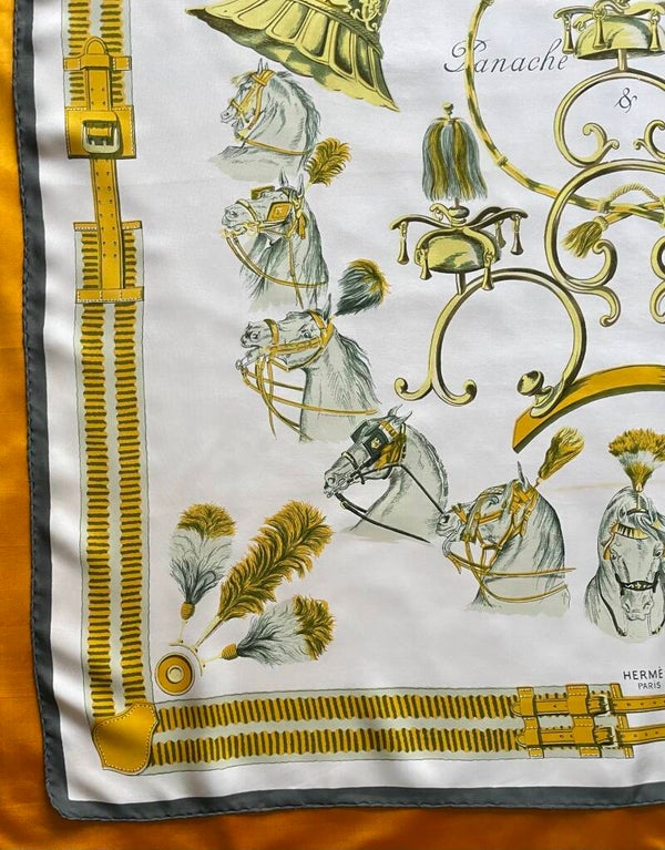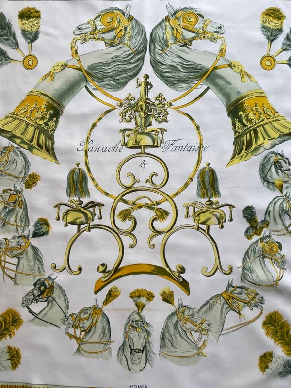 Illustrated by Hugo Grygkar, published in 1958 and then in 1998 this beautiful scarf rare and quite sought-after silk twill with hand roulottées edges, is declined on ivory background. This composition represents heads of horses richly harnessed surrounded by feathers and equestrian attributes, in a dark gray border with dominant colors gold, yellow, grey, green... The title "Panache et Fantaisie» is in the centre, while the name of the HERMES Paris brand is centered at the bottom. No copyright since this is a 1958 edition.