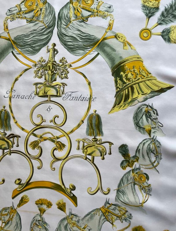 Illustré par Hugo Grygkar, édité en 1958 puis en 1998 ce beau foulard assez rare et assez recherché en twill de soie aux bords roulottés main, se décline sur fond ivoire. Cette composition représente des têtes de chevaux richement harnachés entourées de plumets et attributs équestres, dans une bordure gris foncé aux couleurs dominantes or, jaune, gris, vert…Le titre "Panache et Fantaisie » figure au centre, tandis que le nom de la Maison HERMES Paris se retrouve centré en bas. Pas de copyright puisqu’il s’agit ici d’une édition de 1958.