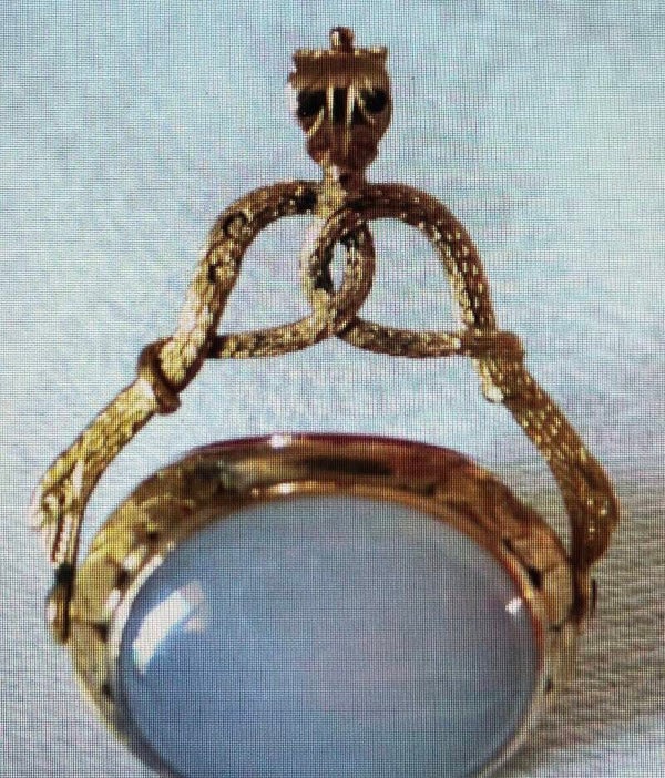 Monture à décor floral ciselé de chaque coté des cabochons pivotants et branches en forme de serpents ciselés d'écailles sur les deux faces et se terminant en bélière .