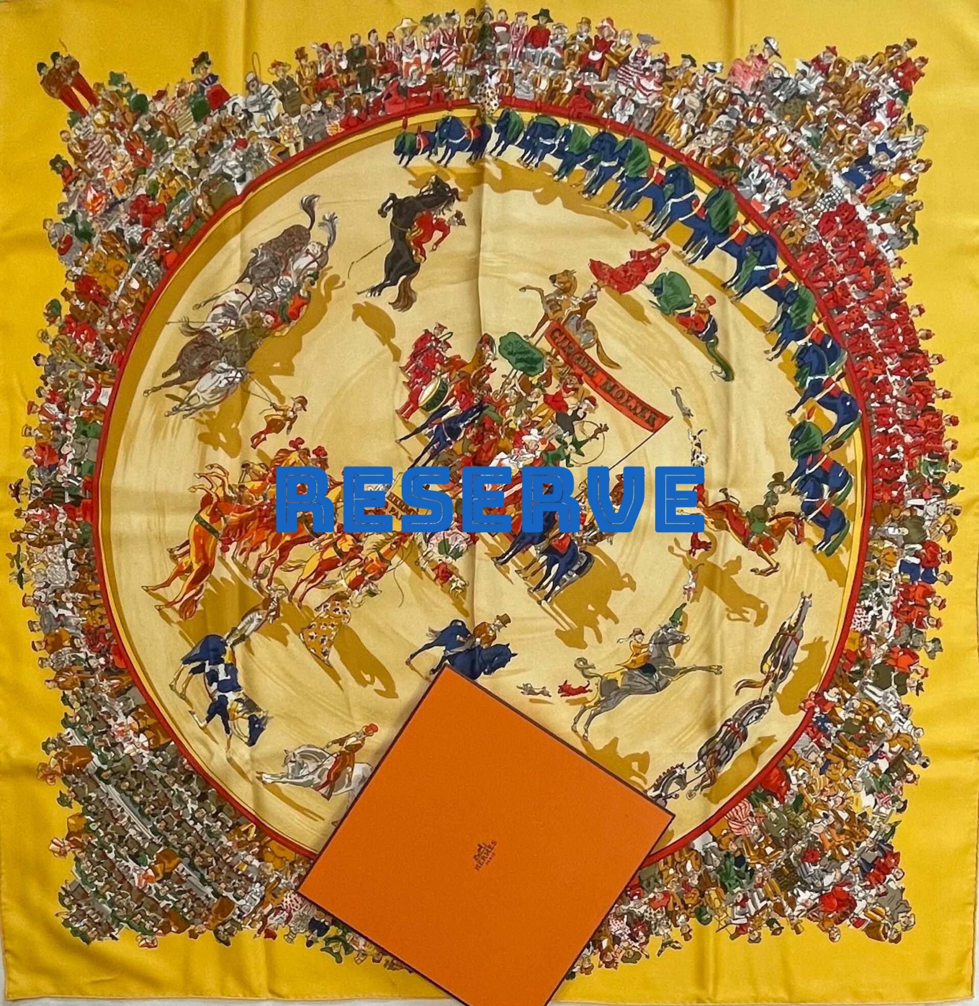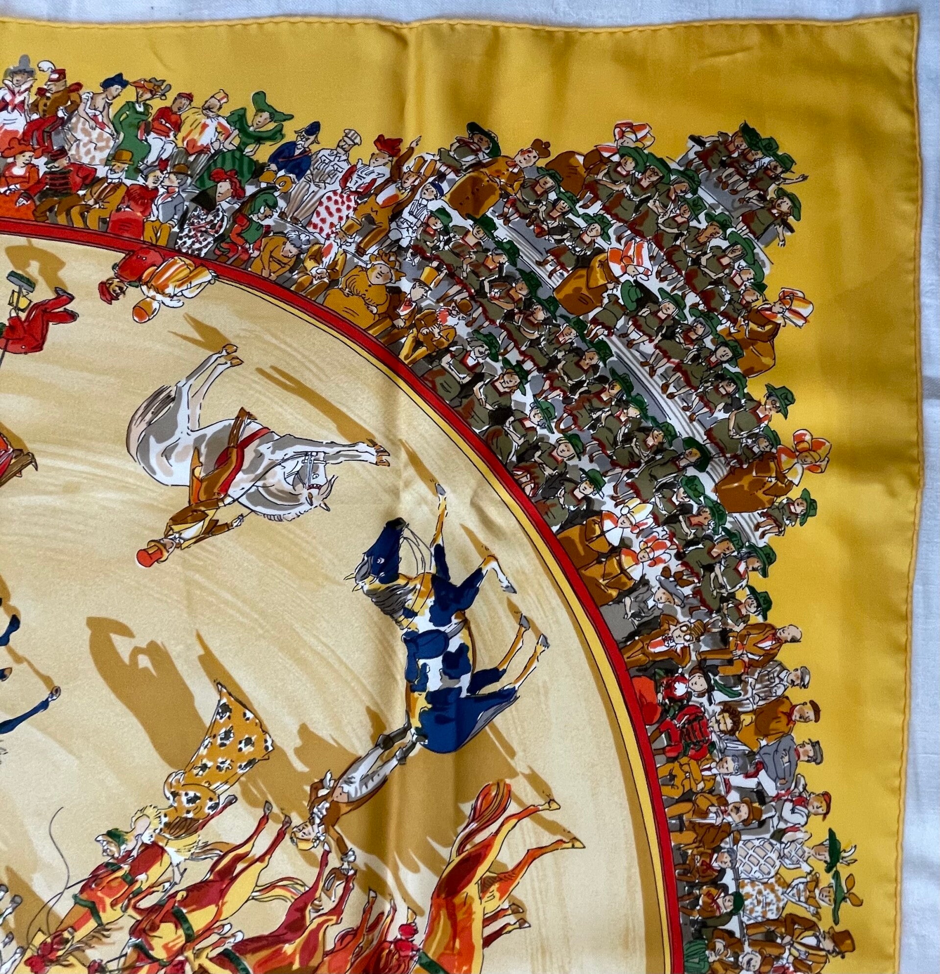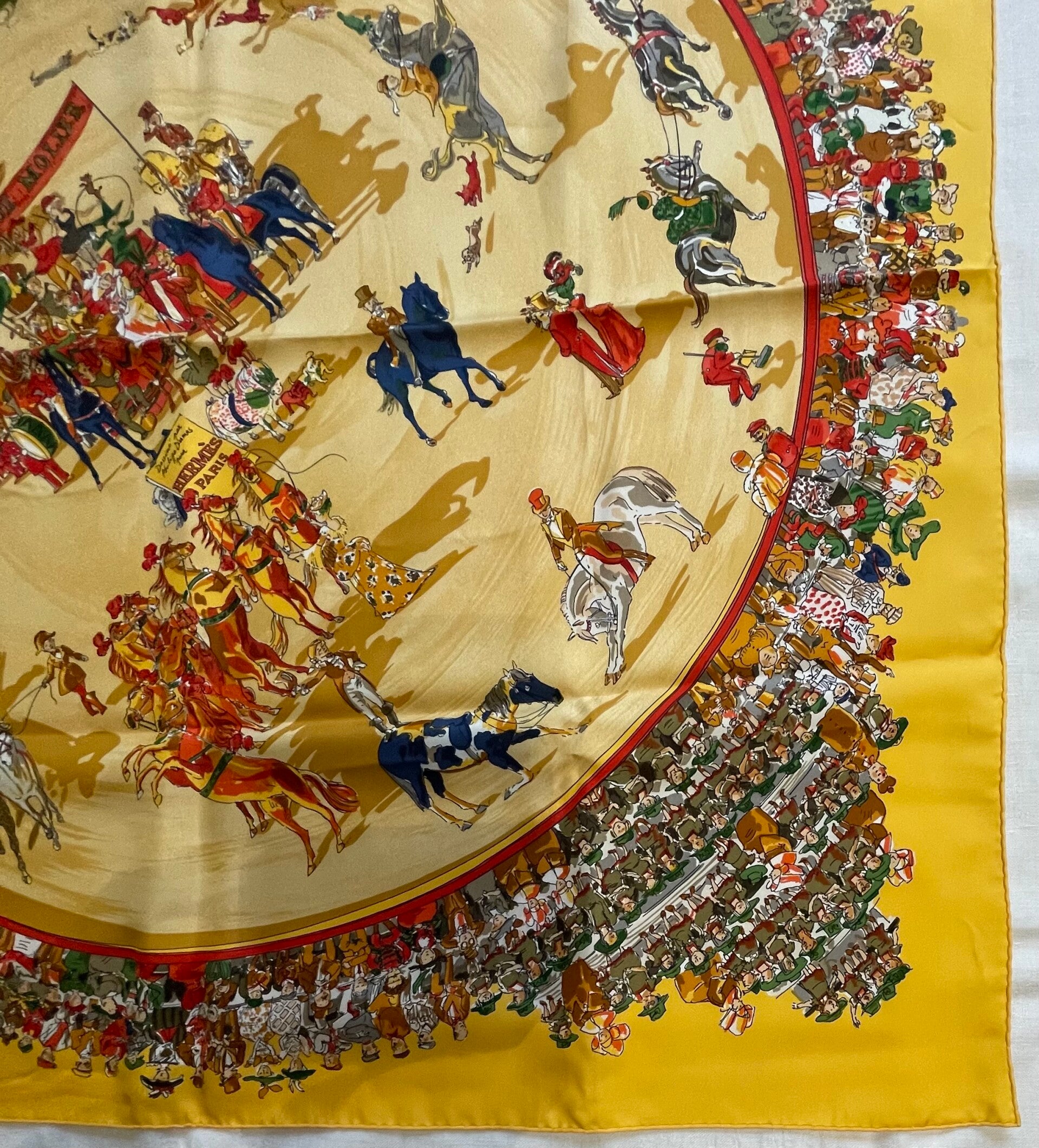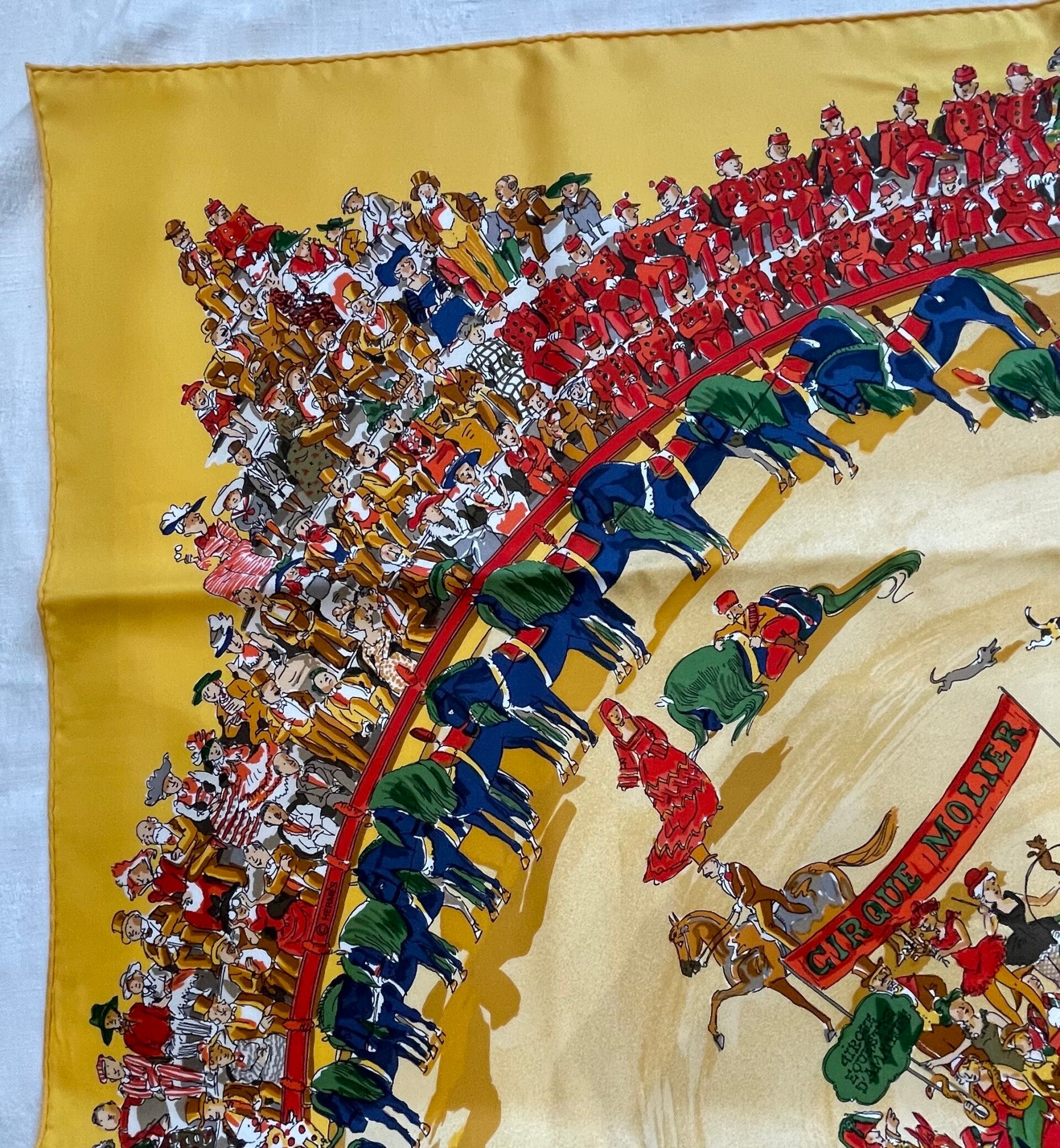 «CIRQUE MOLIER» illustrated by Philippe Dumas, published in 1983, reissued in 1995 and 2003, rare and sought after by collectors. This 29 years old scarf will be delivered with a box Hermès. In silk twill with hand-rolled edges in beautiful condition, this composition represents a scene of the Cirque d'Ernest Molier which was famous from 1880 to 1934, rue de Benouville in Paris. On a light yellow background with yellow borders supported, a cheerful band of artists, clowns, trapeze artists, squires, equites... Show off to a captivated and amazed audience. Dominant colours are yellow, red.... Very good condition of origin, conservation, and use, no hole, no drawn thread, no fading (see details on photos). Carries its composition label. The title «Designed by Philippe Dumas, for HERMÈS PARIS» is in the centre, copyright in the upper left. The silk is still very beautiful, well saturated colors. Sold with a box Hermès. Dimensions: 88 x 87