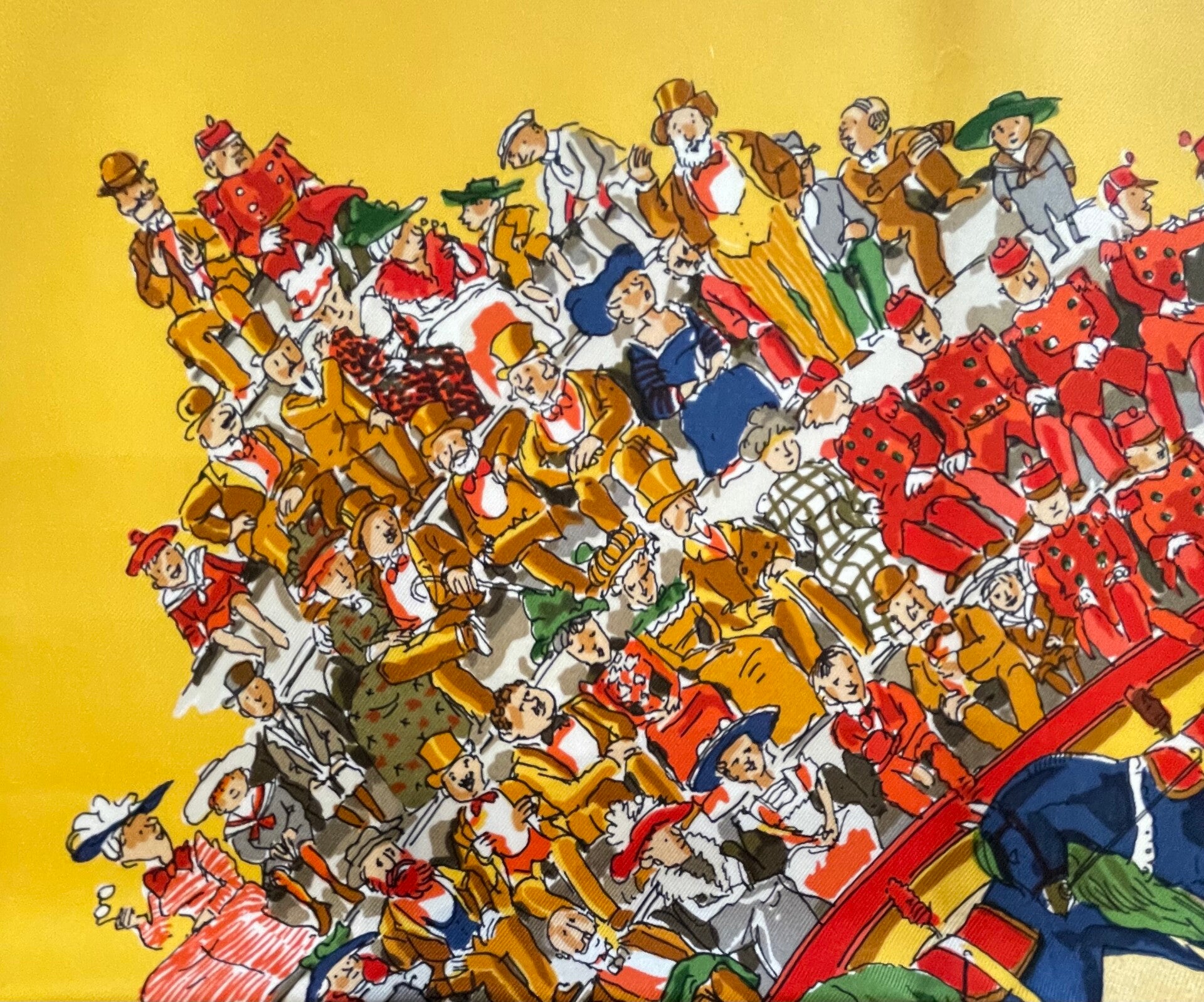 « CIRQUE MOLIER » , illustré par Philippe Dumas, édité en 1983, réédité en 1995 et 2003, reste rare et recherché par les collectionneurs. Ce foulard de 29 ans sera livré avec une boite Hermès. En twill de soie aux bords roulottés main en bel état, cette composition représente une scène du Cirque d’Ernest Molier qui s’illustra de 1880 à 1934, rue de Benouville à Paris. Sur fond jaune clair aux bordures jaune soutenu, une joyeuse bande d’artistes, clowns, trapézistes, écuyers, écuyères… s’exhibent, devant un public conquis et émerveillé. Couleurs dominantes jaune, rouge, bleu ….Très bon état d’origine, de conservation, et d’usage, pas de trou, pas de fil tiré, pas de décoloration (voir les détails sur les photos). Porte son étiquette de composition. Le titre « Dessiné par Philippe Dumas, pour HERMÈS PARIS »figure au centre, le copyright en haut à gauche. La soie est encore très belle, les couleurs bien saturées. Vendu avec une boite Hermès. Dimensions : 88 x 87