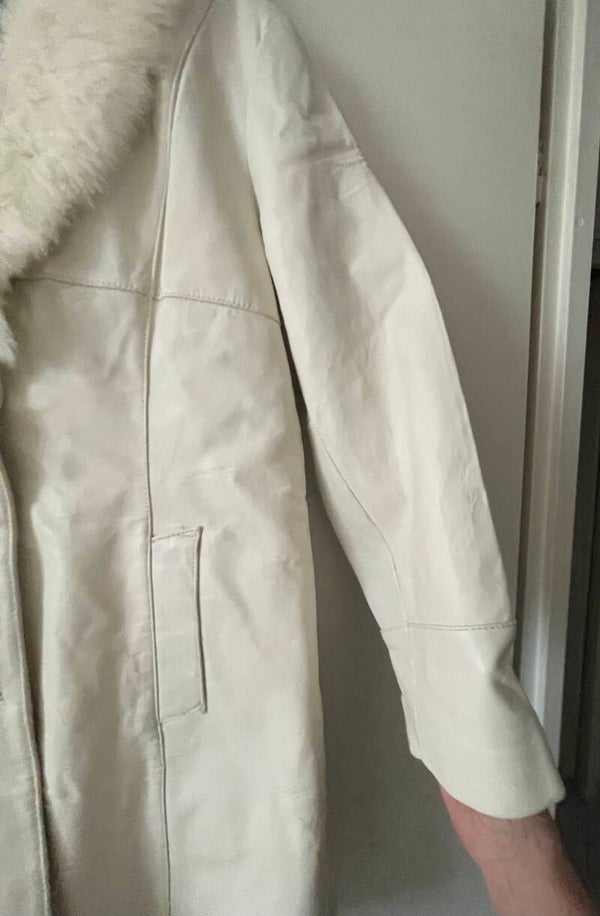 Joli manteau en cuir blanc rehaussé d’un col en lapin blanc au simple boutonnage avec trois boutons estampillé Wilson Wilson. Portant étiquette Maison Wilson Leather et son étiquette de conservation et nettoyage. (voir les photos). Col recouvert d’une petite fourrure de lapin blanc. Deux poches verticales, doublure en très bon état. Cuir en très bon état, entièrement doublé en satin grège en très bon état, pas de brulure sous les bras, ni de déchirure, propre. Fente à l’arrière. Finition intérieure de propreté, liseré marron clair. (voir les détails sur les photos). Taille 40 à 42 probablement.