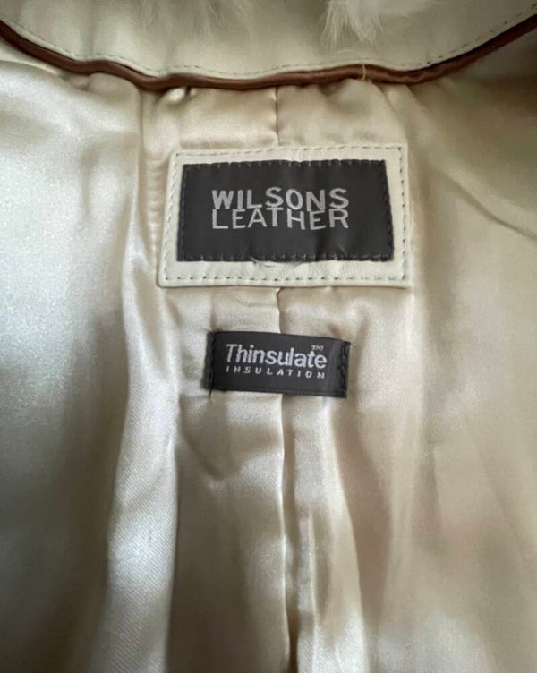 Manteau cuir agneau blanc et col fourrure en lapin de la Maison Wilson Leather, Since 1899.