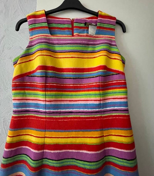 Robe sans manche en 100% coton tissé de la marque Melissa USA et de couleurs bayadère. En taille 6 probablement taille 36 France, ce joli modèle est entièrement doublé de viscose jaune. Deux pinces de poitrine, deux pinces depuis la taille allongent la silhouette, cotés cintrés. Encolure carrée devant et arrondie au dos. Fermeture éclaire au dos. Dimensions : Hauteur totale : 95 cm - Hauteur sous le bras jusqu’à la base : 75 cm - Largeur carrure épaule à épaule : 36 cm - Largeur poitrine : 92 cm - Longueur de la fermeture éclaire : 55 cm. Très Bon état d’origine, de conservation et d’usage (voir les détails sur les photos). Ni trou, ni tache, ni décoloration.