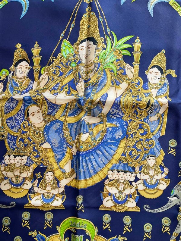 L’illustratrice a laissé sa vision s’exprimer autour de Lakshmi déesse de la richesse. Lakshmi est souvent accompagnée de divers symboles traditionnels porte-bonheur, tels que des paons, des lotus, des éléphants peints et décorés de guirlandes de fleurs. En twill de soie aux bords roulottés main, dans un camaïeu de plusieurs tons de bleu, violet, prune, vert, or… ces couleurs sont encore très chatoyantes et bien saturées. La soie souple et douce est un marqueur de son ancienneté. Porte son titre « India » centré en bas, le nom de la maison Hermès ainsi que son copyright en bas à droite. En bel état d’origine, d’usage et de conservation. Voir les détails sur les photos.