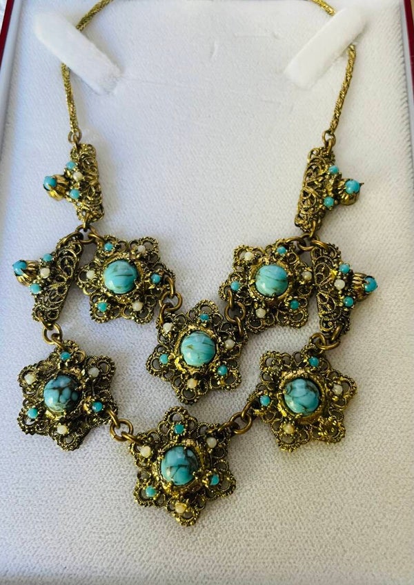 Intéressant collier draperie composé de 6 fleurs en métal doré de couleur bronze doré guilloché, orné d’un cabochon de pierre dure de couleur turquoise entouré de petites pierres blanches et turquoise, reliées par 4 demi fleurs composées des mêmes pierres et terminées par une chaine formant collier. Intéressant travail des années 1950/1960 pour défilé de mode. En bon état malgré 3 manques de petites pierres blanches voir les détails sur les photos.(détail pratiquement invisible)