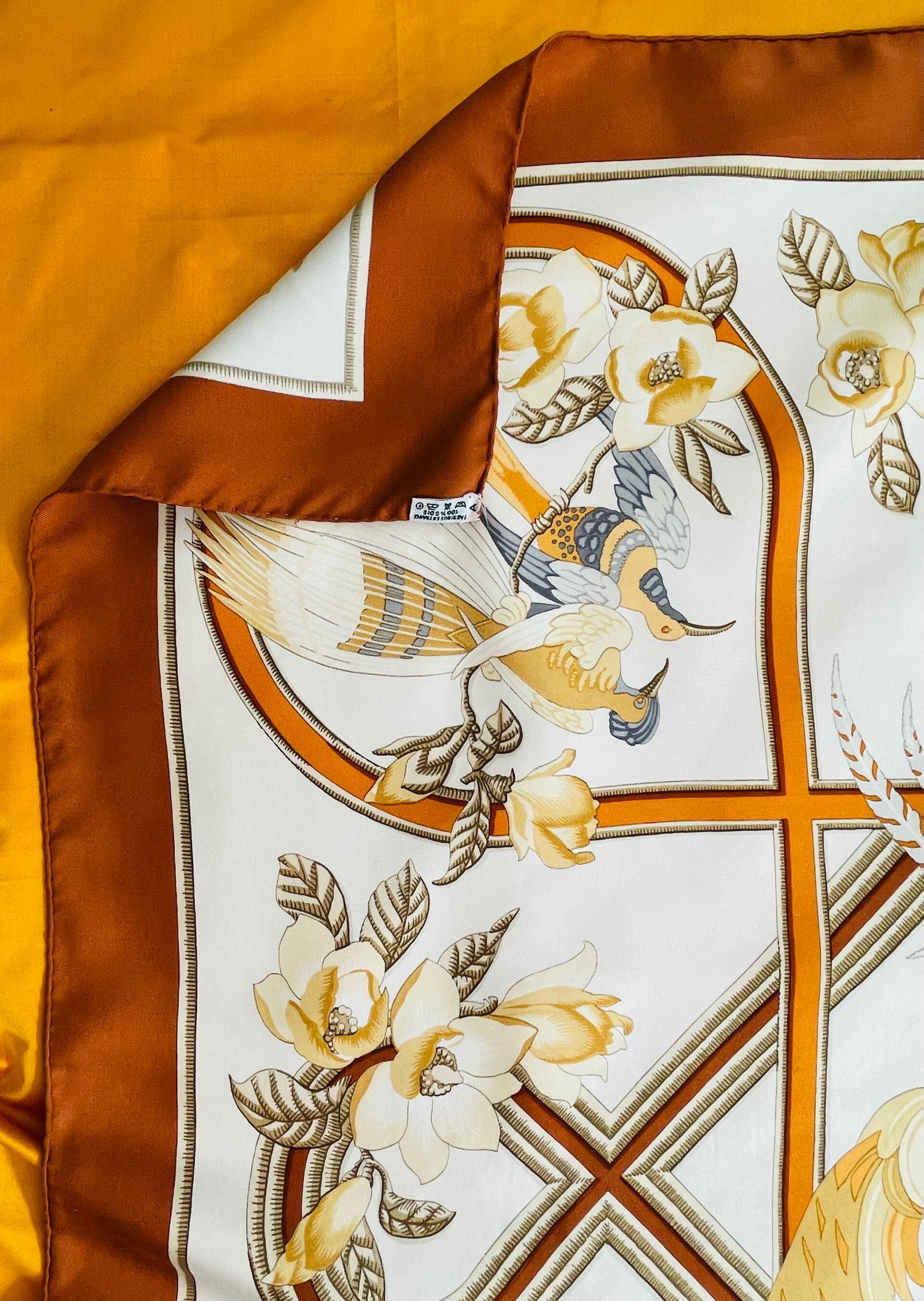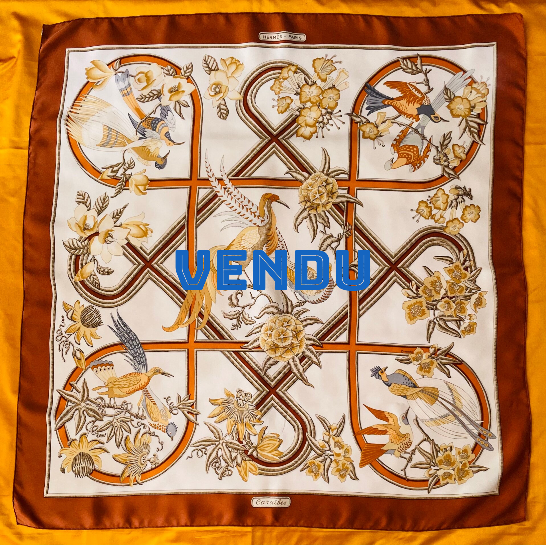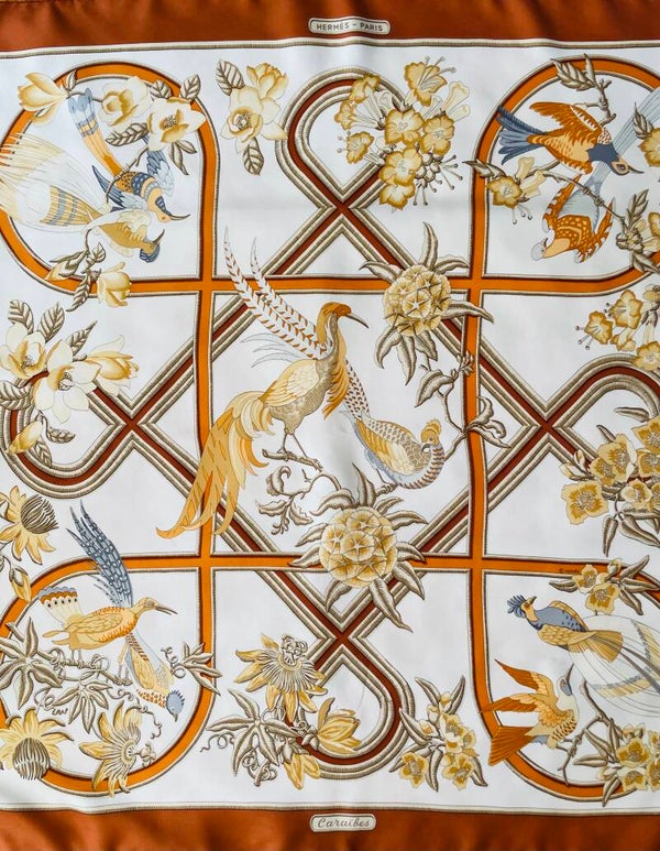 Caraîbes, carré Hermès illustré par Christiane Vauzelles, édité en 1974 et réédité en 1991. Ce beau carré en twill de soie aux bords roulottés main se décline sur fond ivoire aux bordures caramel. L’illustratrice a laissé libre cours à son imagination pour y dessiner des oiseaux de paradis dans leur milieu naturel dans un camaïeu de couleurs écru, orangé, jaune, taupe,….Porte son étiquette de fabrication. En très bon état de d’origine, de conservation et d’usage, ce carré reste recherché par les collectionneurs et amateurs de la Maison Hermès. Dimensions : 90 x 90.