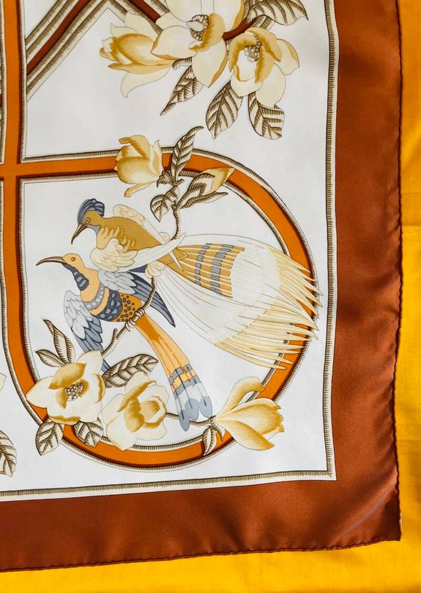 Caraîbes, square Hermès illustrated by Christiane Vauzelles published in 1974 and reissued in 1991. This beautiful square in silk twill with hand-rolled edges is declined on an ivory background with light rust borders The illustrator gave free rein to her imagination to draw birds of paradise in their natural environment in shades of orange, yellow, taupe.... Still has his manufacturing label. In very good condition of origin, conservation and use, it remains a square sought by collectors and enthusiasts of the Firme Hermès. See the details on the photos. Size : 90 x 90.