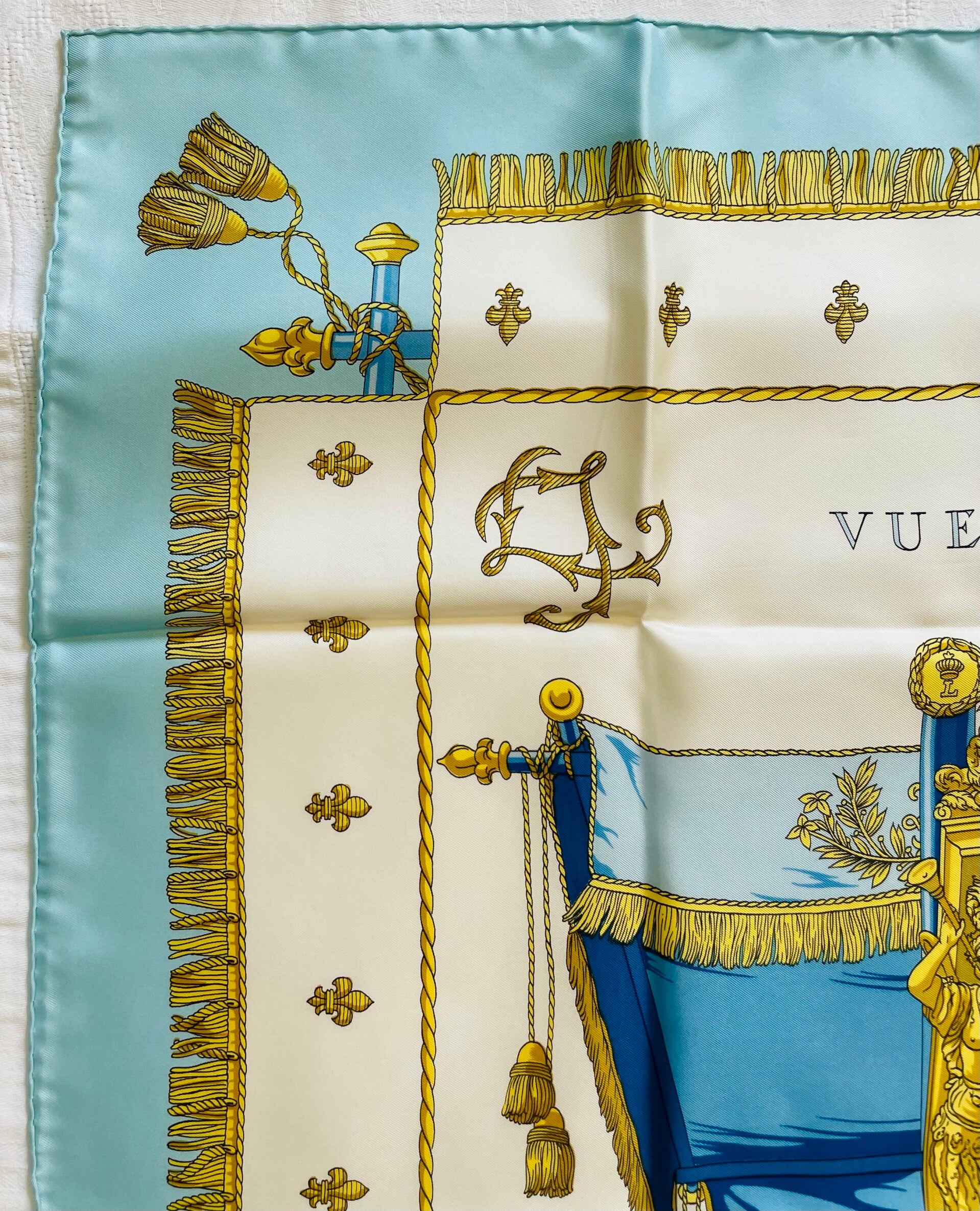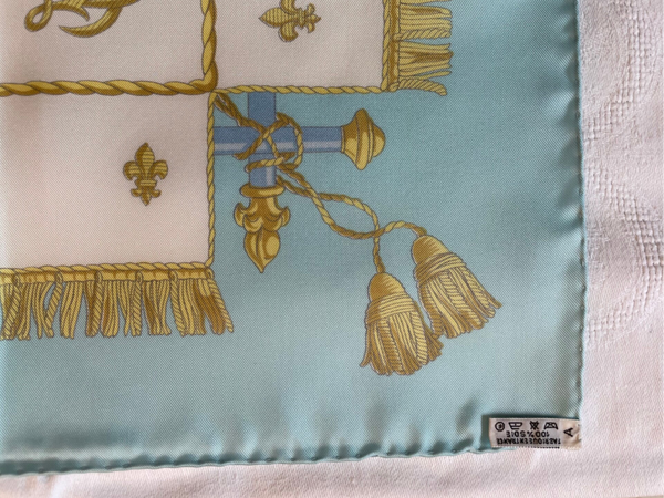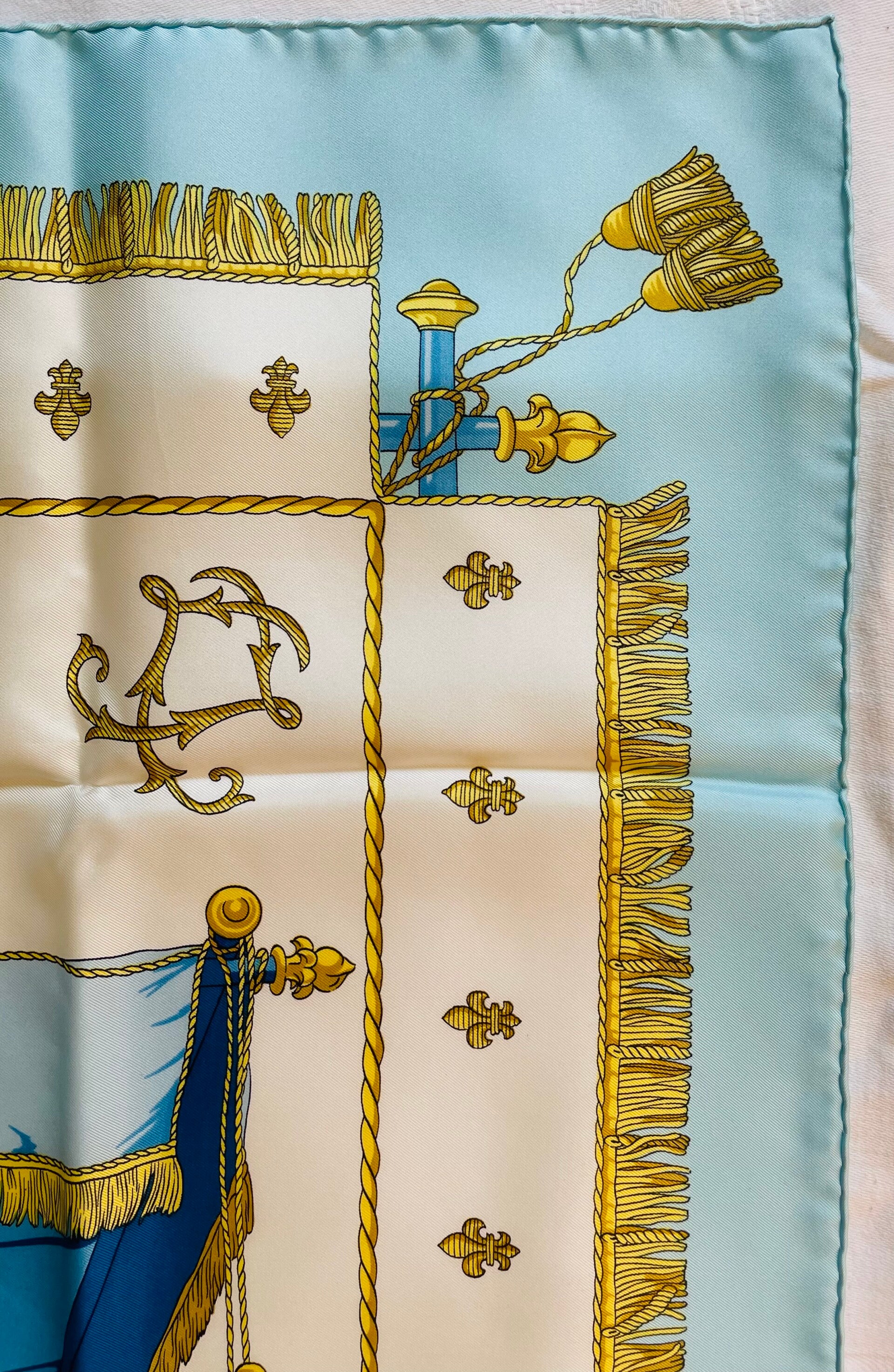 In silk twill with hand-rolled edges, this exceptional square is declined on an off-white background with sky blue borders, in a camaieu of sky blue, royal blue, navy blue, gold tones, surrounded by fleurs-de-lys. The copyright appears at the bottom left and the name of the house 'Hermès Paris' at the bottom right. Carries its manufacturing label. The rolled edges are still well inflated, neither hole, nor stain, nor thread drawn, it has never been worn, and was well preserved in its original box. In very good condition of origin, conservation and use, this square remains sought by collectors and enthusiasts of the House Hermès. Dimensions: 90 x 90 cms. Sold with its box.