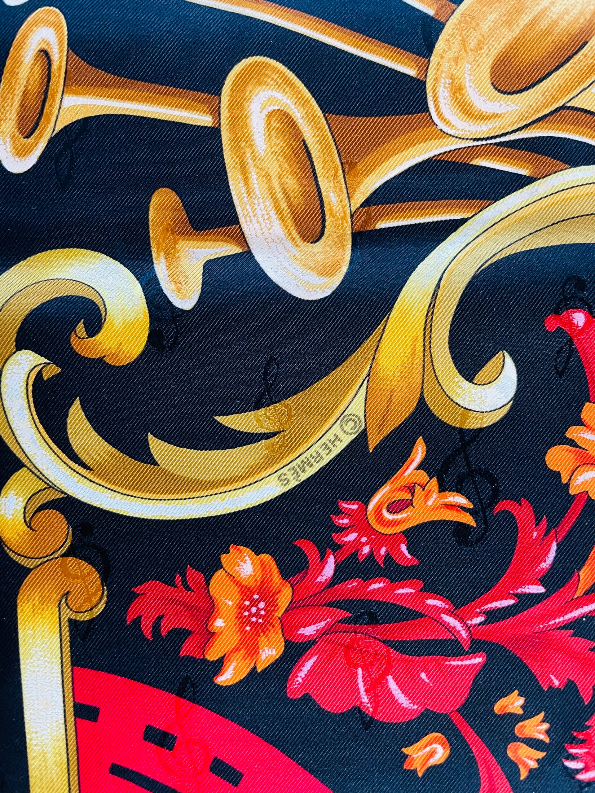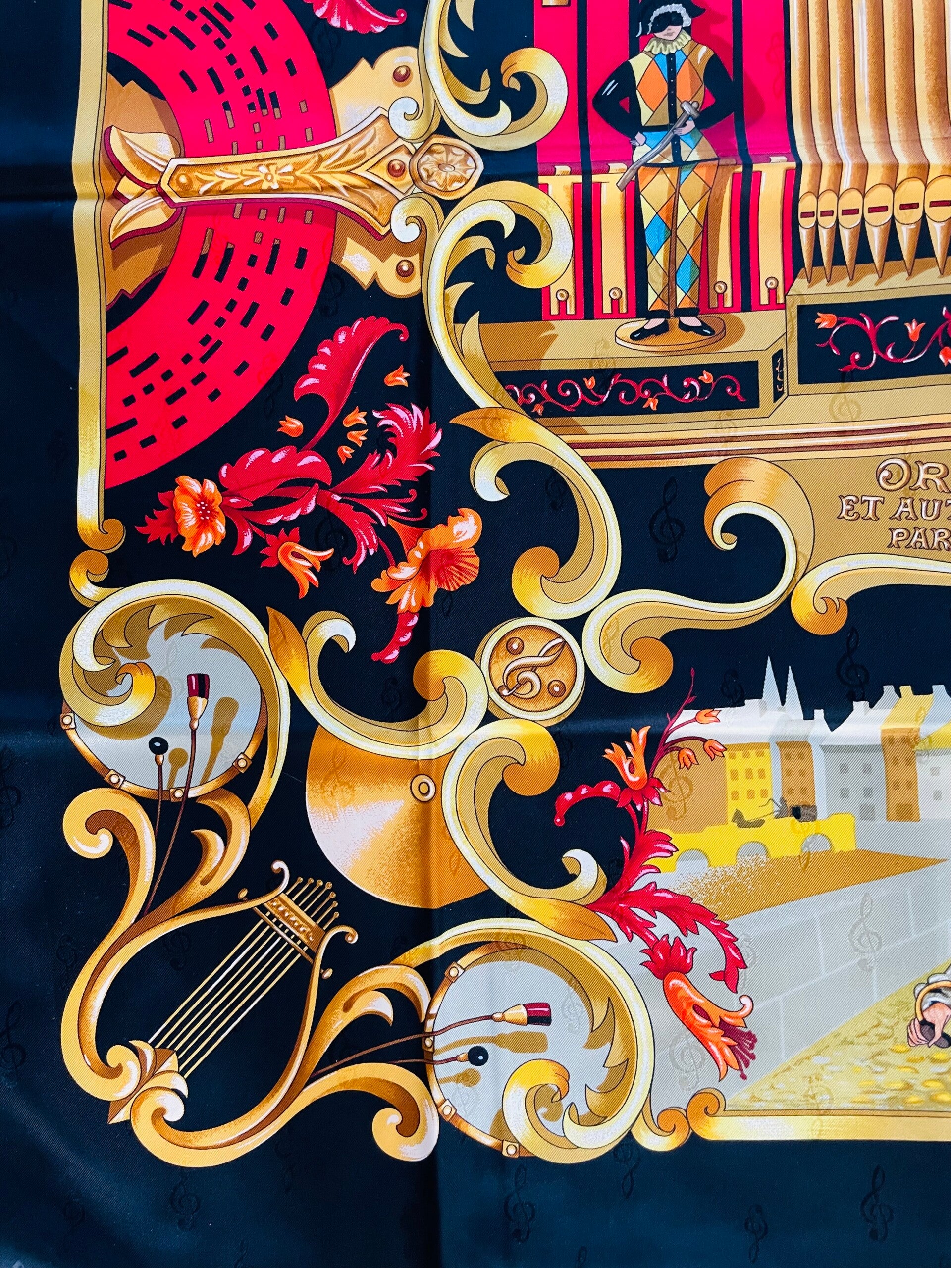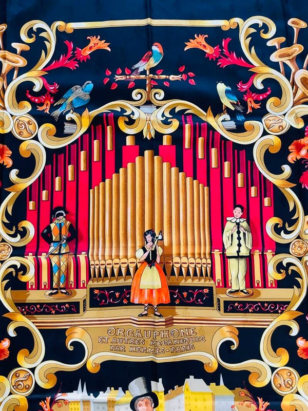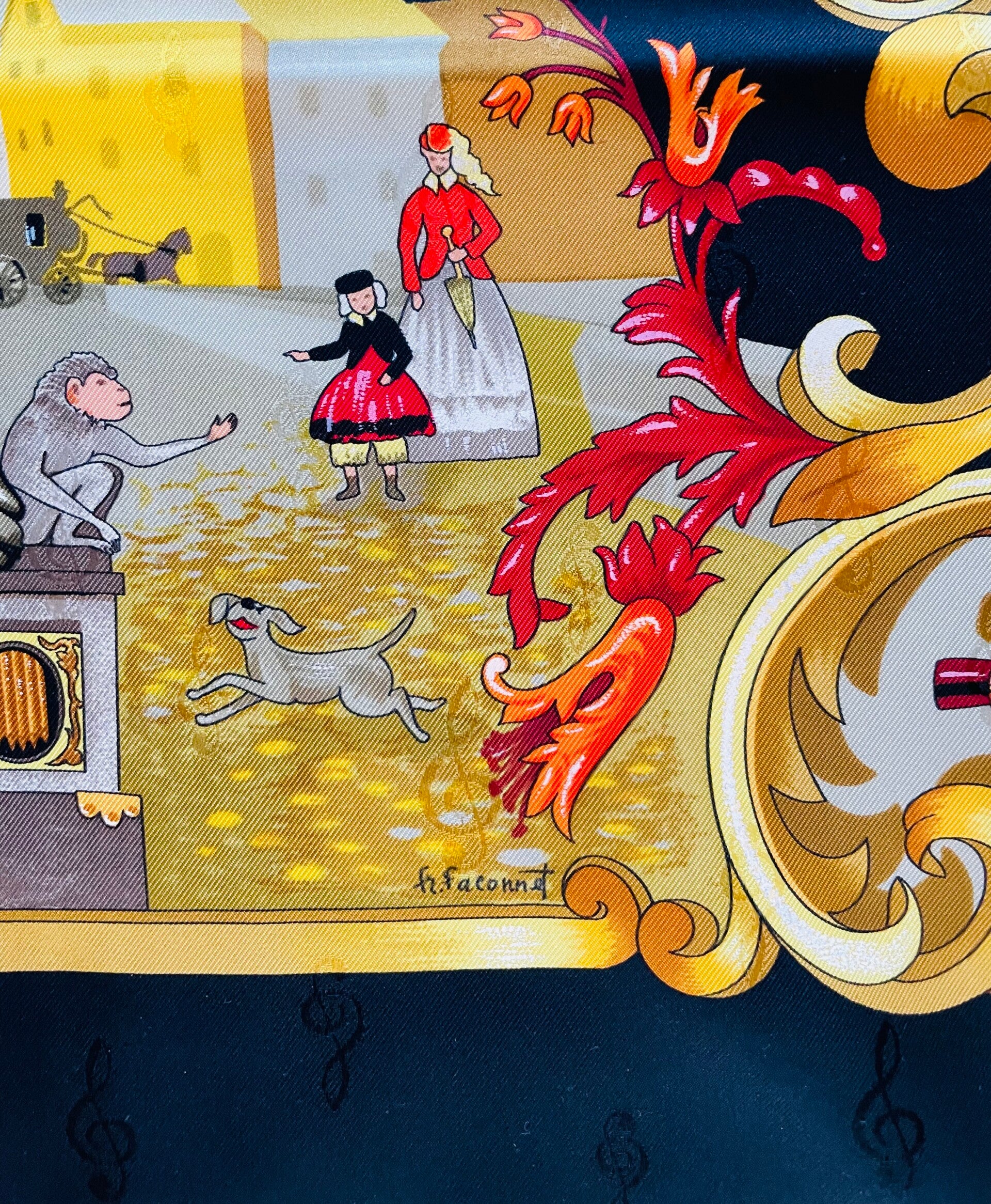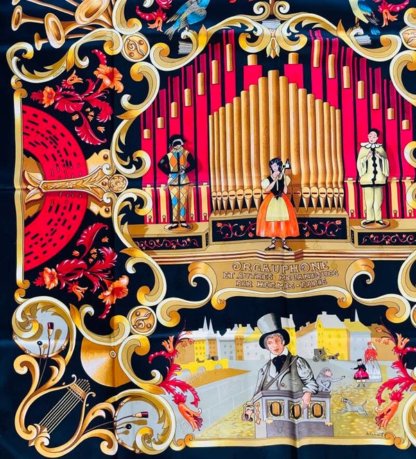 This square illustrated by Françoise Faconnet in 1996, has never been reissued. Orgauphone, a word born from the combination of the words Organ and Phone, takes us back to the time of street songs in the 19th century. Made on a Jacquart woven silk with floor keys and hand-routed edges, it is declined on a black background in shades of red, black, rust, gold... We find the title centered and the copyright at the top left. The illustrator’s signature is visible at the bottom right. This very beautiful square is sold in an original box. It is in a very good state of preservation and use, both in terms of silk and colors. Neither hole, nor task, nor thread drawn and always carries its manufacturing label. Size : 90x90 cm