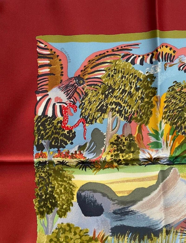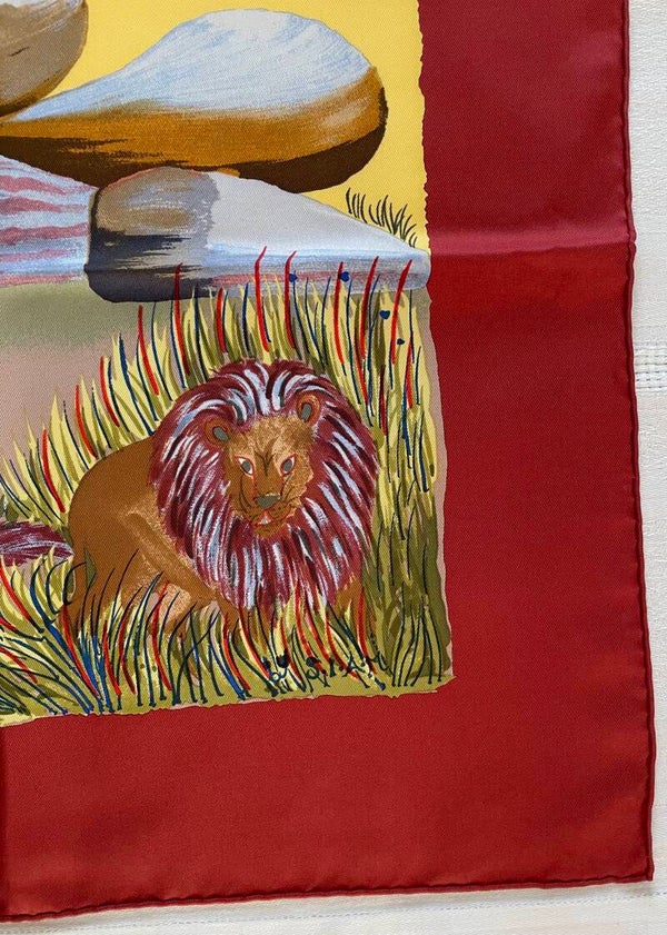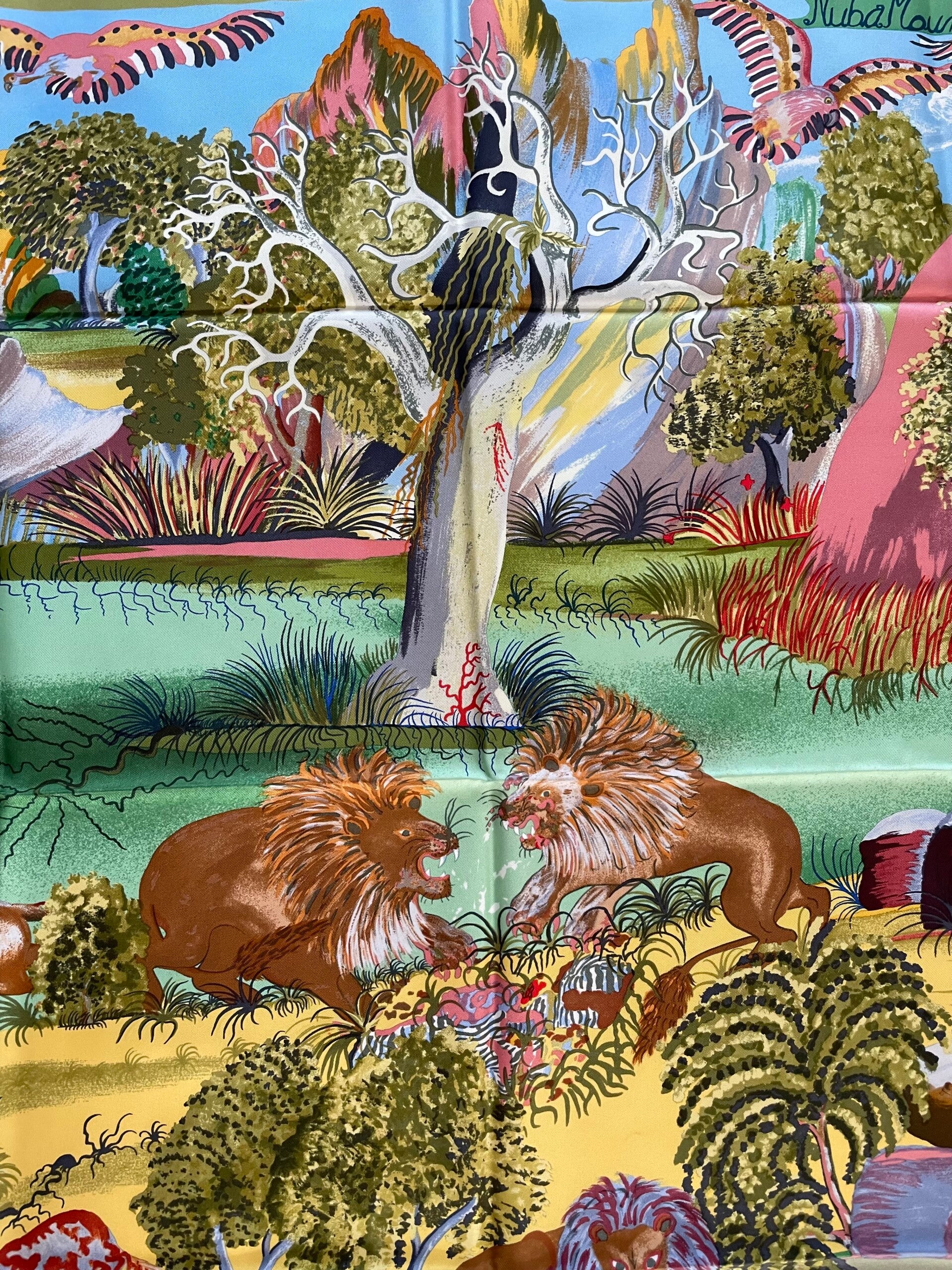 Nuba Mountain, montagne sacrée et magique des Noubas peuple du Soudan Oriental. Peuplée de fauves et d’oiseaux, la légende dit qu’elle protège et défend ses habitants contre les agresseurs. Illustré par Sefidin (I.A. Kwuni) en 1997 ce beau carré en twill de soie aux bords roulottés main, aux bordures rouille, se décline dans un camaïeu de couleurs vives et bien saturées. Le titre de cette illustration figure en haut à droite, le nom de la Maison Hermès en bas à droite proche de la signature de l’illustrateur, le copyright en haut à gauche. Il porte encore son étiquette de fabrication et vendu dans sa boite d'origine. Dimensions 90 x 90 cms. En très bon état de conservation et d’usage, tant au niveau de la soie que des couleurs. Ni trou, ni tâche, ni fil tiré. Frais d’expédition offerts pour la France. Frais d’expédition à l’international, tarif sur demande suivant la zone du pays. Visitez nos autres objets sur notre galerie Proantic le Lys et l’epée.