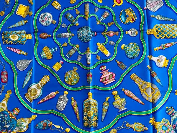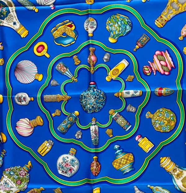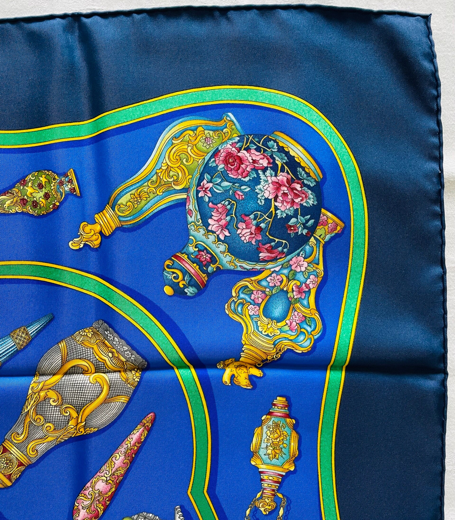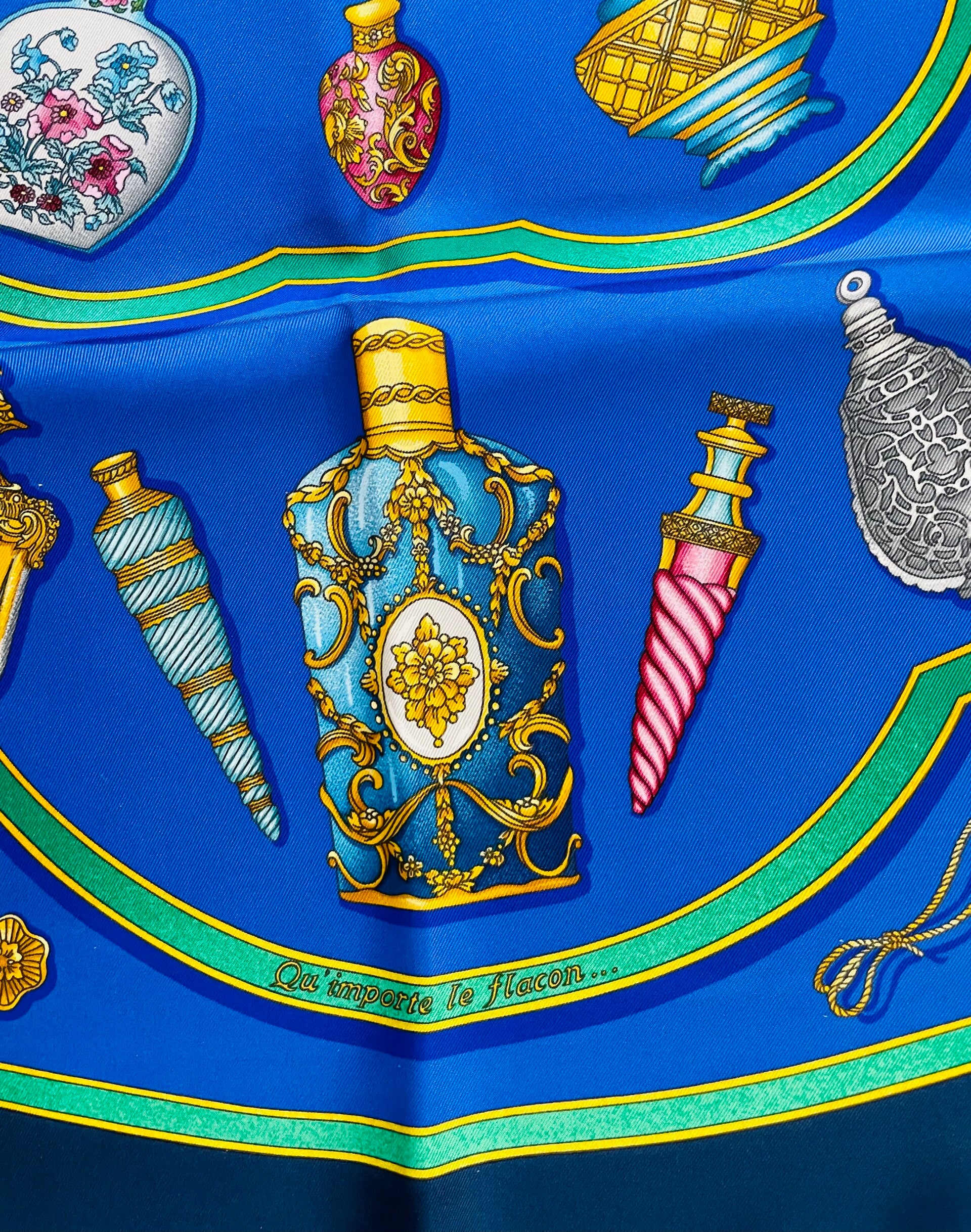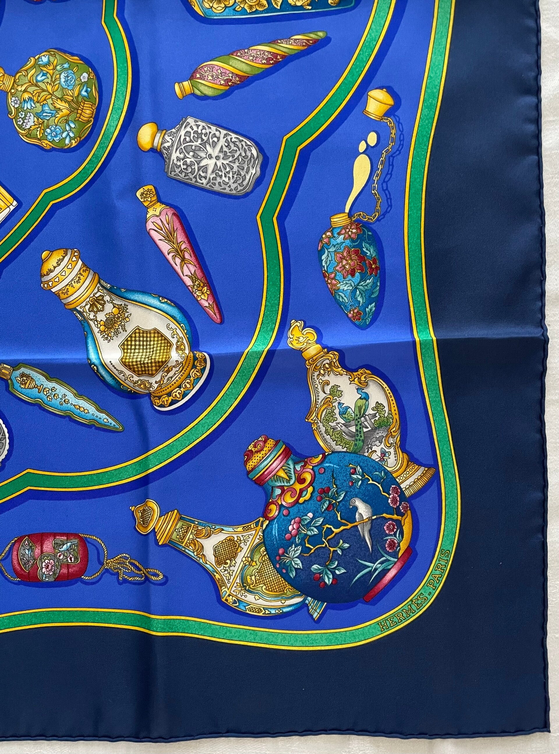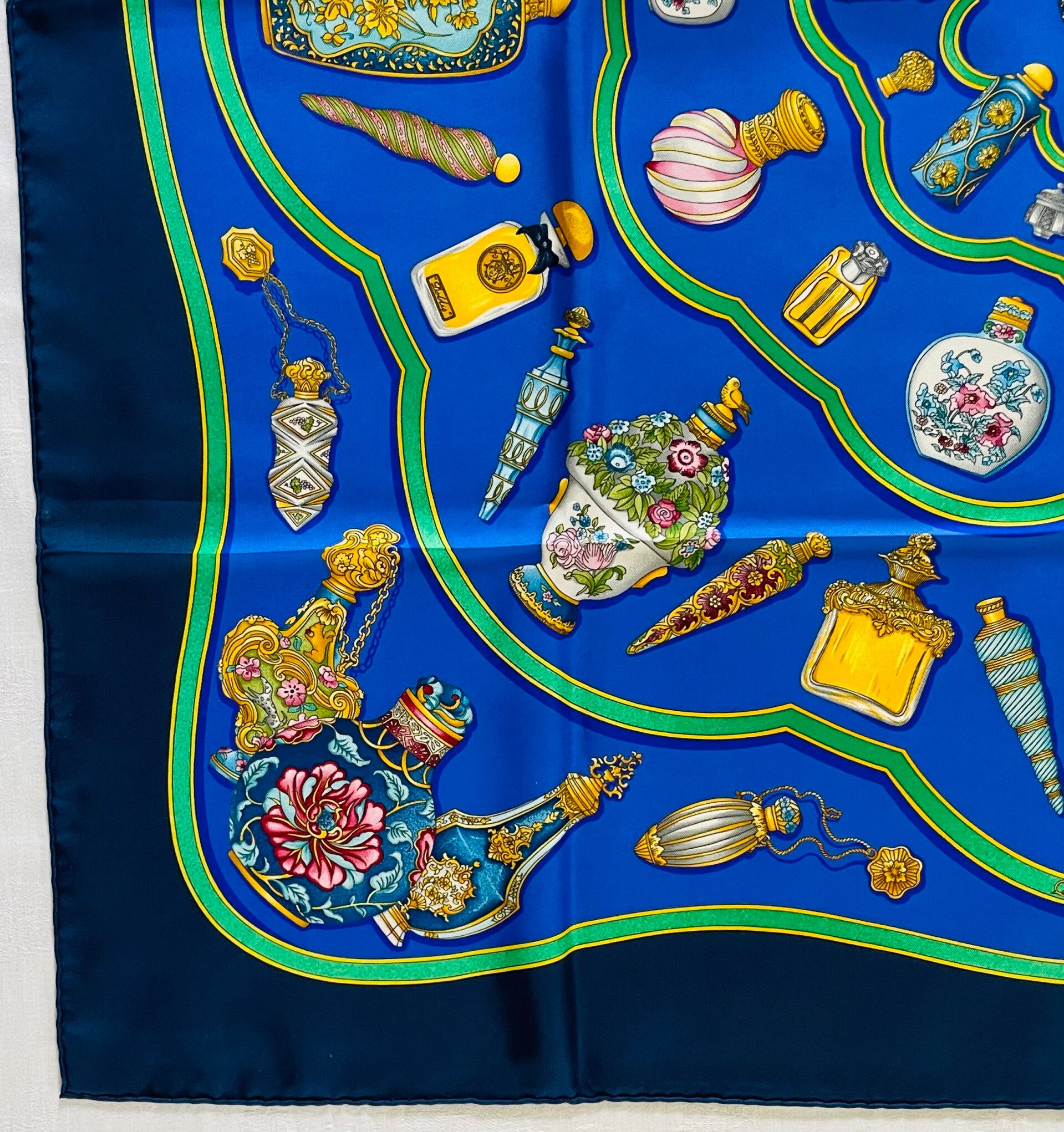 "QU’IMPORTE LE FLACON…." Qu’importe le flacon pourvu qu'on ait l’ivresse", cette belle citation d’Alfred de Musset nous entraine dans la ronde des flacons de parfum Hermès tous existants. Ce beau carré en Twill de soie aux bords roulottés bleu marine, se décline sur fond bleu roi dans un camaieu de couleurs éclatantes. Il porte encore son étiquette de fabrication. Cette illlustration par Catherine Baschet a été éditée en 1988 et rééditée 1997, l'illustratrice a su reproduire la beauté des flacons de parfum Hermès créés au fil du temps. Le titre figure cenré en haut et bas du carré, le copyright en haut à gauche et le nom de la Maison Hermès en bas à droite. En très bon état de conservation et d’usage, ni trou, ni fils tirés, les roulottés sont encore bien gonflés, voir les détails sur les photos. Ce carré est recherché par les collectionneurs, amateurs et designers d'intérieur. Dimensions 90 x 90 cms. Frais d’expédition offerts pour la France. Frais d’expédition à l’international tarif sur demande suivant la zone du pays. Visitez nos autres objets sur notre galerie Proantic le Lys et l’epée.