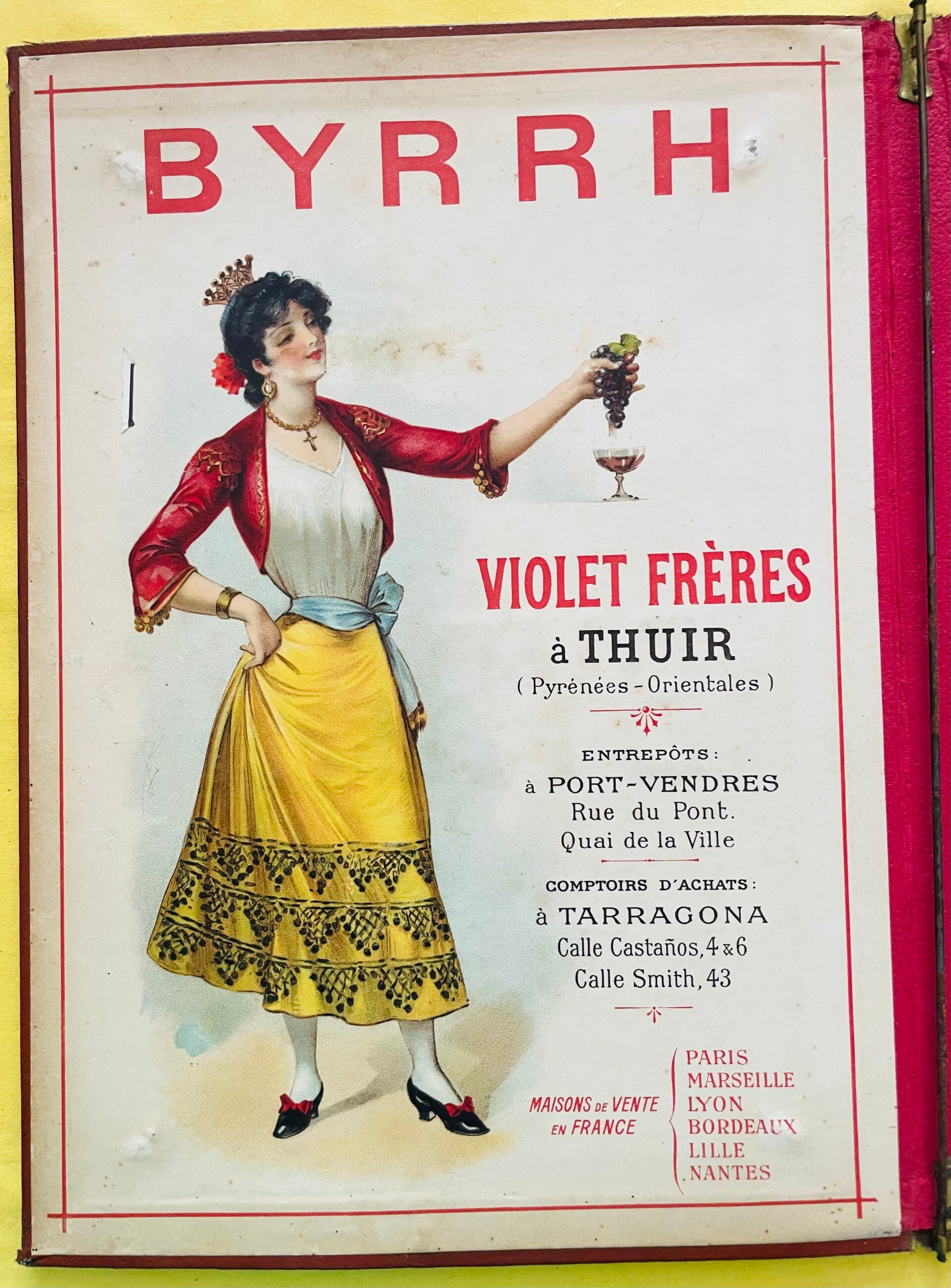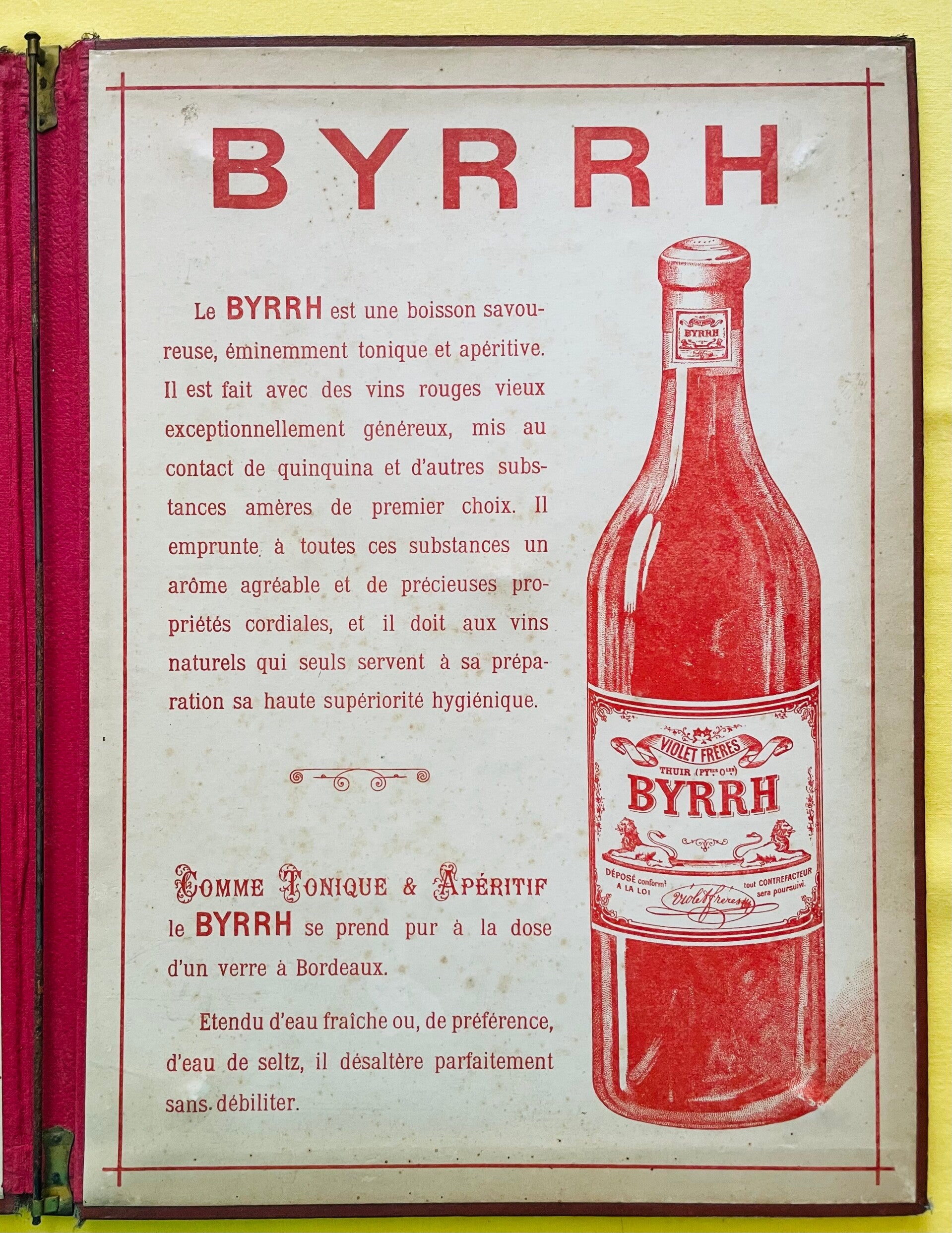 Advertising menu holder of the brand BYRRH, from the French Railways Indicator in red boiled cardboard. Inside on the left page, the BYRRH advertisement of Violet Frères in Thuir in the Eastern Pyrenees, to the right the definition of this tonic wine drunk with apeitif, or seltzer water for drinking. Good state of preservation and use despite the slightly tired but repairable edge, see details in the photos. Dimensions 27 x 37 cms. Shipping costs offered for France. International shipping costs, price on request depending on the country area.