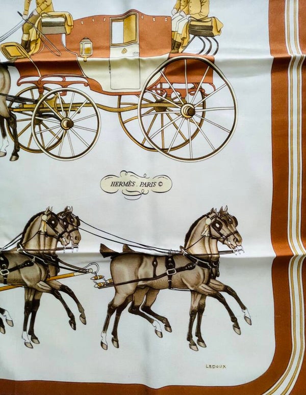 This square published in 1976 and illustrated by Philippe Ledoux has never been reissued, which makes it a rare and sought-after example by amateurs and collectors. Three teams of four horses pull a carriage intended for transport and luggage. In silk twill with hand-rolled edges at the double border sienna, ecru and yellow, it is available on an ecru background in beige, ocher, light brown colors.... The title appears in a cartouche on the left, while in a second cartouche we find the signature 'Hermès Paris with its copyright'. The name of the illustrator appears at the bottom right. Dimensions: 89 x 86 cm
