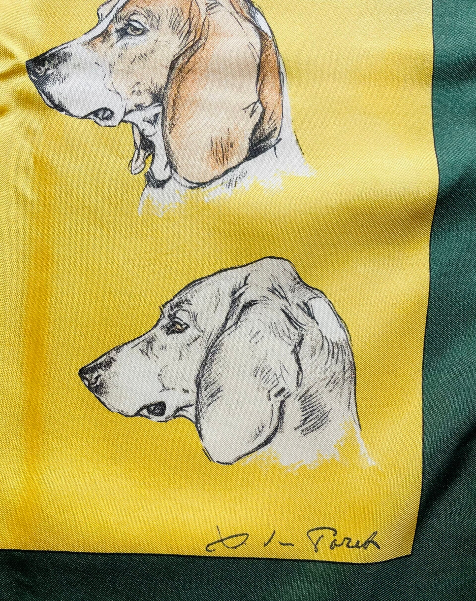In silk twill with hand-rolled edges, it is available on a bright yellow background with fir green borders and represents the heads of beagle dogs.