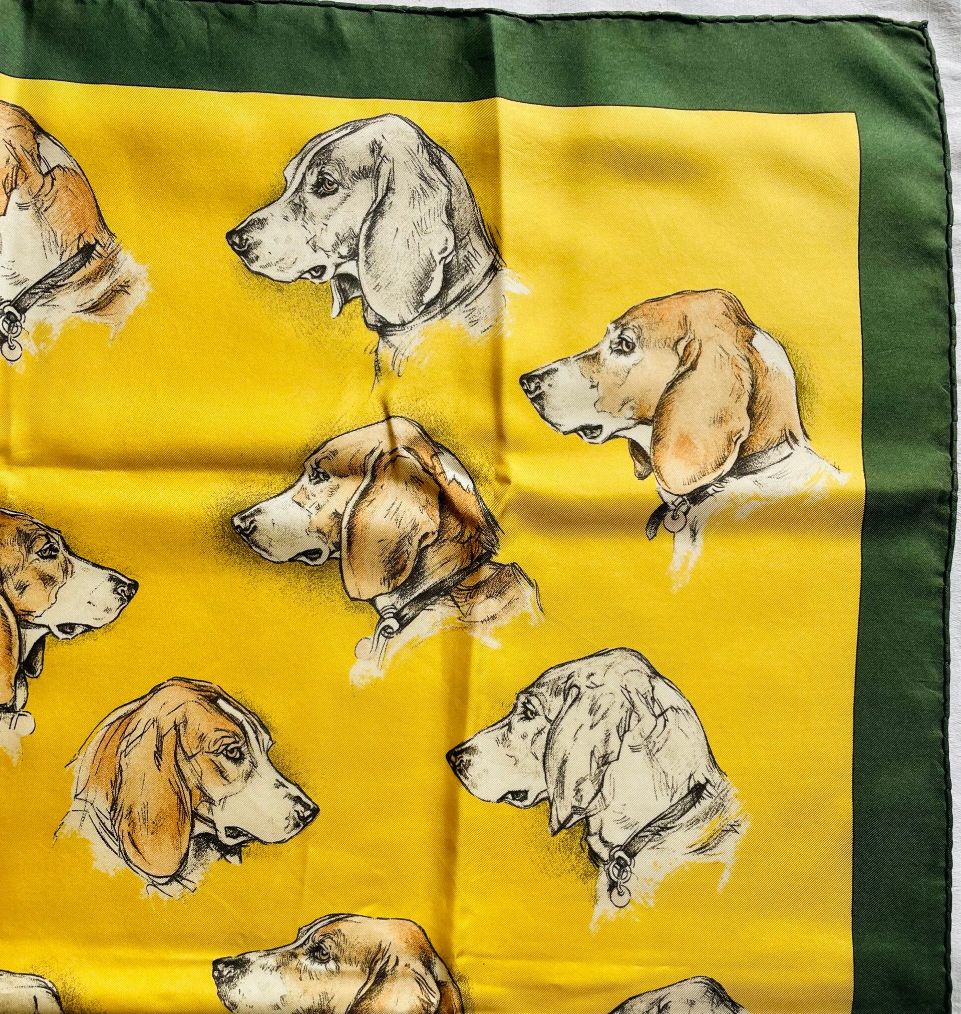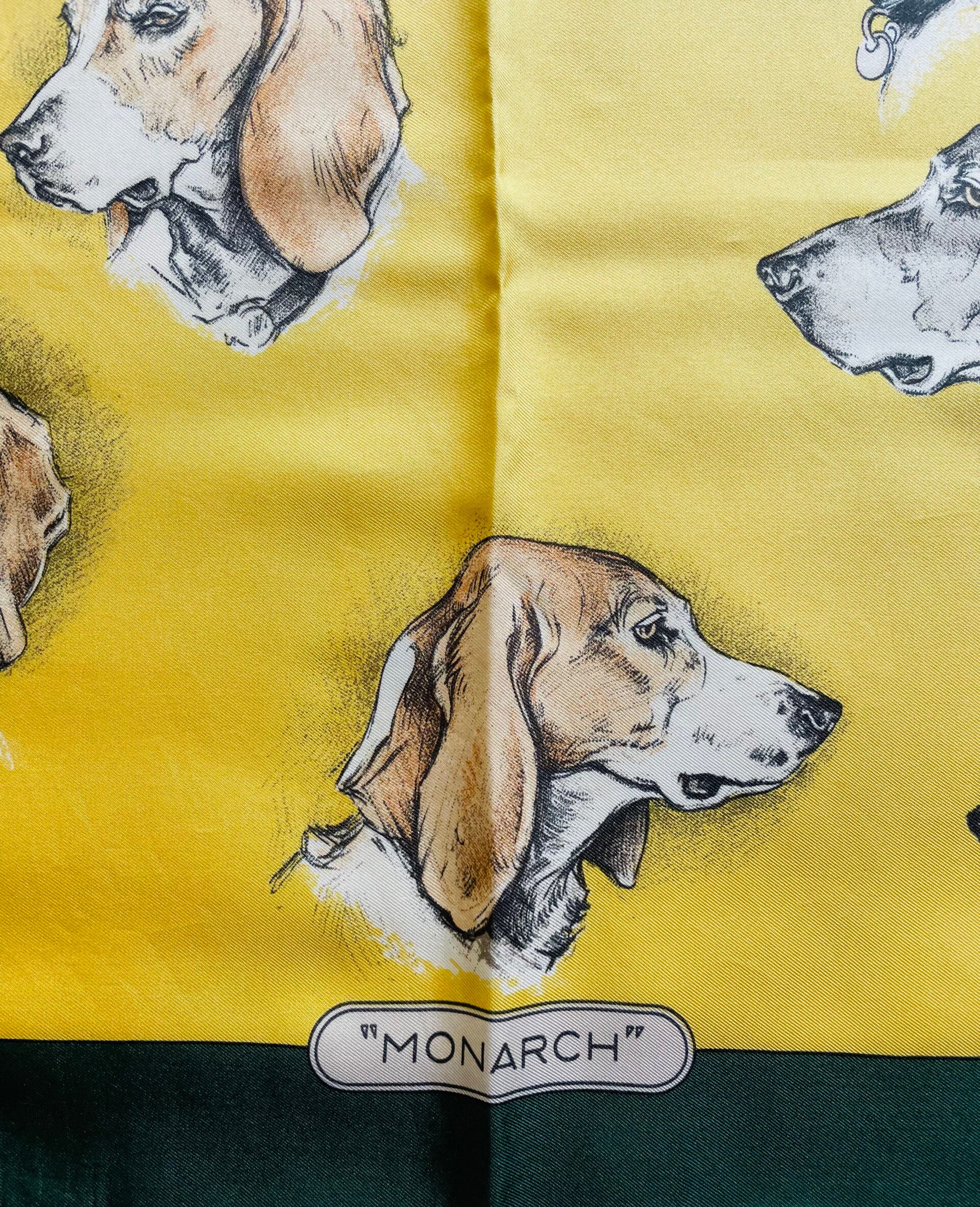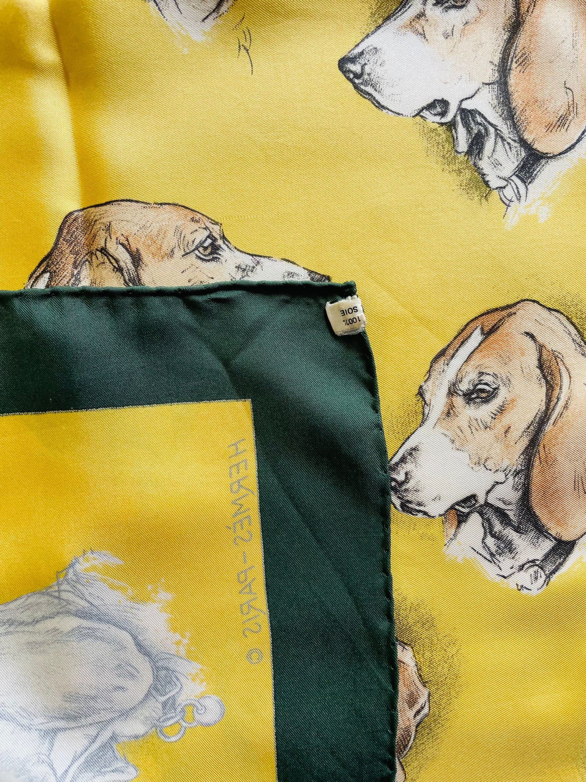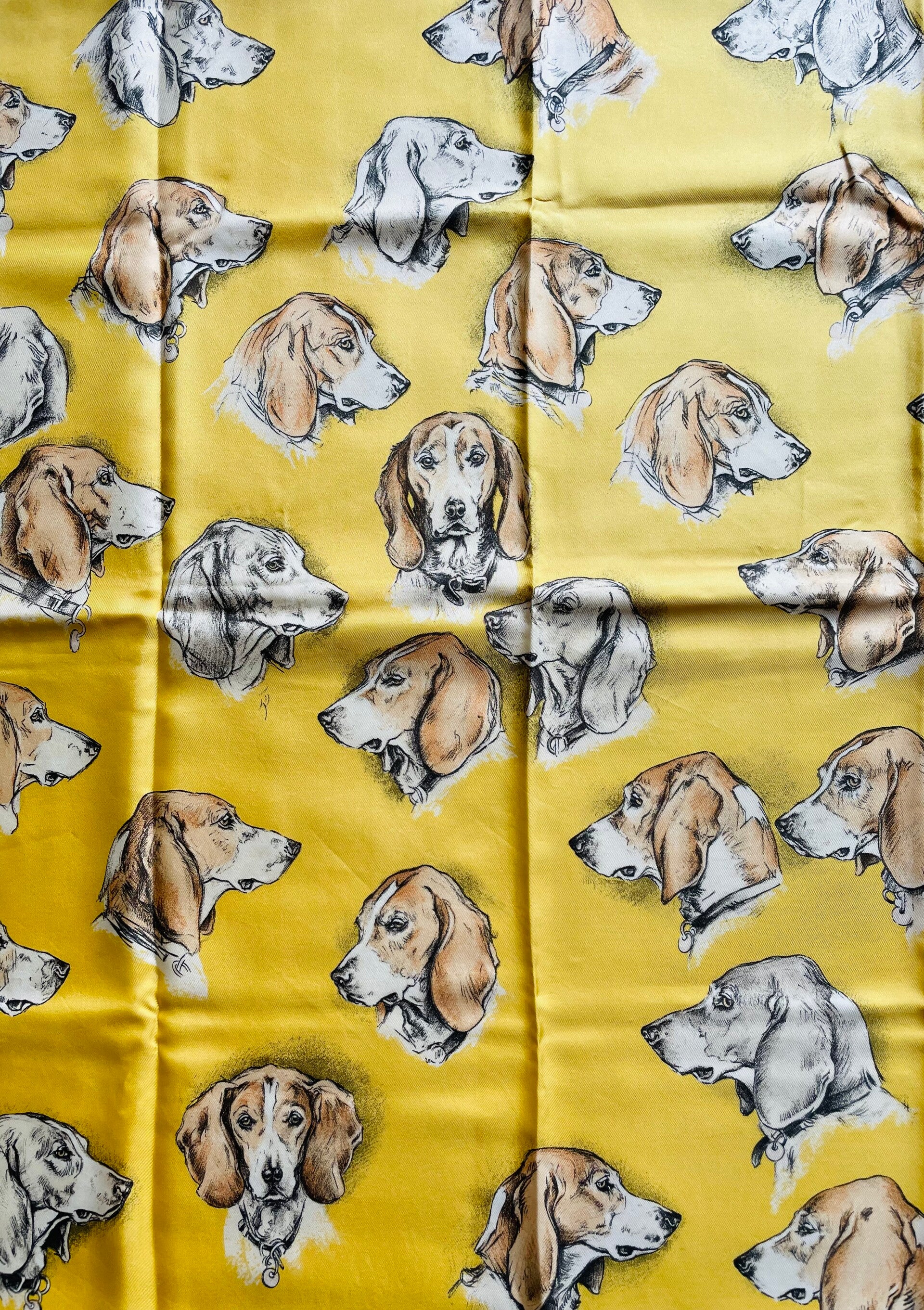 In silk twill with hand-rolled edges, it is available on a bright yellow background with fir green borders and represents beagle dog heads.