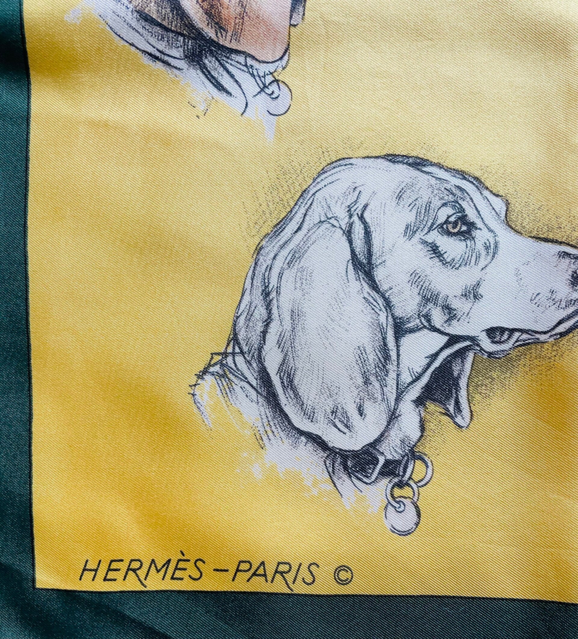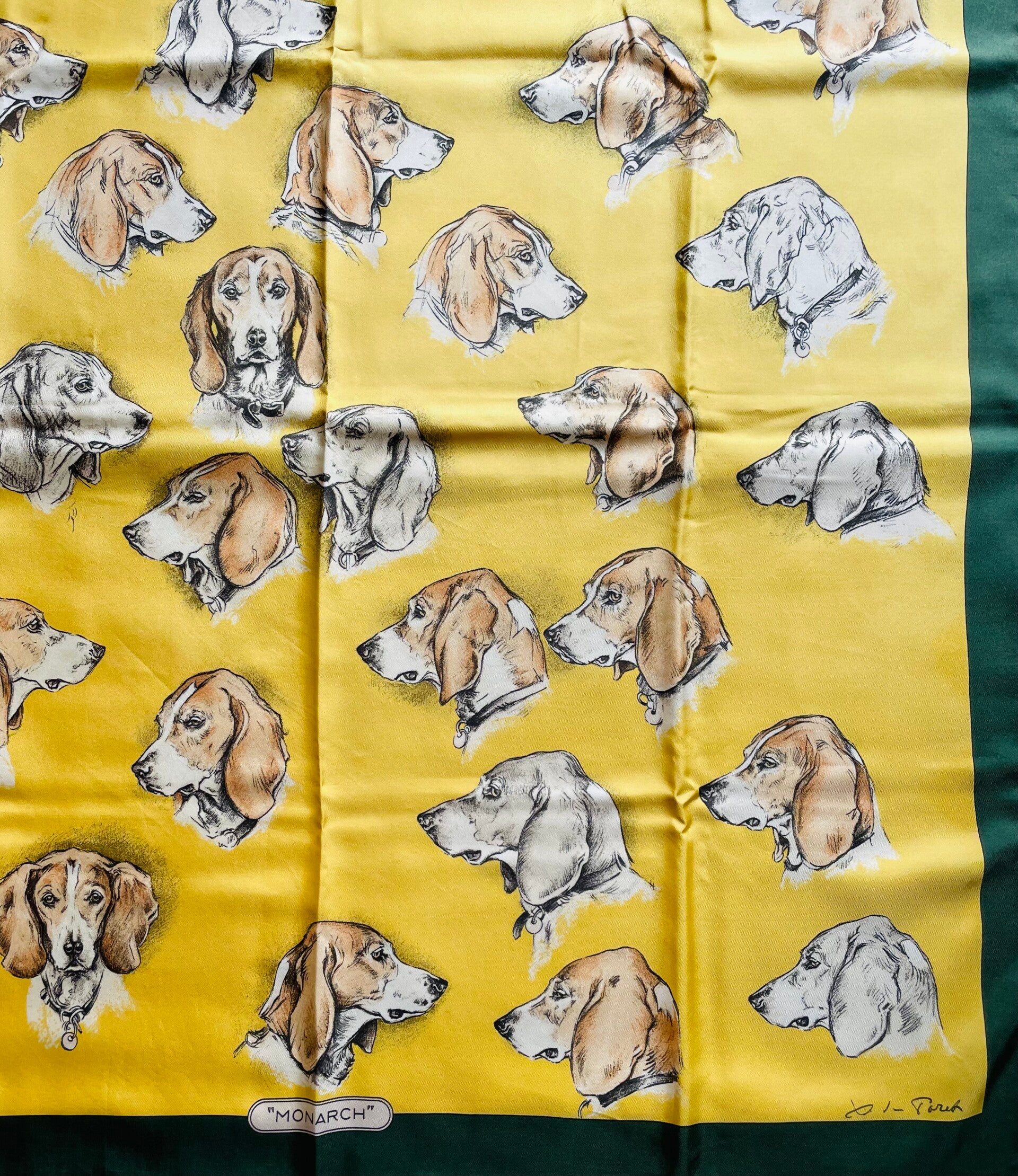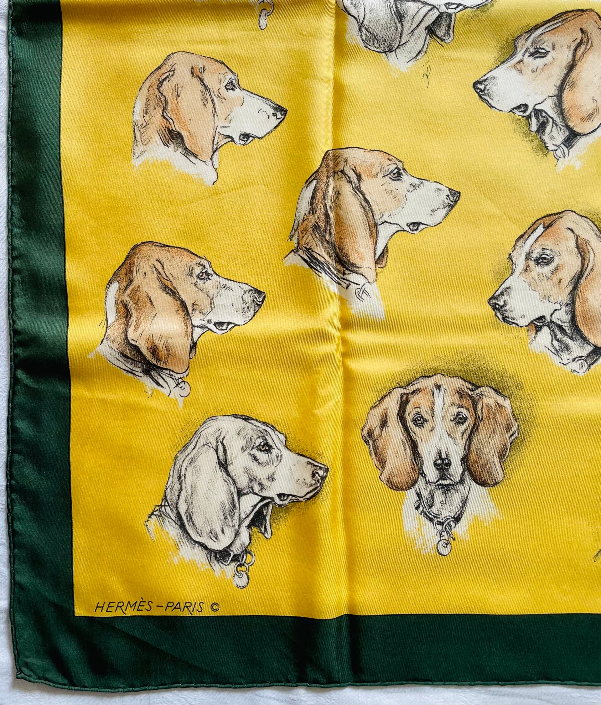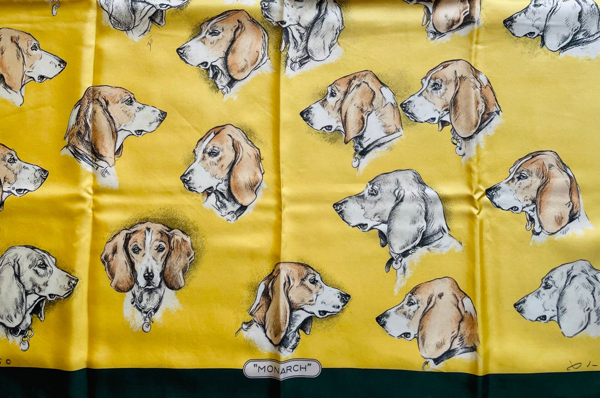In silk twill with hand-rolled edges, it is available on a bright yellow background with fir green borders and represents beagle dog heads.
