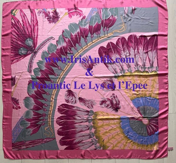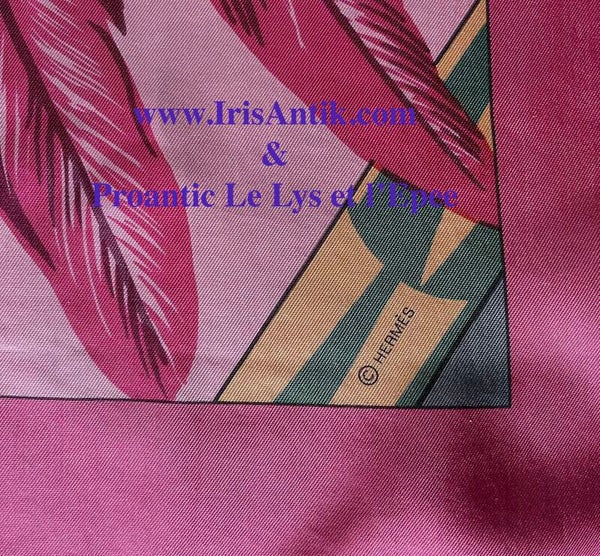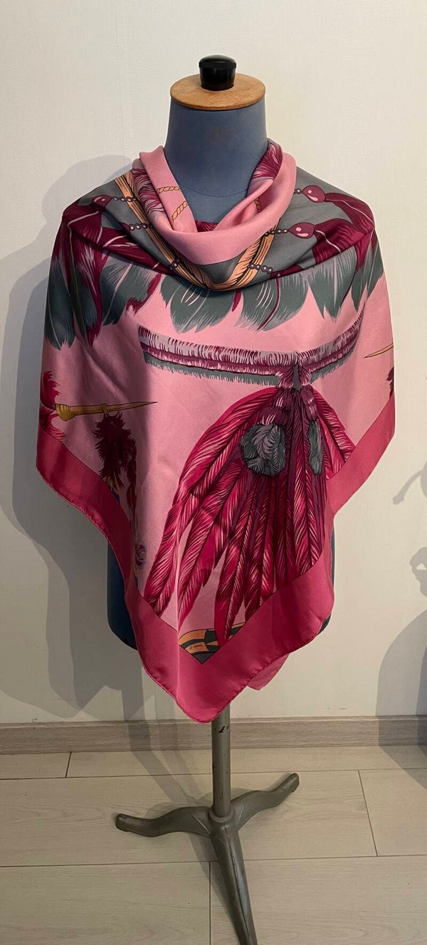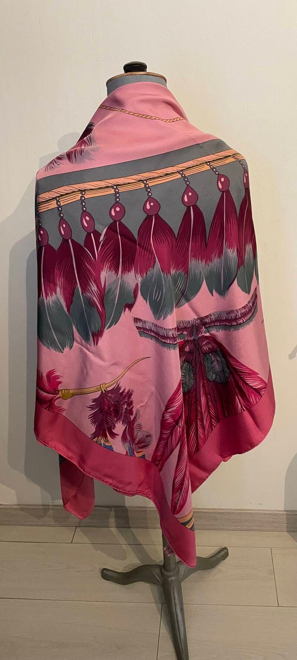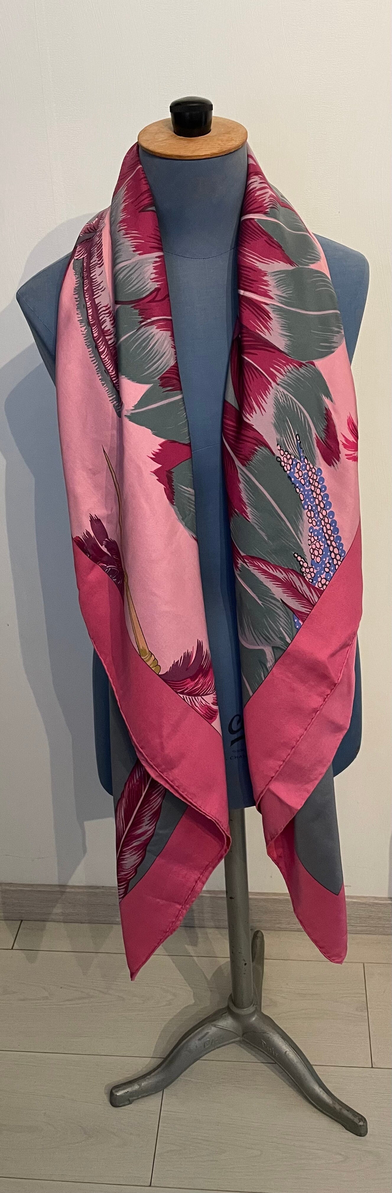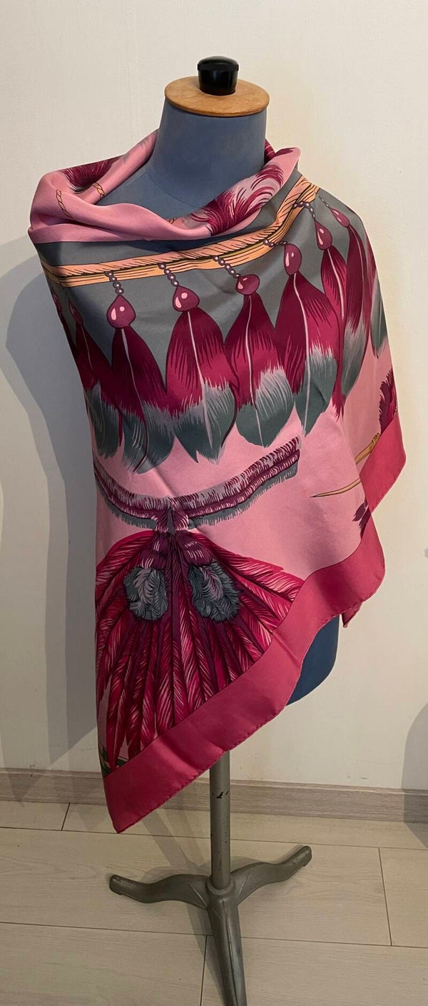 This beautiful example in silk twill with hand-rolled edges features details from the Brazil model published in 1988 by Laurence BERTHOUMIEUX. These colorful bird feathers are often found on costumes, jewelry and headdresses in the lives of Brazilians. The SURTEINT DIP DYE treatment gives it softness and velvety and vivified colors. Sold in a box. The name of the House appears at the bottom right, the copyright is found at the top left. Dimensions 140 x 140 cms. This shawl rare is in a beautiful state of origin, conservation and use. See the details on the photos.