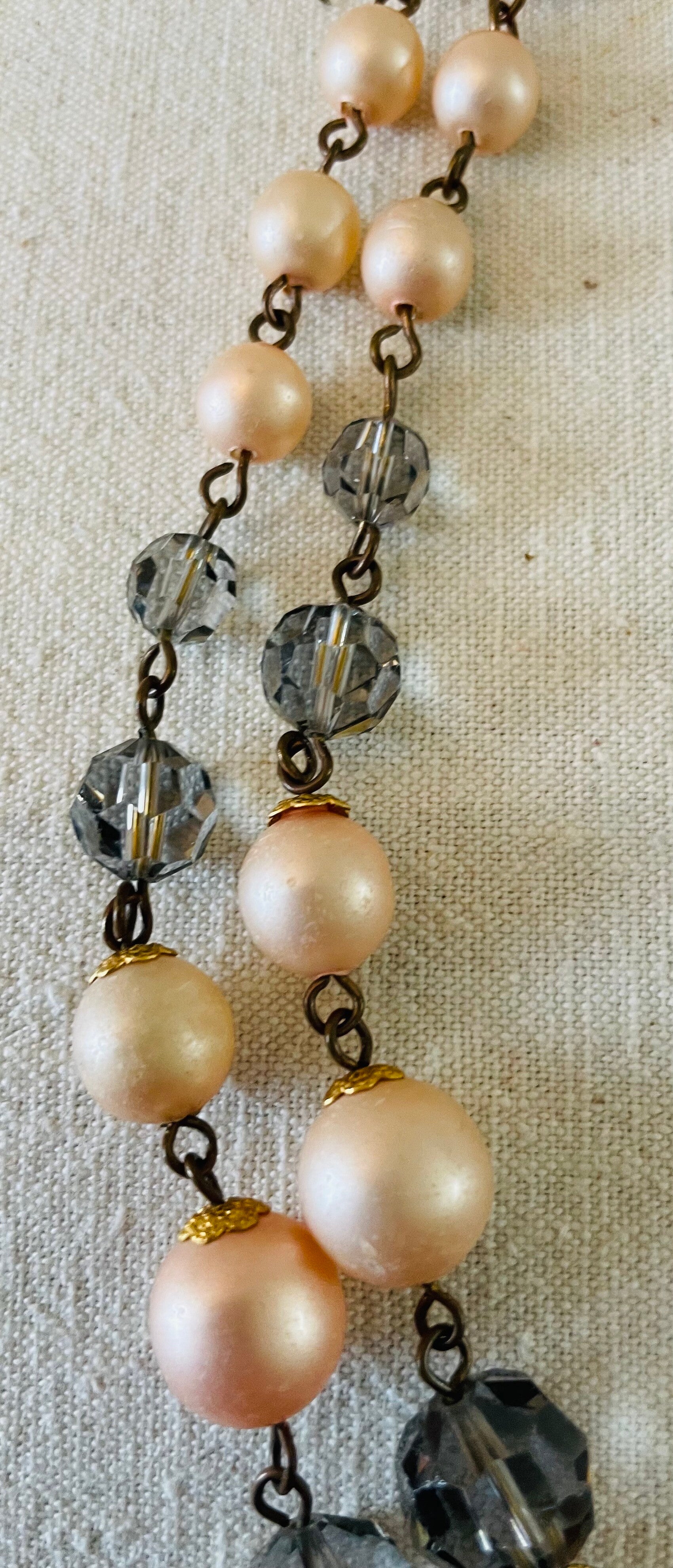 COLLIER DEUX RANGS DE PERLES NACREES ROSÉES ET PERLES VERRE GRISES de 1948