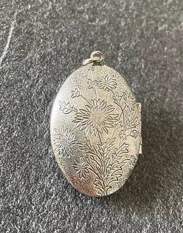 Pendentif de forme ovale, en argent bas titre filigrané extérieur et intérieur, agrémenté d’une croix et d’une pierre verte. Charnière en bon état ouvrant sur deux compartiments pouvant recevoir cheveux, photos…. Fermeture par clip fonctionnant. Anneau de bélière. Dimensions 4 x 3 cm. Poids brut 9 grs. Bon état de conservation, et d’usage, voir les détails sur les photos. Sera expédié sous emballage cadeau.