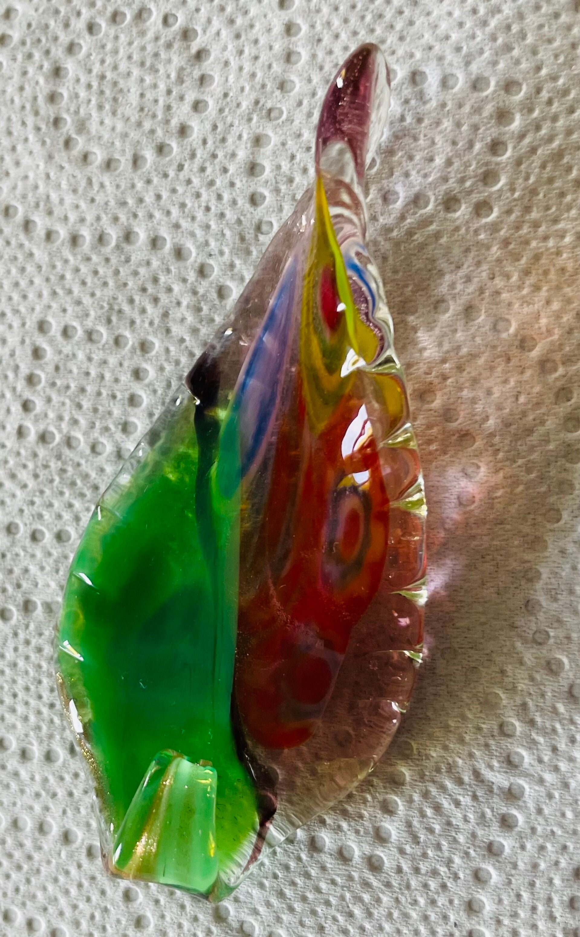Elégant pendentif en verre de Murano en forme de feuille, aux couleurs chatoyantes. La bélière fait partie de la feuille en verre. Travail Italie. Longueur 7 cm. Hauteur au plus large 3,4 cm. Poids : 19 grs. Bon état de conservation, et d’usage, voir les détails sur les photos. Sera expédié sous emballage cadeau.