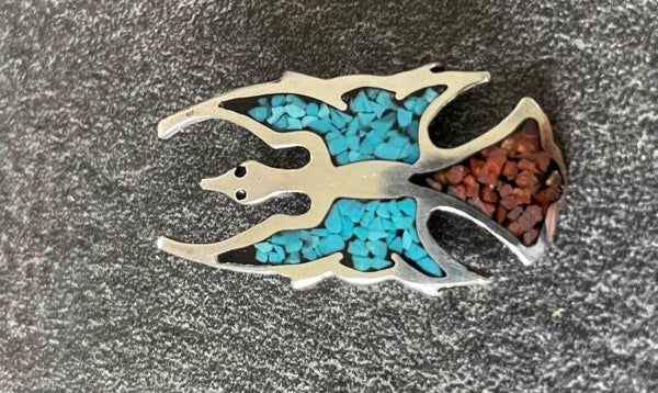 Intéressant pendentif en argent 925, émaillé représentant un dragon en vol. Travail artisanal Mexique. Dimensions : 3,5 x 2 cm. Poids : 5 grs. Bon état de conservation, et d’usage, voir les détails sur les photos. Sera expédié sous emballage cadeau.