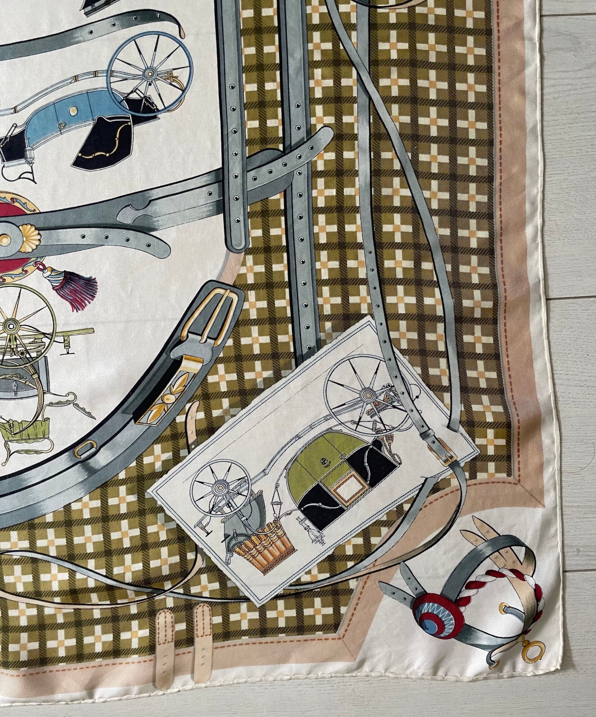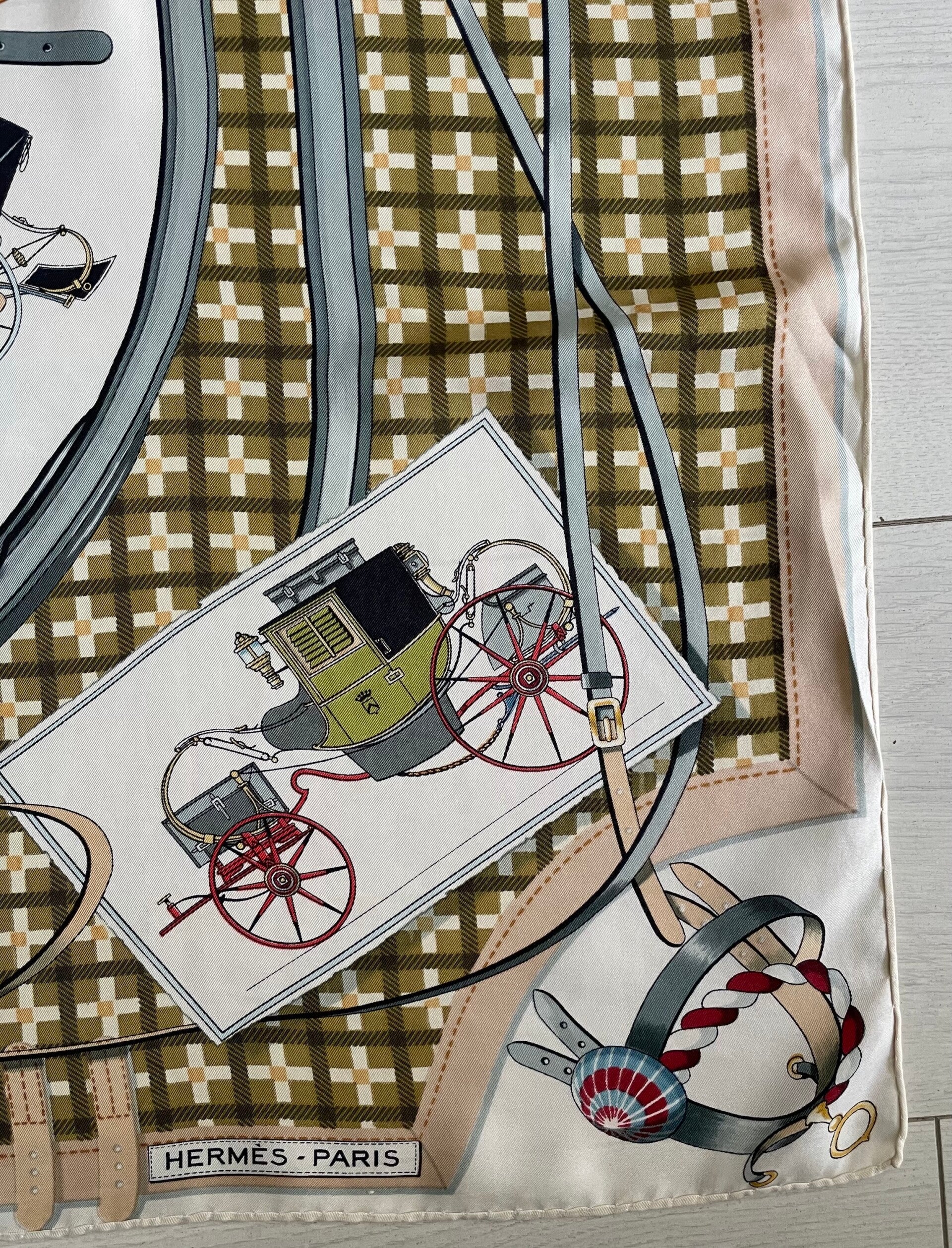 "LES VOITURES NOUVELLES" Illustré par Jacques Eudel en 1961, réédité en 1978 sur ce foulard en twill de soie aux bords roulottés main et aux bordures saumon se décline sept voitures anciennes sur un quadrillage rappelant les tissus des intérieurs des automobiles de l'époque. Sur fond ivoire ces fiacres, cabriolets, landaus et calèches semblent attendre les élégantes pour une promenade au parc. La signature de l'illustrateur figure en bas à gauche, le nom de la Maison Hermes en bas à droite et le titre de cette composition en bas au centre. A noter le copyright bien caché dans l'angle à gauche du décor. En bel état de conservation et d'usage compte tenu de son ancienneté, tant au niveau de la soie que des couleurs encore vives et bien saturees. (Voirphotos).Dimensions : 86,5 X 91 cm