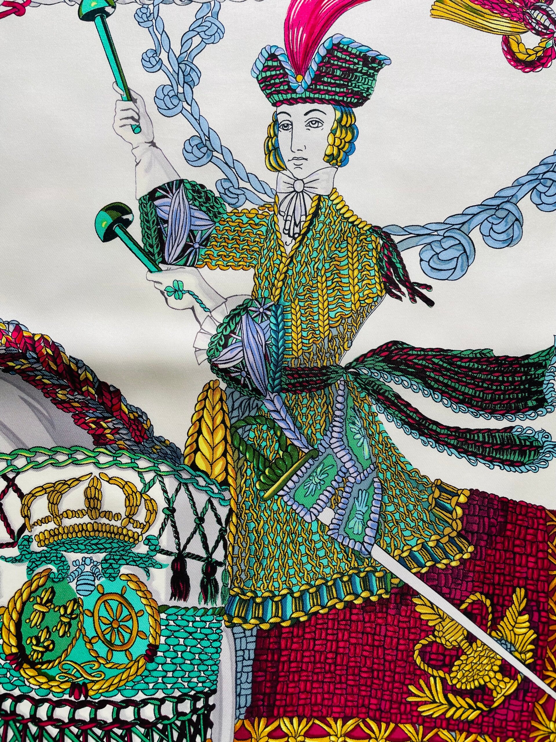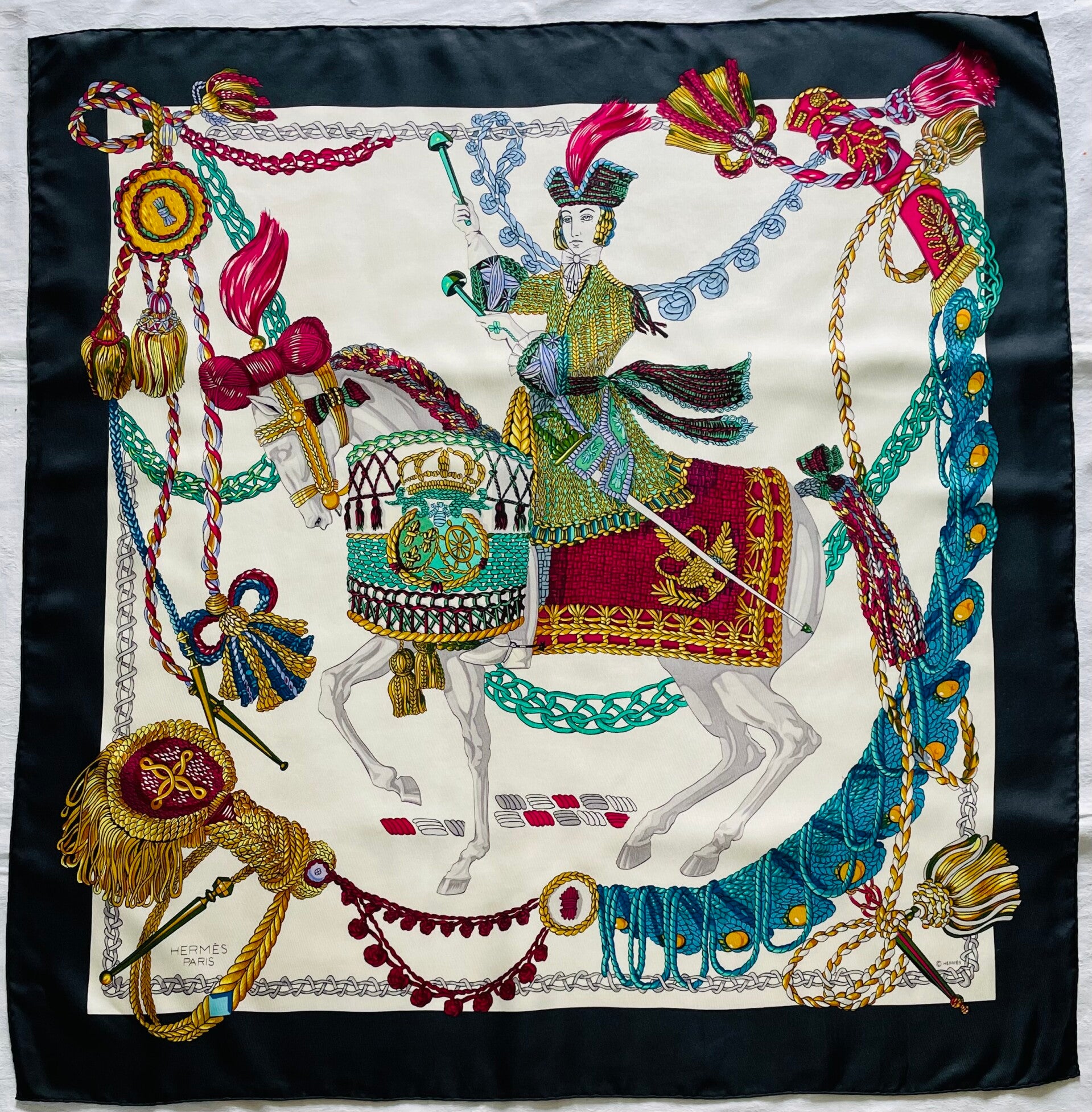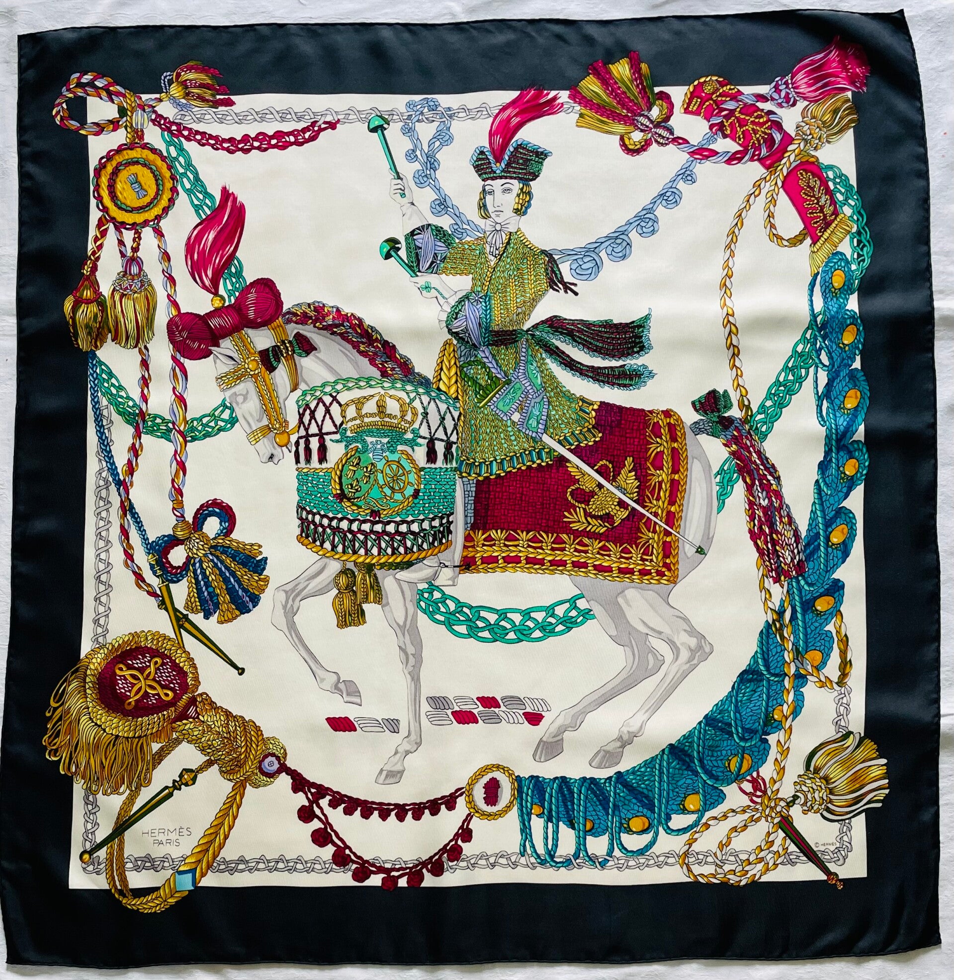 Un intemporel, toujours apprécié pour ses couleurs et son design qui représente la statue du Timbalier ce cavalier qui veille sur le toit de la maison Maison Hermès rue du Faubourg saint Honoré depuis tant d’années. Le Timbalier personnage à cheval qui dirige son animal avec fermeté, ses mains devant rester libres pour actionner les timbales et annoncer sa venue. Belle composition au milieu de pompons, épaulettes, passementerie, ce carré a été illustré par Françoise Héron en 1961 et réédité en 2001 et 2010.