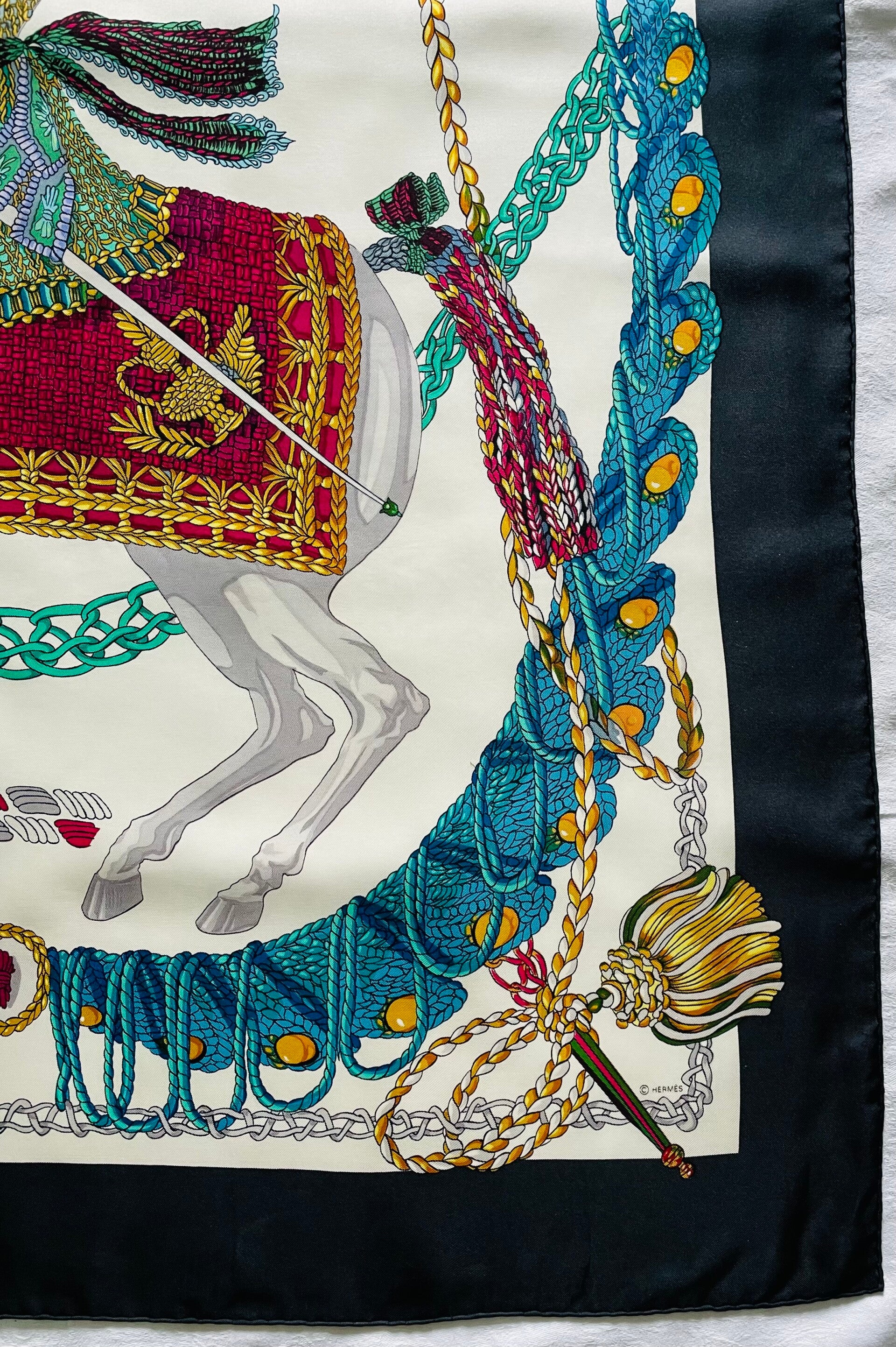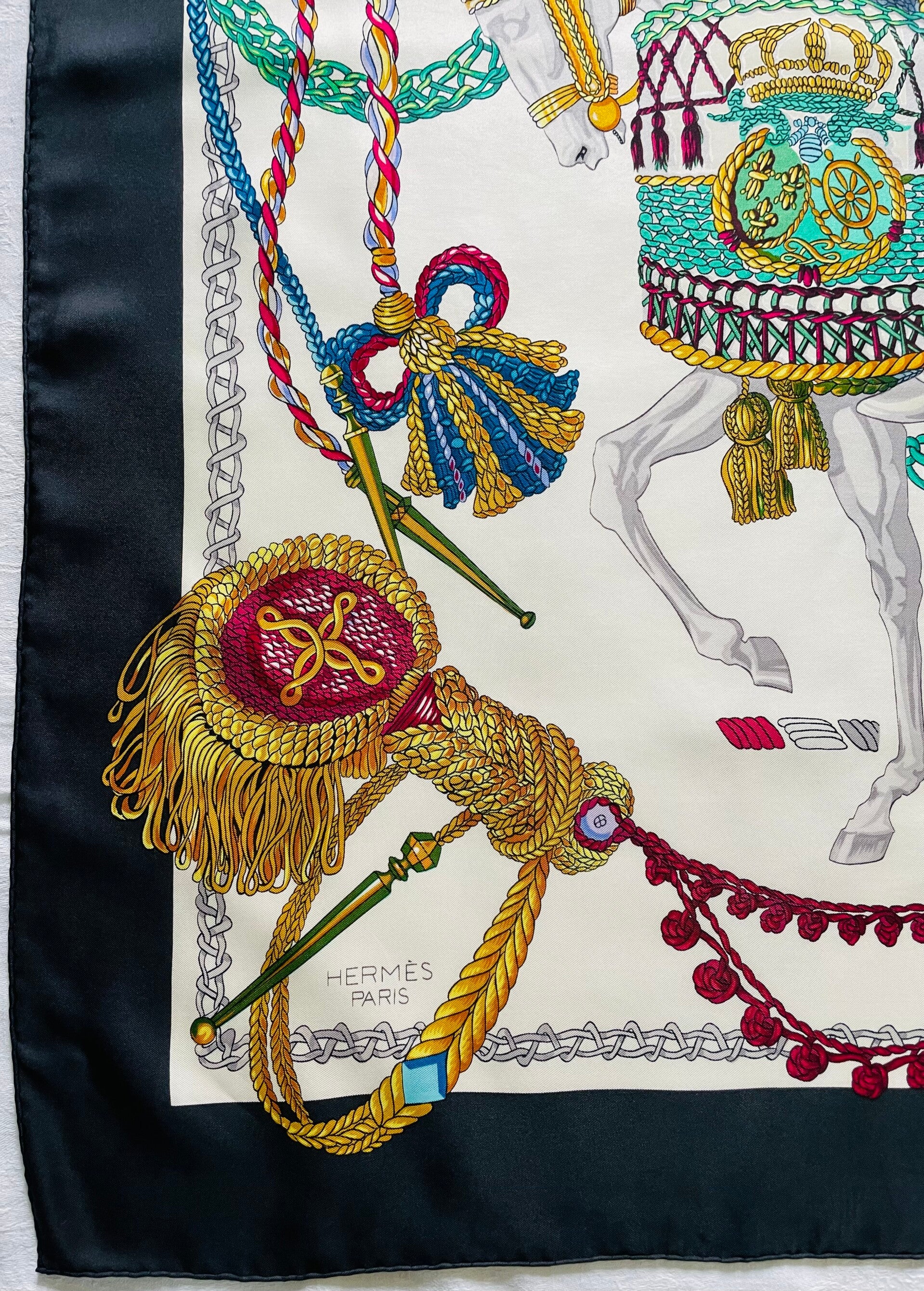In silk twill with hand-rolled edges and black borders, this beautiful copy is available on an off-white background in shades of blue, turquoise, green, red, gold, with still bright and shimmering colors. Bears its copyright at the bottom right and the name of the house 'Hermès Paris' on the left. Dimensions: 90 x 90 cm. Very good condition of origin, use and conservation, no hole, nor drawn thread, bright and well saturated colors, the silk is in beautiful condition. Sold with its Hermès box, see the details in the photos.