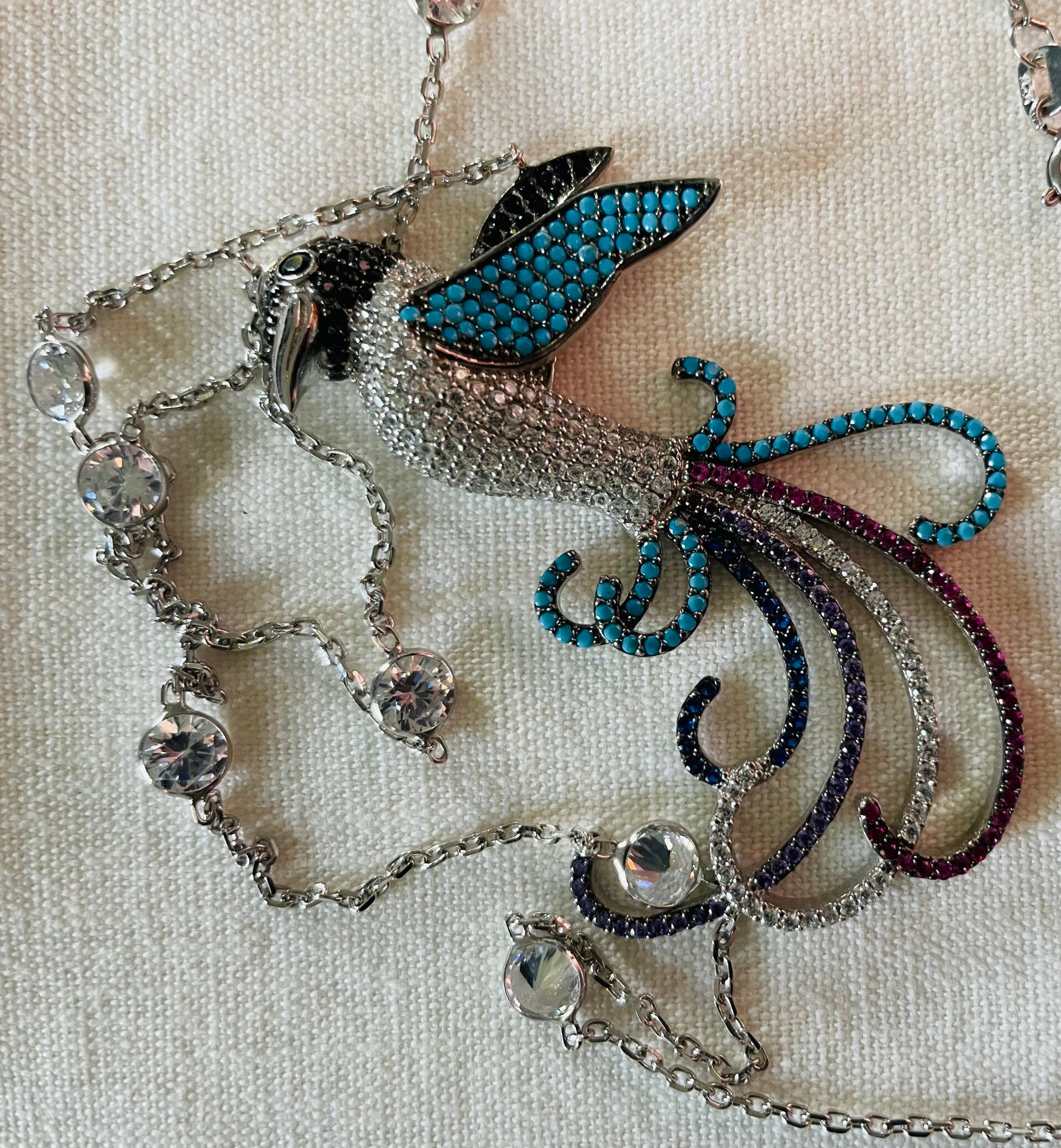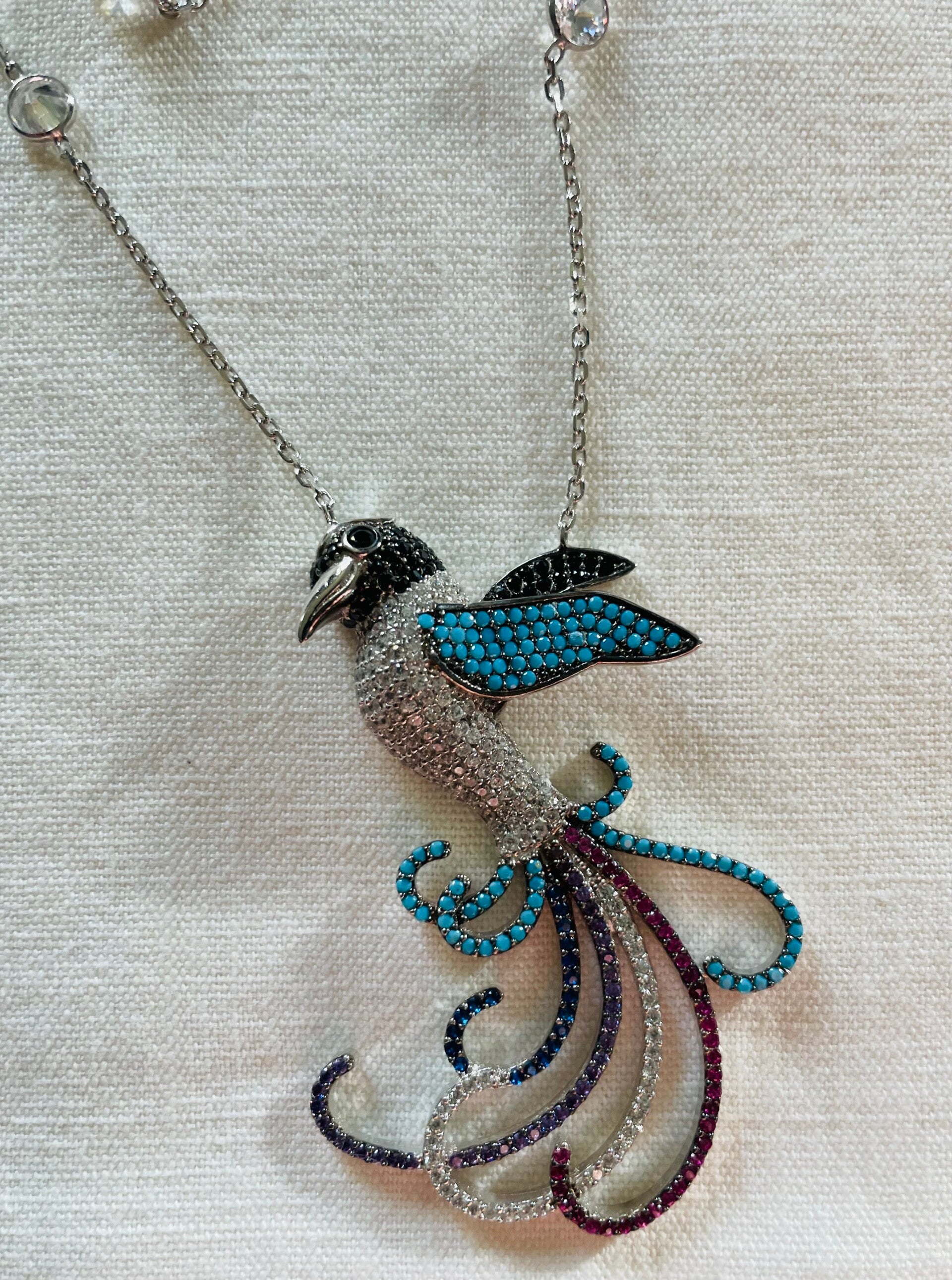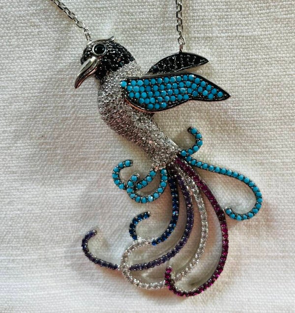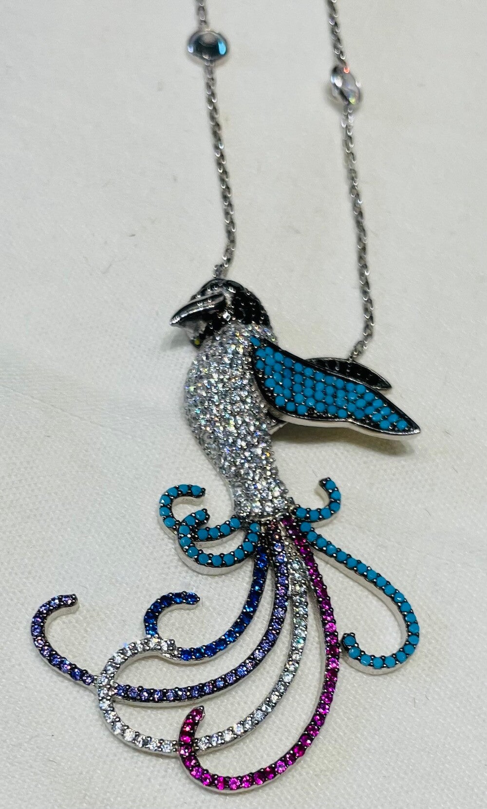 PENDENTIF OISEAU DE PARADIS EN ARGENT 925, TURQUOISES, CRISTAL ET SA CHAINE