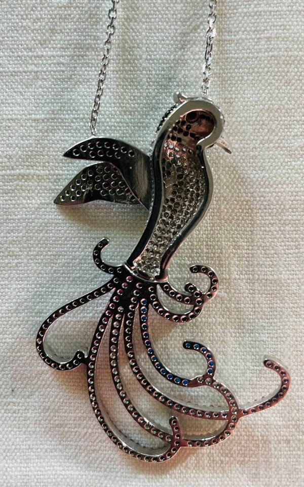Très élégant pendentif en argent 925 avec sa chaine, représentant un Oiseau de Paradis serti main de turquoise et de pierres de cristal de couleurs. La chaine à maillons comporte 12 pierres de cristal rappelant le corps de l’oiseau. Longueur totale du fermoir aux plumes 35 cms - Longueur chaine ouverte 62 cms - Hauteur de l’oiseau : 5,5 cms. Le poinçon se trouve au niveau de l’anneau rectangulaire du fermoir. Poids 14 grs. Très bon état de conservation et d'usage, voir les détails sur les photos. Sera expédié sous emballage cadeau.
