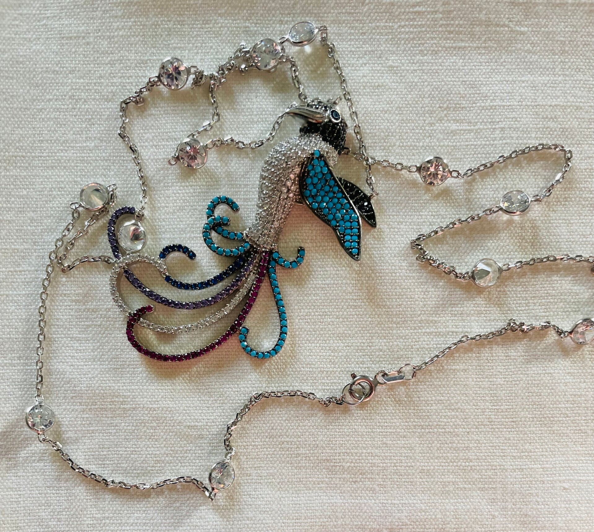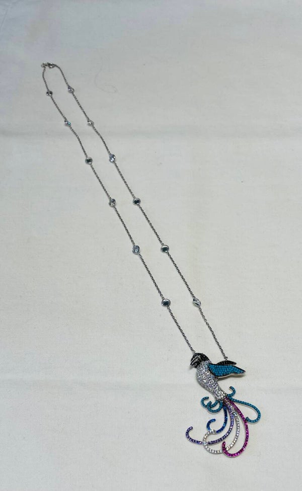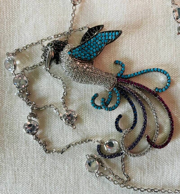 Very elegant 925 silver pendant with its chain, representing a Bird of Paradise set hand turquoise and crystal stones of colors. The link chain has 12 crystal stones reminiscent of the bird’s body. Total length of the clasp with feathers 35 cms - Open chain length 62 cms - Bird height: 5.5 cms. The punch is located at the level of the rectangular ring of the clasp. Weight 14 grs. Very good state of conservation and use, see details in the photos.