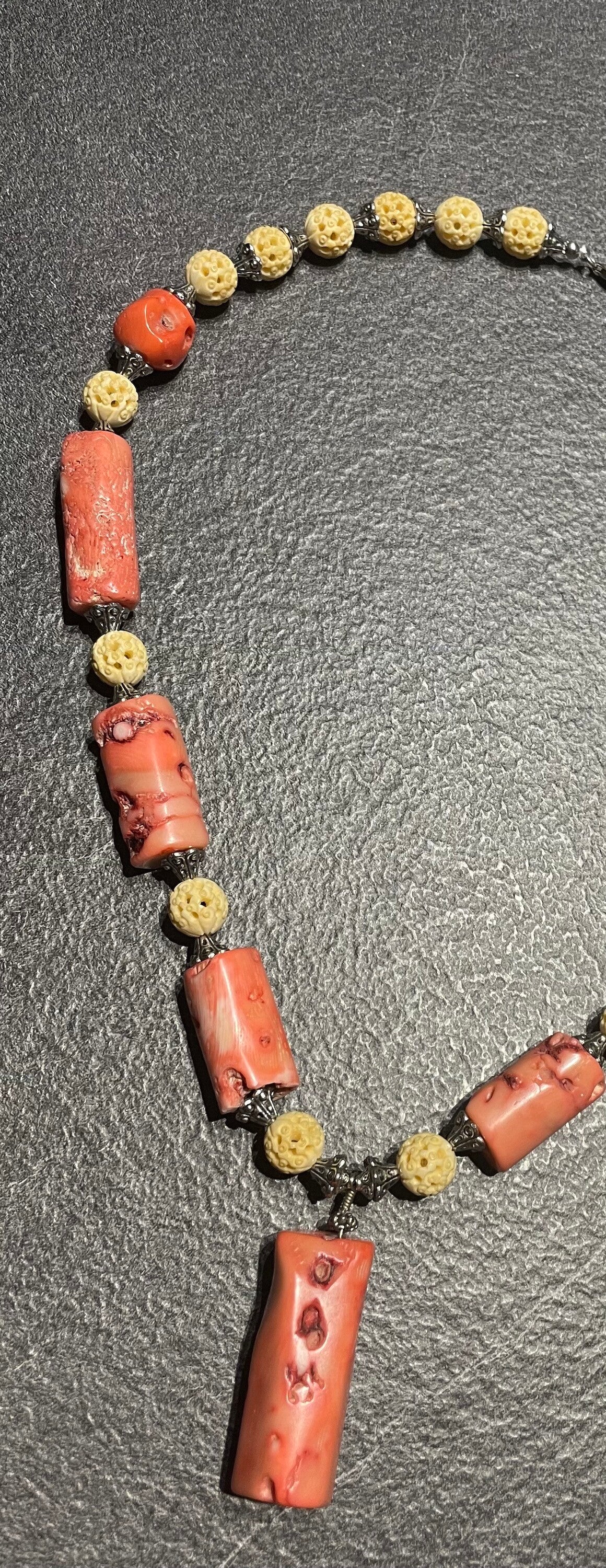 Important necklace composed of large raw coral stones and finely crafted bone beads interspersed with silver separator beads with a coral piping at its center.