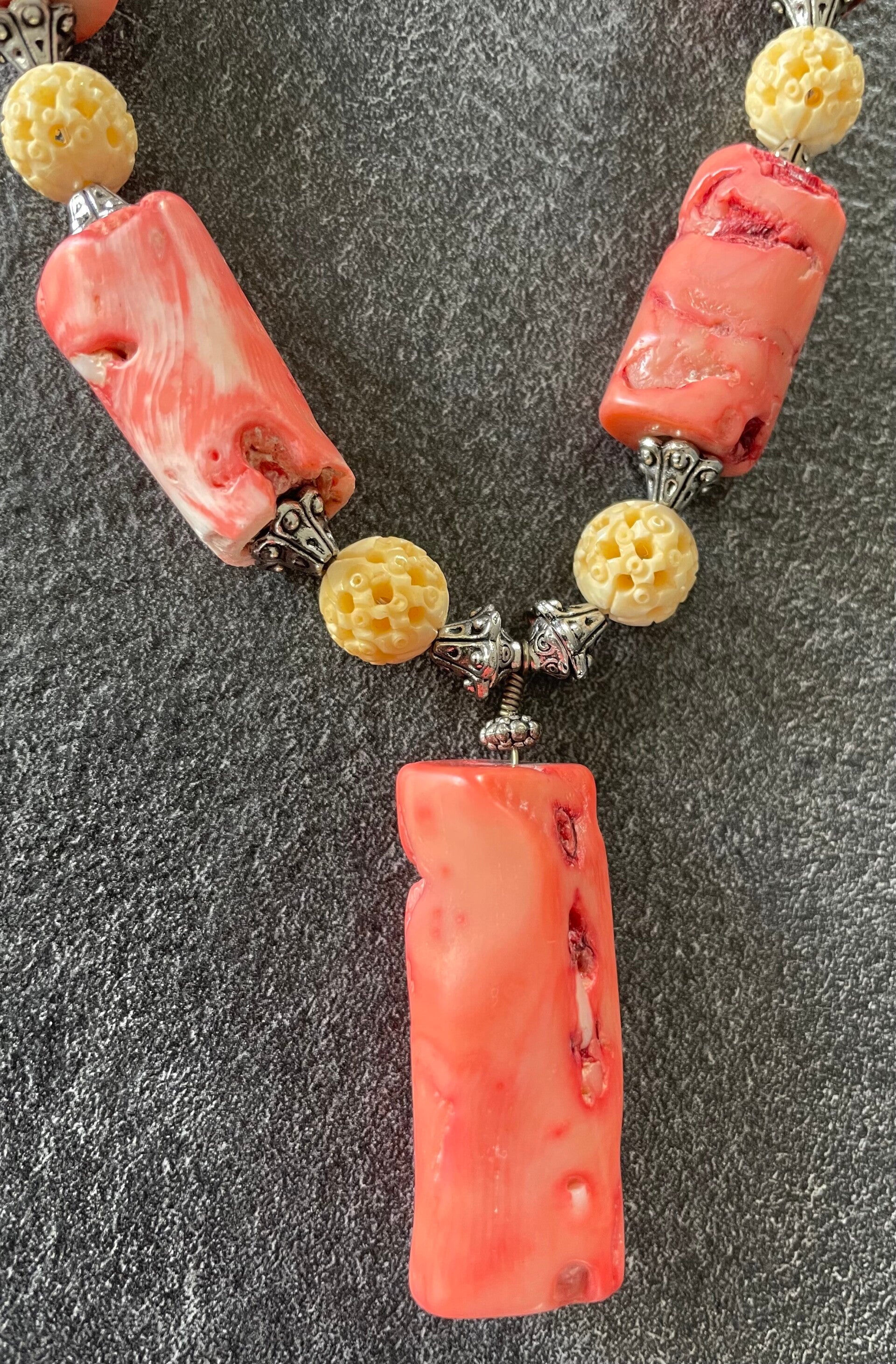Important collier composé de grosses pierres de corail brut et perles en os finement travaillées intercalées par des perles séparatrices en argent avec en son centre une pampille de corail.
