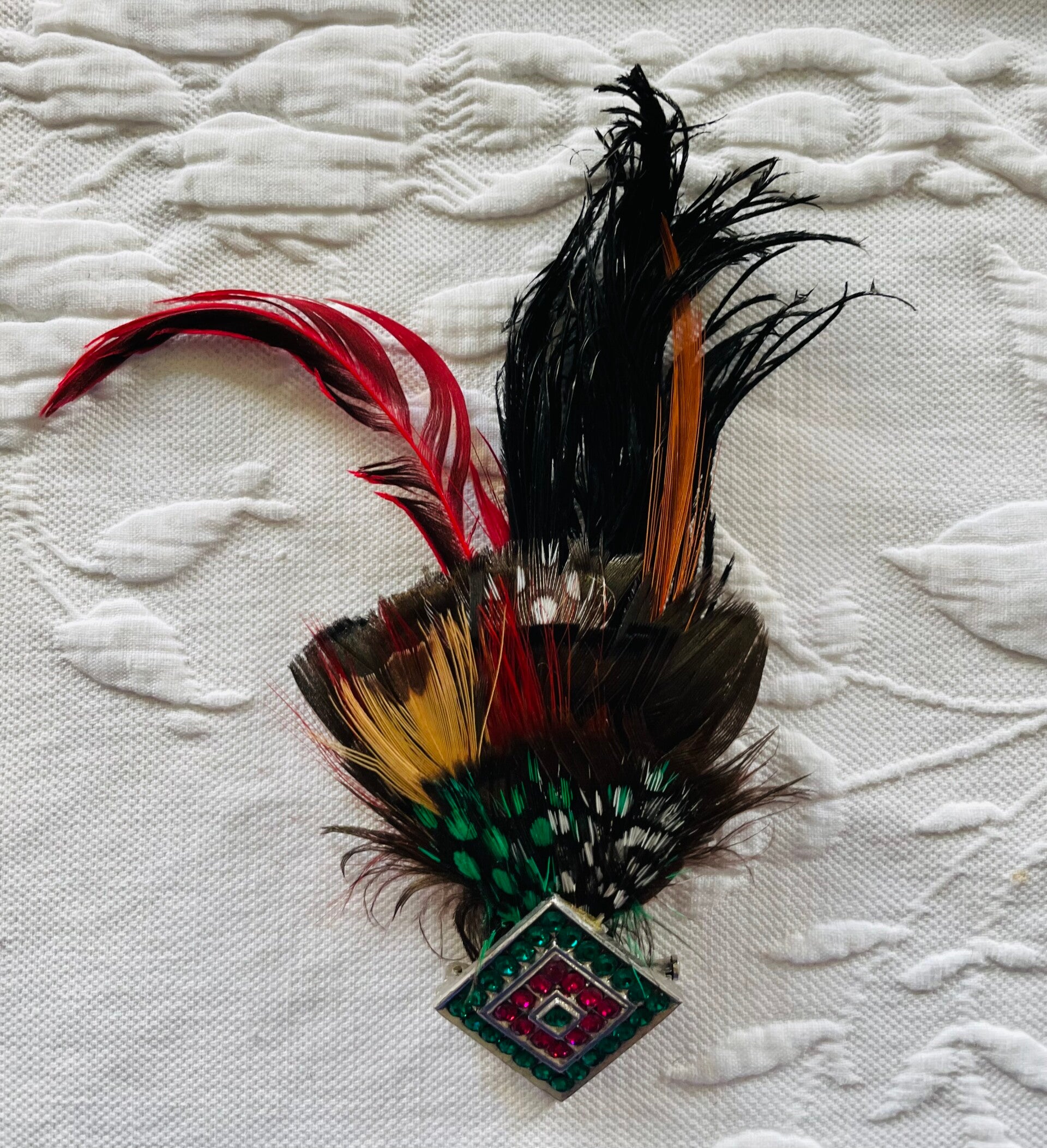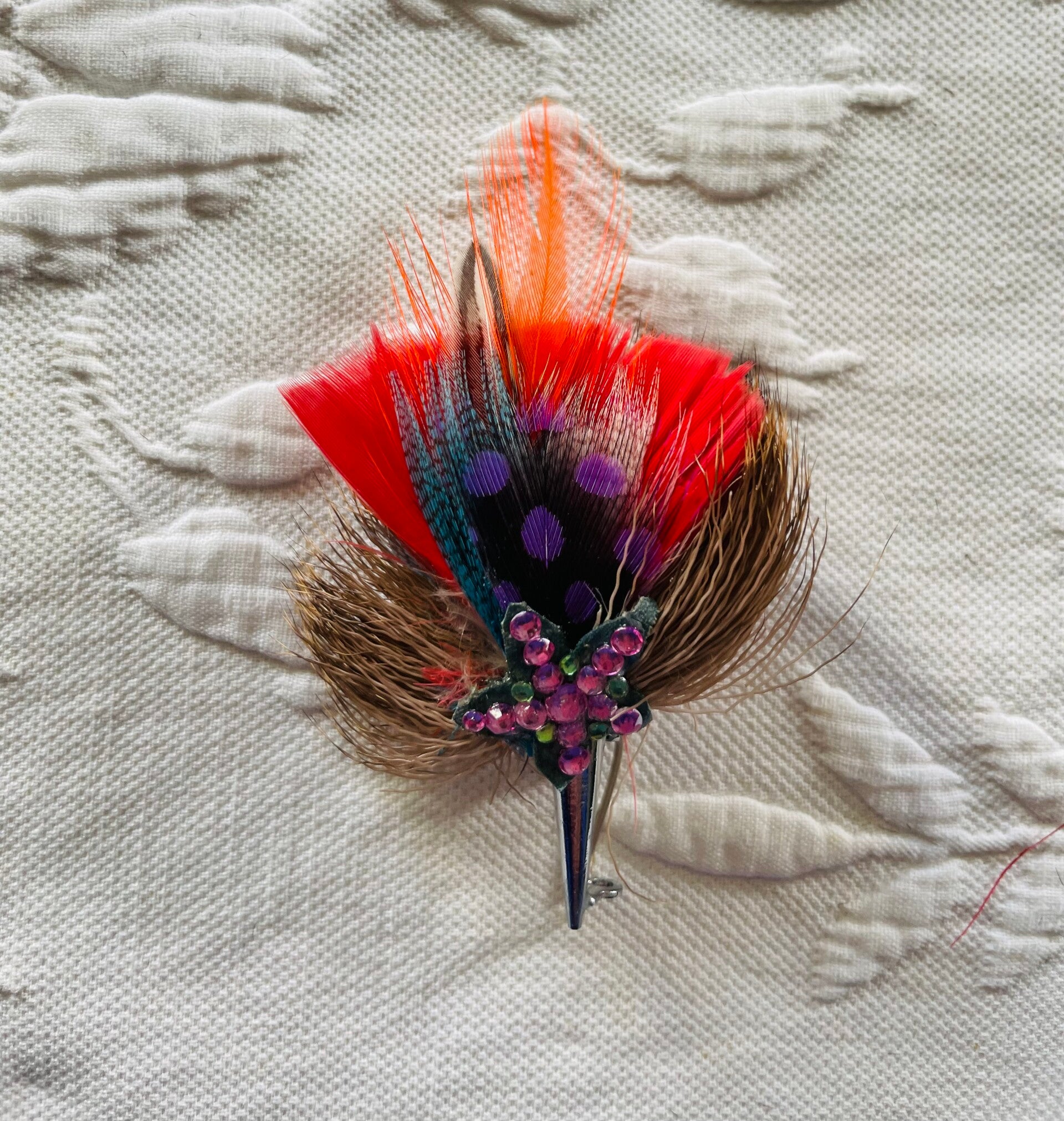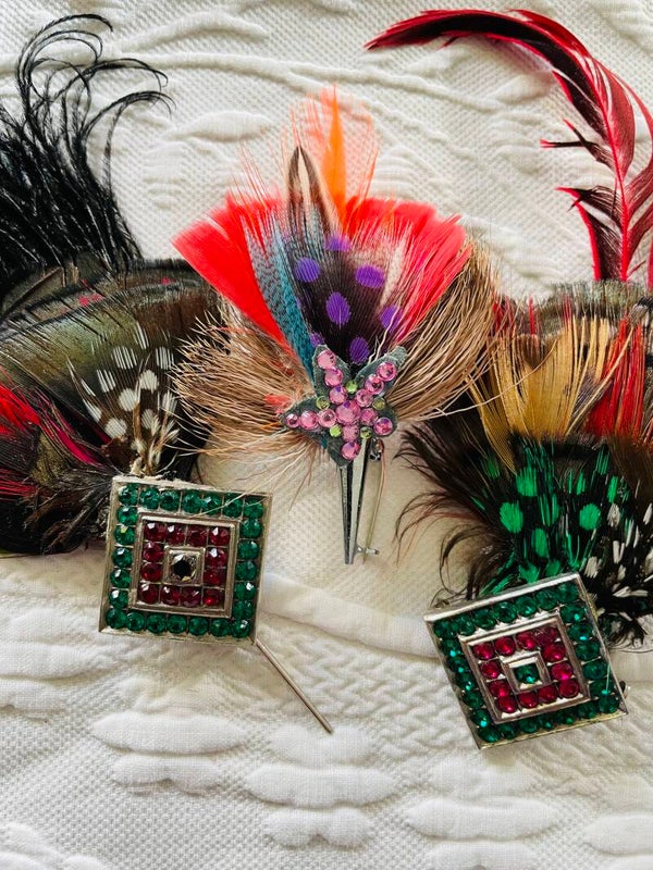 Trois broches originales en plumes et strass, faites pour égayer un chapeau, un revers de veste ou de robe.