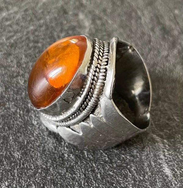 Tribal Chief’s ring, in silver and amber, handcrafted Afghanistan. Entirely made by hand, a silver circle placed between the mount and the stone representing a symbolic meaning of the manufacturer. Amber is known for its anti-inflammatory properties. Around 66 finger size - Gross weight 15 grs. Good state of preservation, and use, see the details in the photos. Will be shipped as gift packaging.