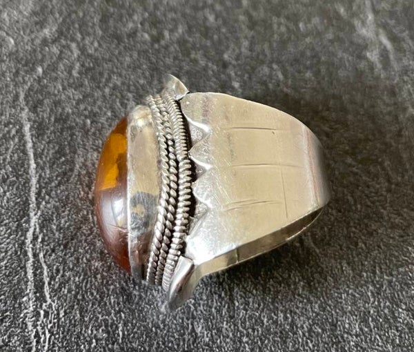 Bague de chef de Tribu, en argent et ambre, travail artisanal Afghanistan. Entièrement faite à la main, un cercle d’argent déposé entre la monture et la pierre représentant une signification symbolique du fabricant. L’ambre est connue pour ses propriétés anti inflammatoires. Tour de doigt 66 environ - Poids brut 15 grs. Bon état de conservation, et d’usage, voir les détails sur les photos. Sera expédié sous emballage cadeau.