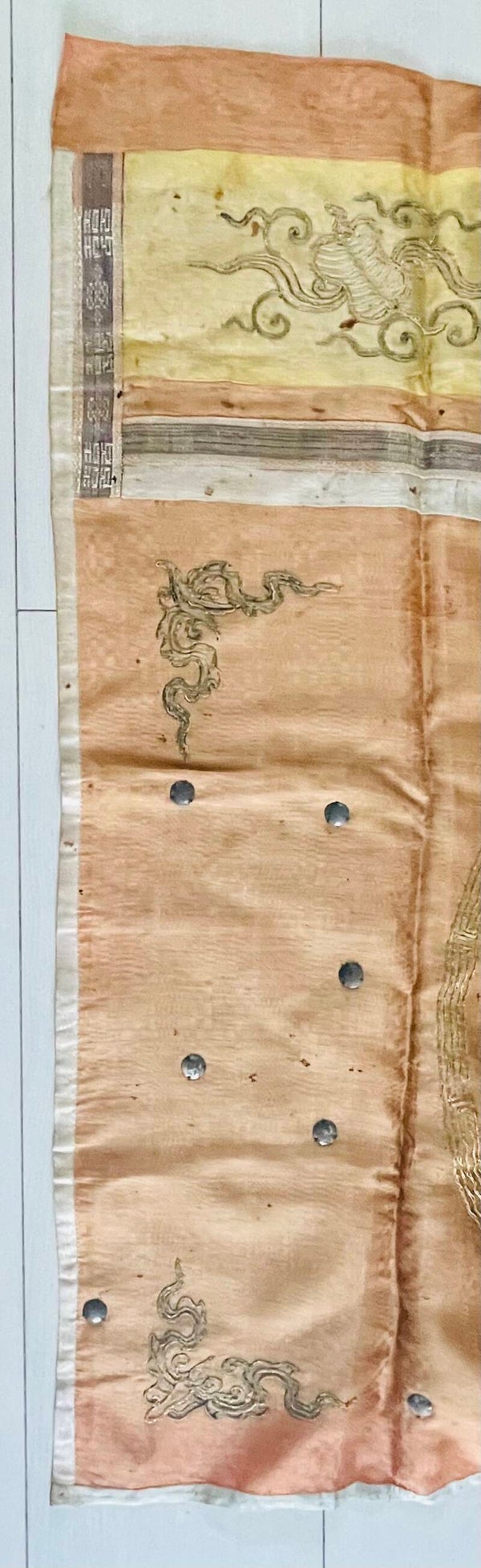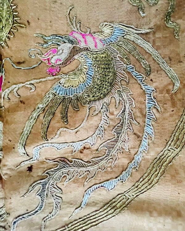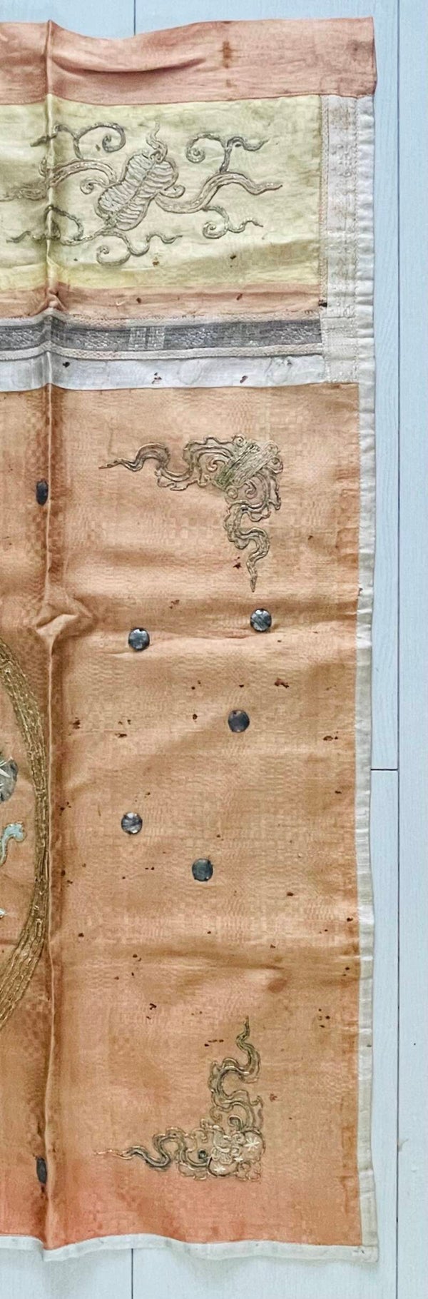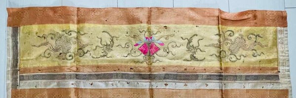 Ce panneau a vécu et traversé les ans. Il comporte plusieurs imperfections dans le tissu, petits trous, cependant les animaux célestes brodés au fil d’or et de couleurs sont en bon état. Bon état général de conservation, et d’usage, dans son jus, malgré quelques trous et usures dans le tissu, voir les détails sur les photos.