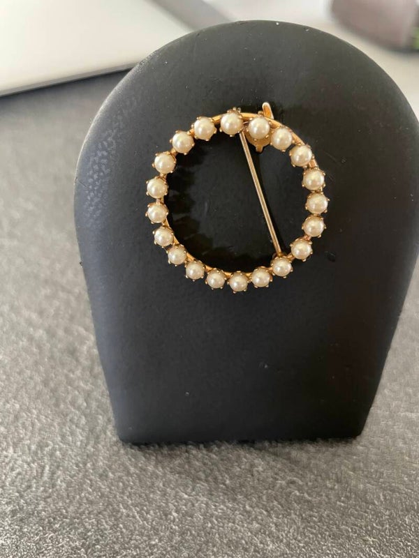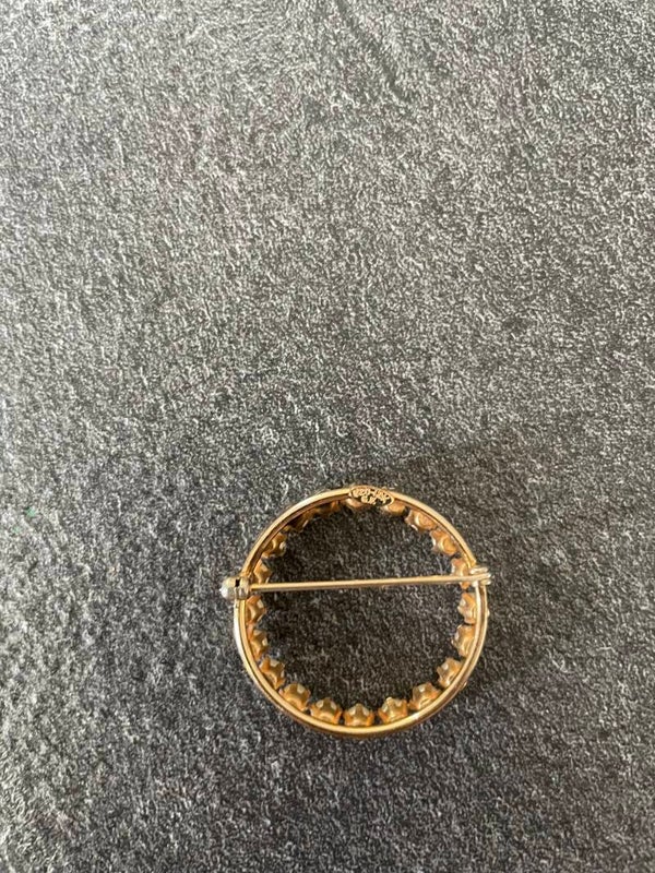 Circular brooch from the 1950s, in 12 carat gold and small old white pearls.