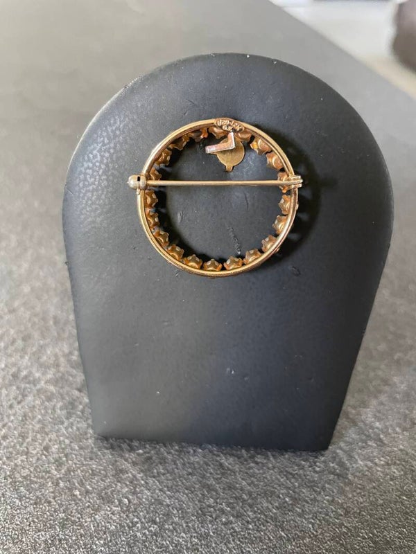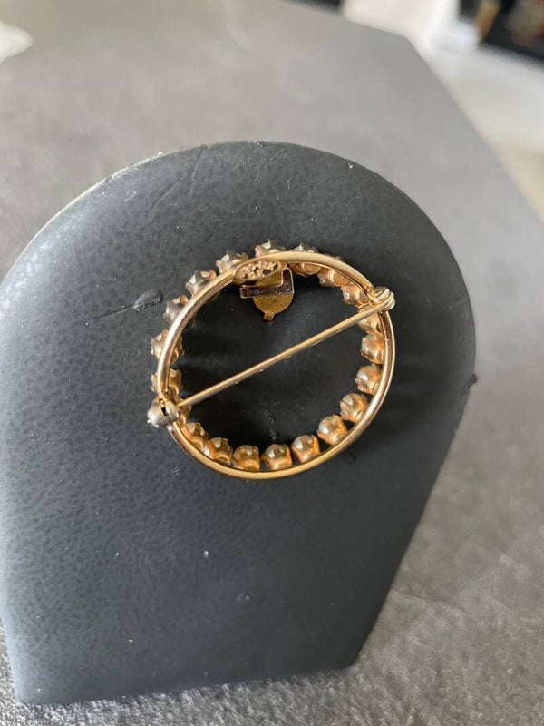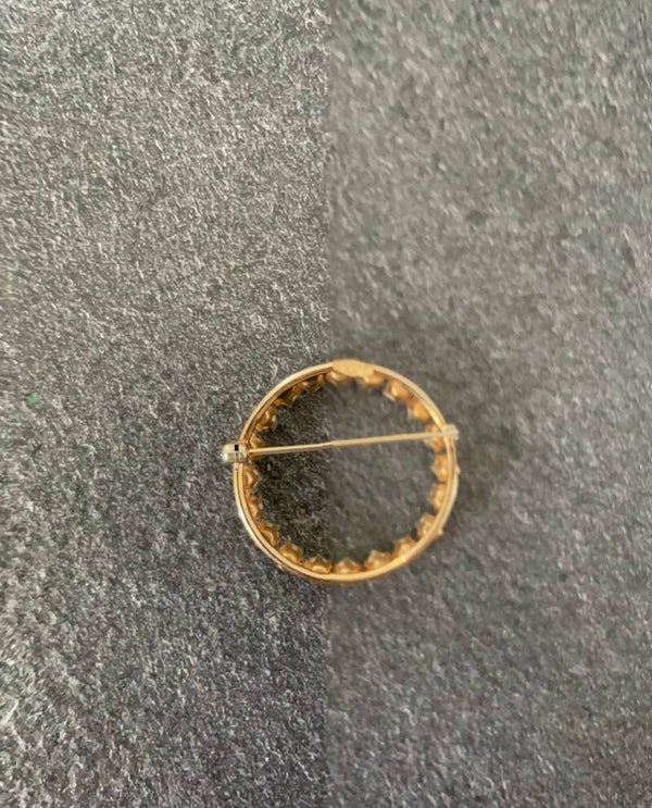 Broche circulaire des années 1950, en or 12 carats et petites perles anciennes.