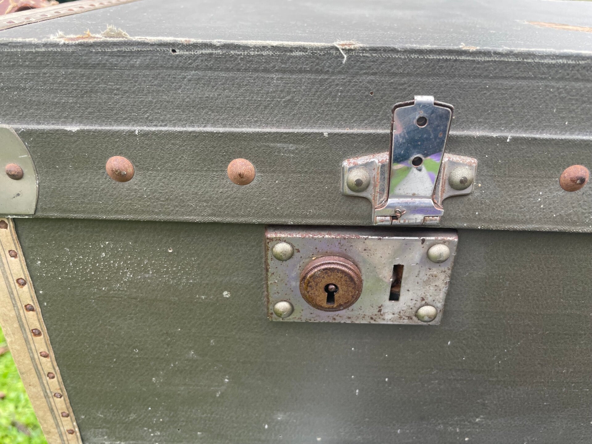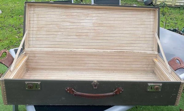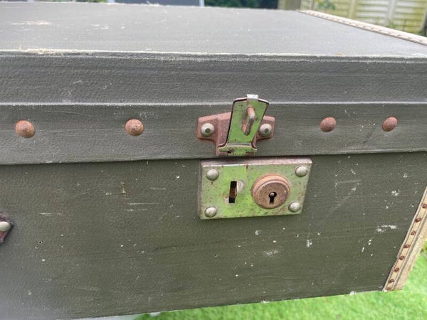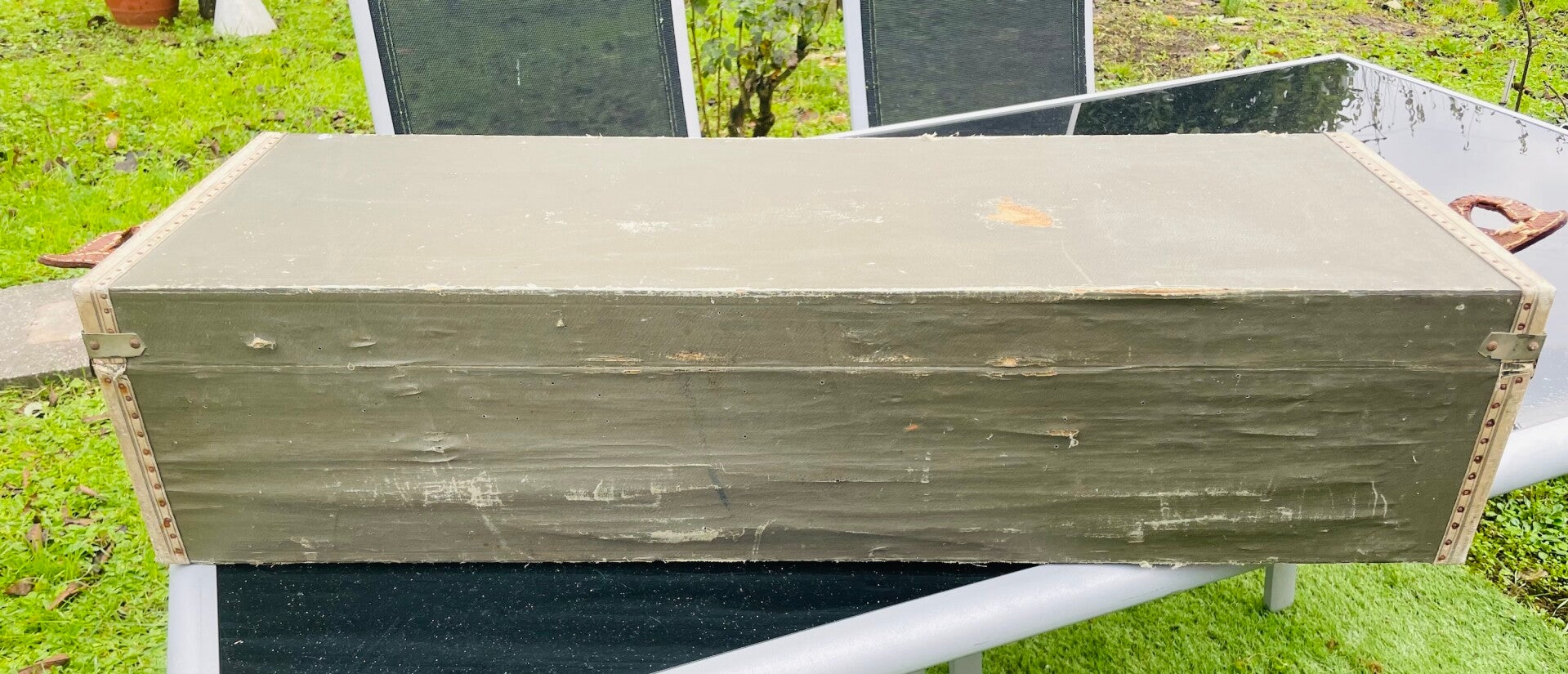 Rectangular wooden travel trunk covered with green coated canvas, with two compartments, lined in striped fabric. A first tray that can hold fine clothes and fragile accessories, and the other deeper one that can hold jackets, dresses, and others. Dimension: Closed trunk 92.5 X H. 21 x 33.5 cms. - Inner cotton straps present. Dimensions inner tray: Length 88 cms X Height 6 cms X Width 29 cms.